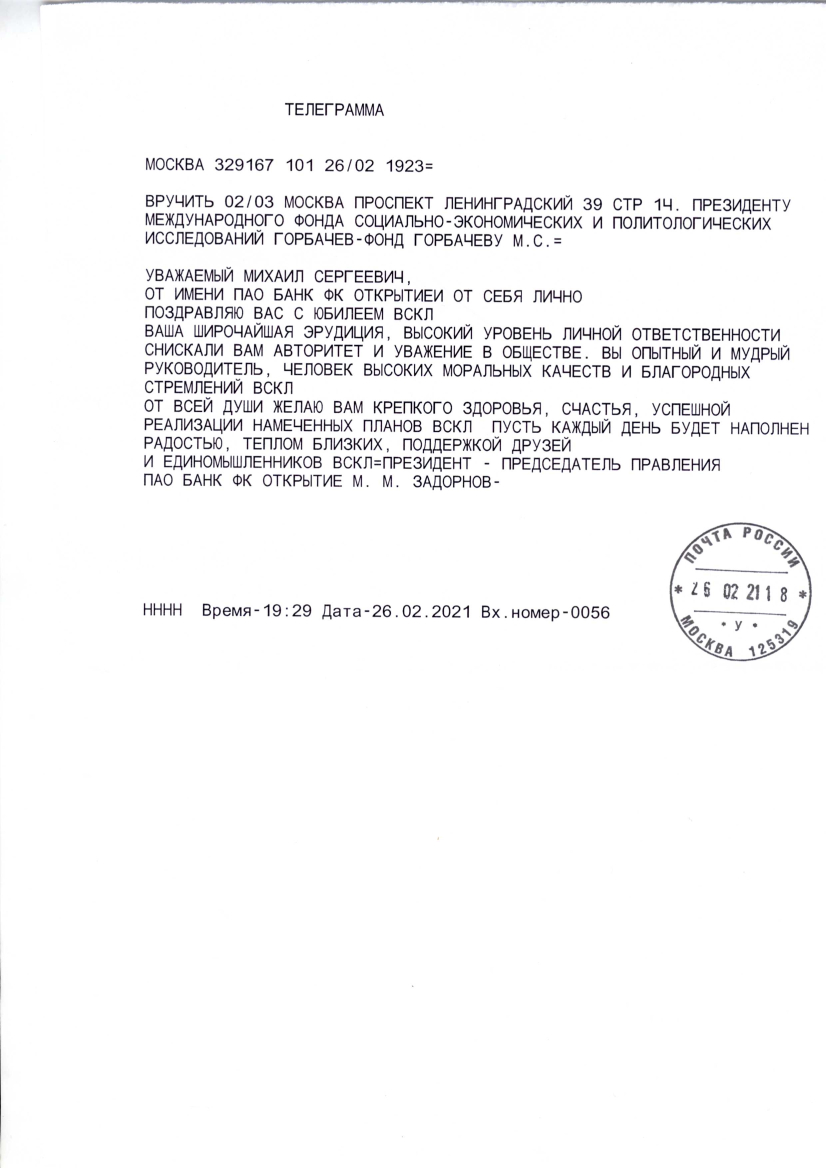 ![]() Поздравление председателя правления банка «ФК Открытие» Задорнова М.М.