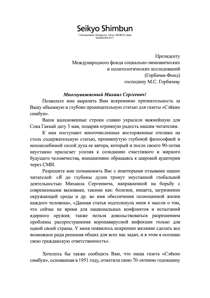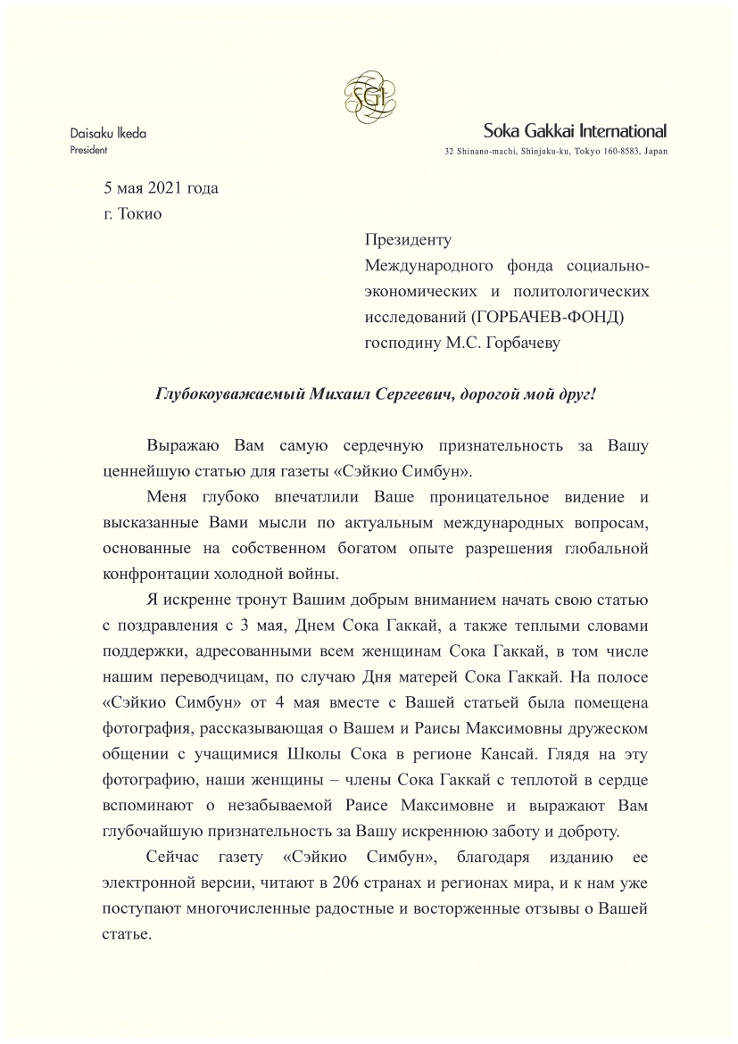 Прежде чем ответить на вопросы газеты «Сэйкио», я хотел бы поздравить вас всех со знаменательной датой – ровно 60 лет назад третьим президентом Сока Гаккай стал Дайсаку Икеда. Я знаю, как важен этот день для вас. Я желаю вам крепкого здоровья и новых успехов в вашей неустанной деятельности в области борьбы за мир, в области образования и духовного воспитания молодежи. В этой связи хочу привести одно известное высказывание: «Общество может считаться зрелым, если оно вырастило, подготовило себе смену». Это в полной мере относится к вашей организации, во многом благодаря мудрому руководству Дайсаку Икеды.
