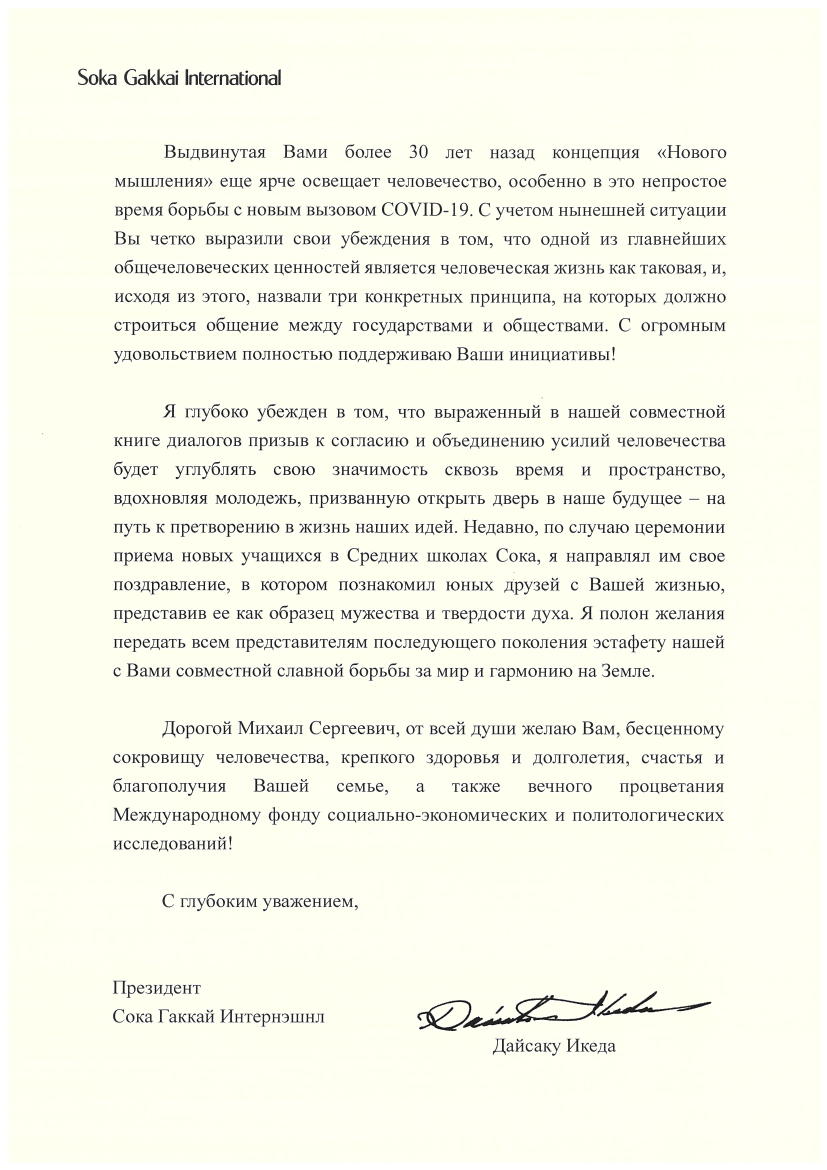 Благодарю руководство Университета Сока за теплое поздравление в связи с моим 90-летием.