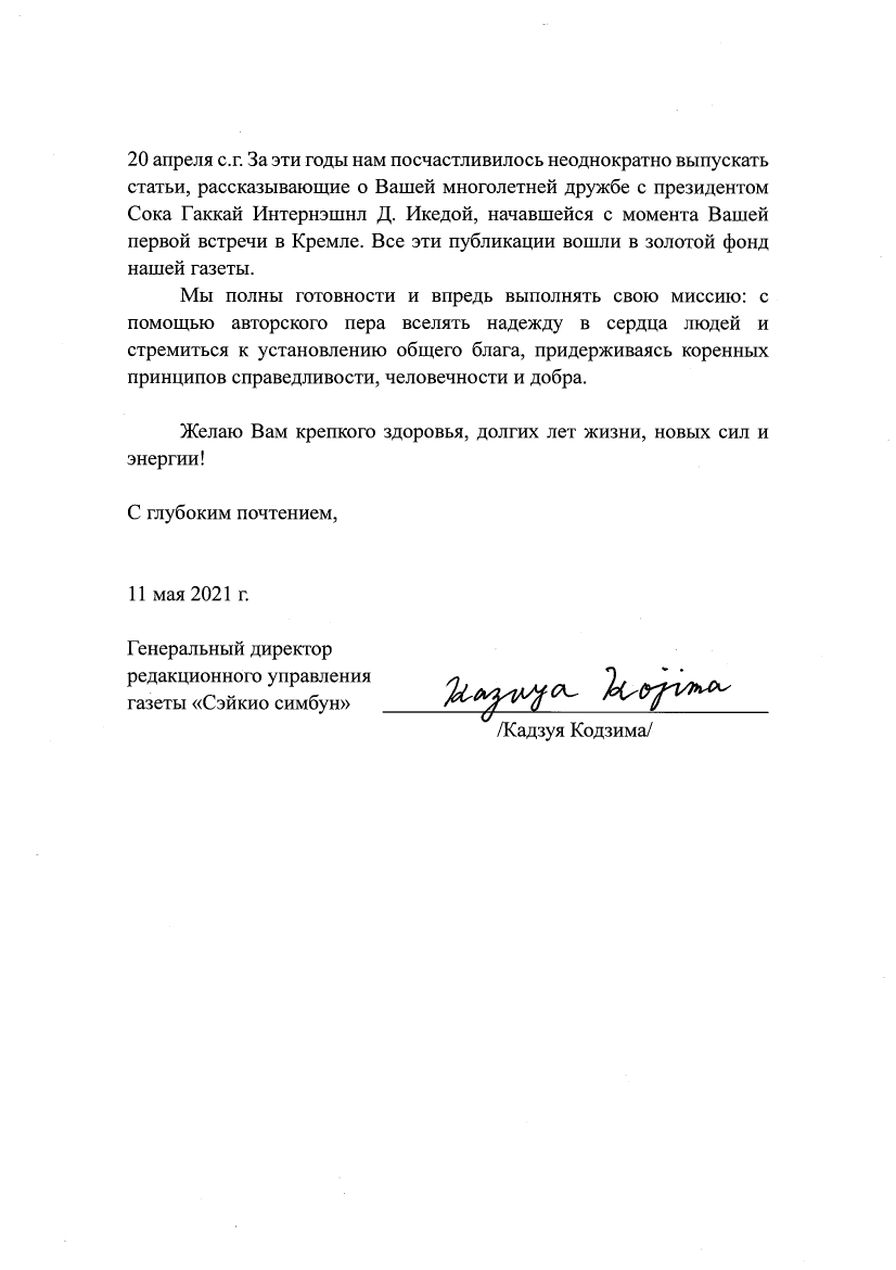 Поздравляя несколько лет назад моего друга Икеду с 90-летием, я писал, что во многом беру пример с него, в частности, я обязался догнать его по возрасту. Докладываю – обещание выполнил! Пользуясь случаем, хочу выразить искреннюю благодарность президенту за поздравление с моим 90-летием, за добрые слова и теплые пожелания, за подарки. Я теперь могу любоваться цветущей сакурой, потрясающими видами Японии, зафиксированными «золотым глазом» моего друга.
