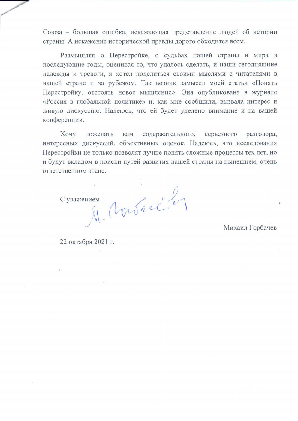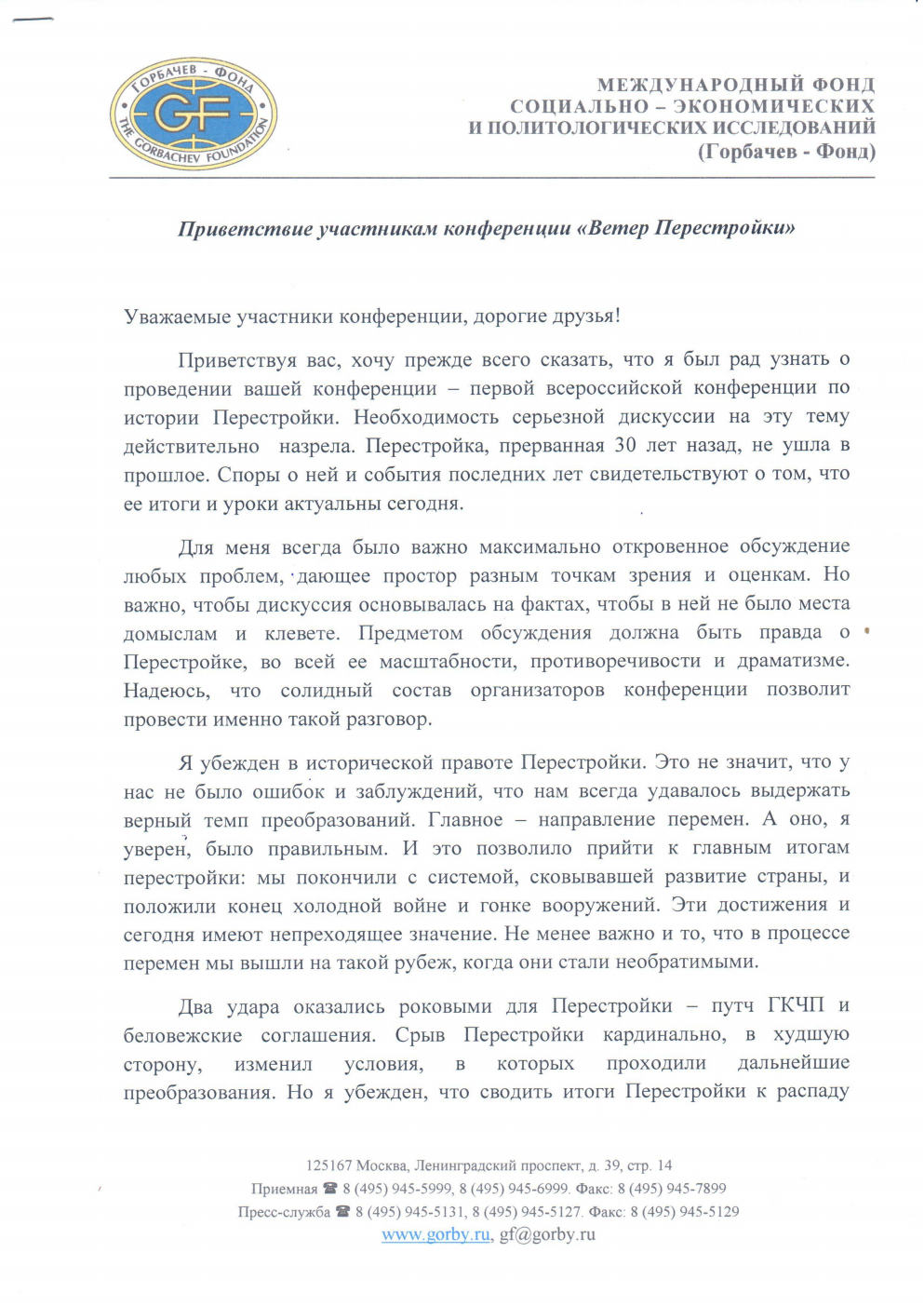 М.С.Горбачев направил приветствие участникам конференции «Ветер Перестройки»28-30 октября в Санкт-Петербурге при поддержке Института истории СПбГУ, Высшей Школы Экономики (Санкт-Петербург) и Музея политической истории России состоится первая Всероссийская конференция «Ветер Перестройки», посвященная проблемам изучения истории Перестройки. Помимо молодых ученых, в ней примут участие представители научно-педагогического состава различных организаций высшего образования России.