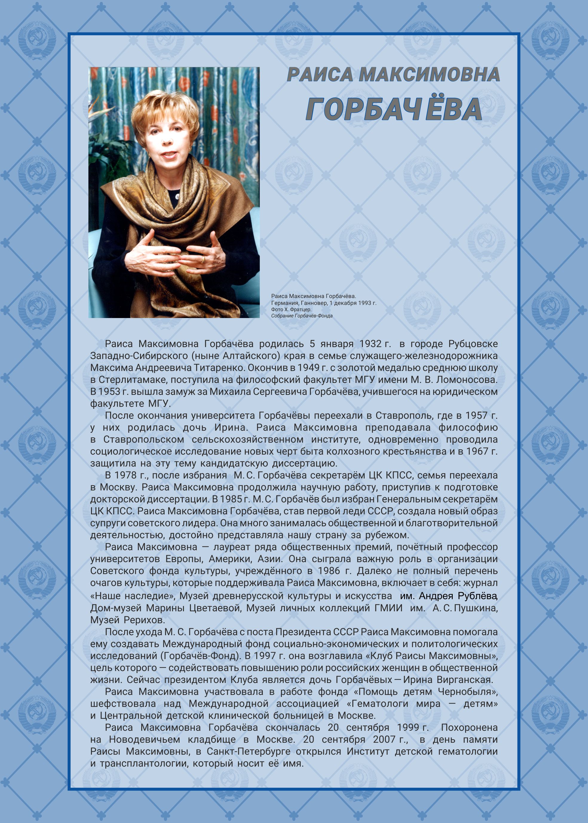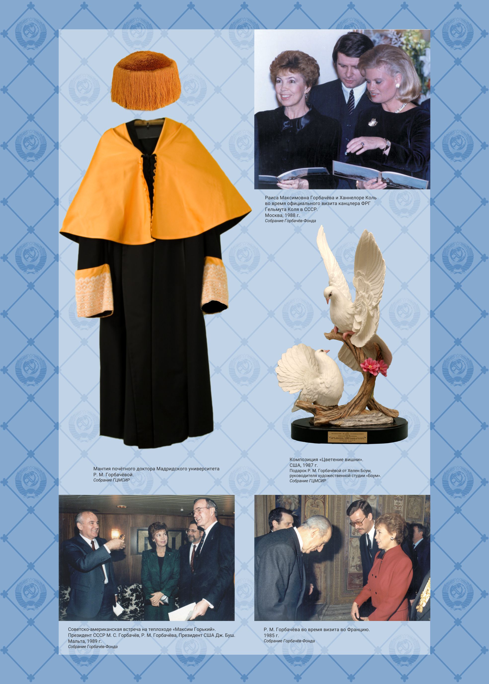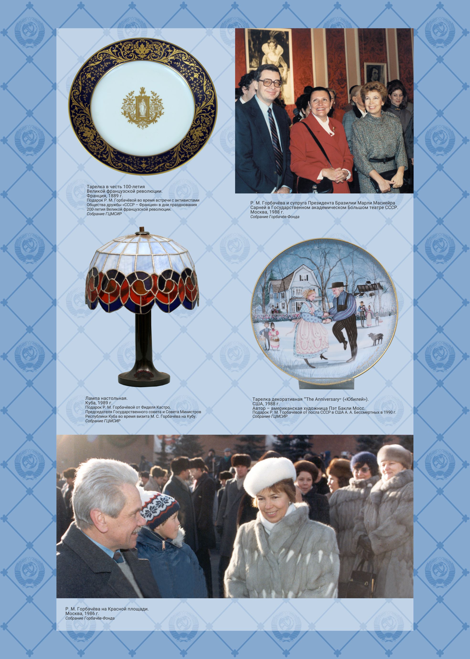 Редкие фото из собрания Горбачев-Фонда демонстрируют в регионах РоссииУникальные фотографии Раисы Горбачевой из коллекции Международного фонда социально-экономических и политологических исследований (Горбачев-Фонда) представлены в рамках планшетной выставки «Первые леди России XX века», организованной Государственным центральным музеем современной истории России (ГЦМСИР). Проект является передвижным, он стартовал в марте и уже успел порадовать зрителей в городах Улан-Удэ, Елабуга, Обнинск. Как отмечают кураторы выставки, именно благодаря тесному взаимодействию Горбачев-Фонда и ГЦМСИР удалось воссоздать наиболее полный и живой образ последней первой леди Советского Союза. Эта энергичная, с горящими глазами женщина прошла непростой жизненный путь и сформировала новый имидж супруги советского лидера, одна из главных миссий которой – развитие культурных и гуманитарных контактов как внутри страны, так и за рубежом. Она много занималась общественной и благотворительной деятельностью, достойно представляла нашу страну за границей. Раиса Максимовна предстает перед нами в роли тонкого дипломата, яркого общественного деятеля и просто жены, мамы и бабушки. Мы видим редкие кадры официальных встреч с первыми лицами и представителями творческой интеллигенции зарубежных государств – президентом США Джорджем Бушем (Мальта, 1989), супругой президента Бразилии Марли Сарней (Москва, 1988 год), итальянской актрисой Софи Лорен (Италия, 1989 год). Свидетельствами международного признания также являются подарки иностранных друзей (из собрания ГЦМСИР): настольная лампа, врученная Раисе Горбачевой Председателем Государственного совета Республики Куба Фиделем Кастро, кимоно и пояс оби от деятелей культуры Японии, мантия почетного доктора Мадридского университета, декоративная тарелка в честь 200-летия Великой Французской революции и другие. В связи с пандемией COVID-19 выставка проходит в планшетном и цифровом формате. Так, сотрудники Национального музея Республики Бурятия и Музея истории города Обнинска разместили материалы на своих официальных сайтах. Ну а в Елабужском государственном историко-архитектурном и художественном музее-заповеднике (Республика Татарстан) под планшетную выставку был выделен зал в библиотеке Серебряного века. За более чем месяц работы ее посетили 1 173 человека. Особый интерес у зрителей вызвала благотворительная деятельность первых леди и в особенности Раисы Горбачевой, которая, как известно, участвовала в работе фонда «Помощь детям Чернобыля», шефствовала над Международной ассоциацией «Гематологи мира – детям» и Центральной детской клинической больницей в Москве. В сентябре 2007 года в день памяти Раисы Максимовны в Санкт-Петербурге открылся Институт детской гематологии и трансплантологии, который носит ее имя. «Нашим зрительницам, несомненно, было приятно узнать тот факт, что все первые леди являлись настоящей опорой для своих мужей. После знакомства с представленными материалами у каждого посетителя возникало четкое понимание того, что быть супругой главы государства – очень ответственная обязанность. Все они достойно держали себя перед аудиторией, участвовали в официальных приемах, встречах на высшем уровне, культурной и общественной жизни страны», – отмечают сотрудники Елабужского музея-запо