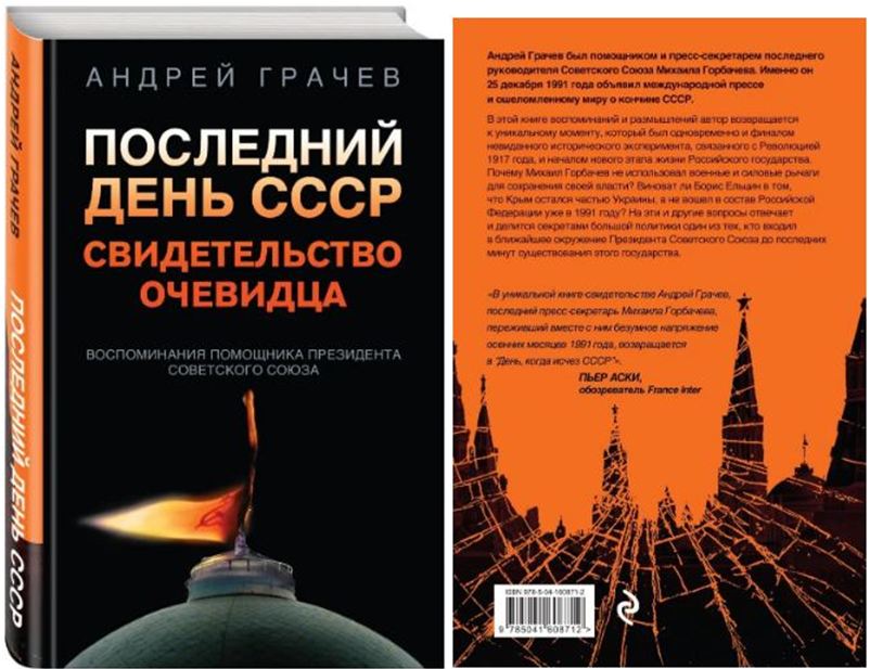 Вышла книга Андрея Грачева «Последний день СССР. Свидетельство Очевидца»В издательстве «Эксмо» вышла книга последнего пресс-секретаря Президента СССР Андрея Грачева «Последний день СССР. Свидетельство Очевидца». В ней автор размышляет о причинах распада Советского Союза, о политических силах и фигурах, способствовавших дезинтеграционным процессам.
