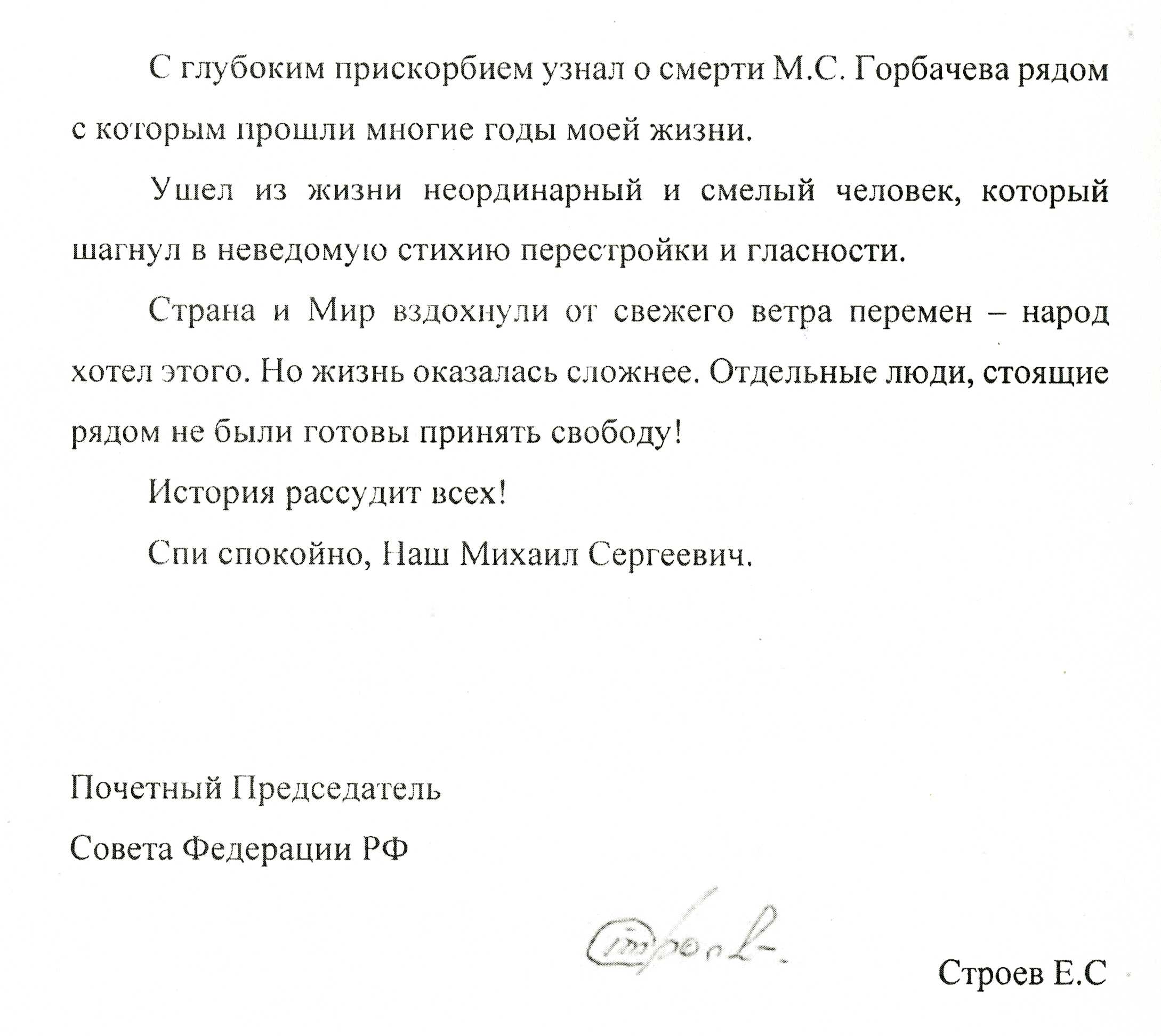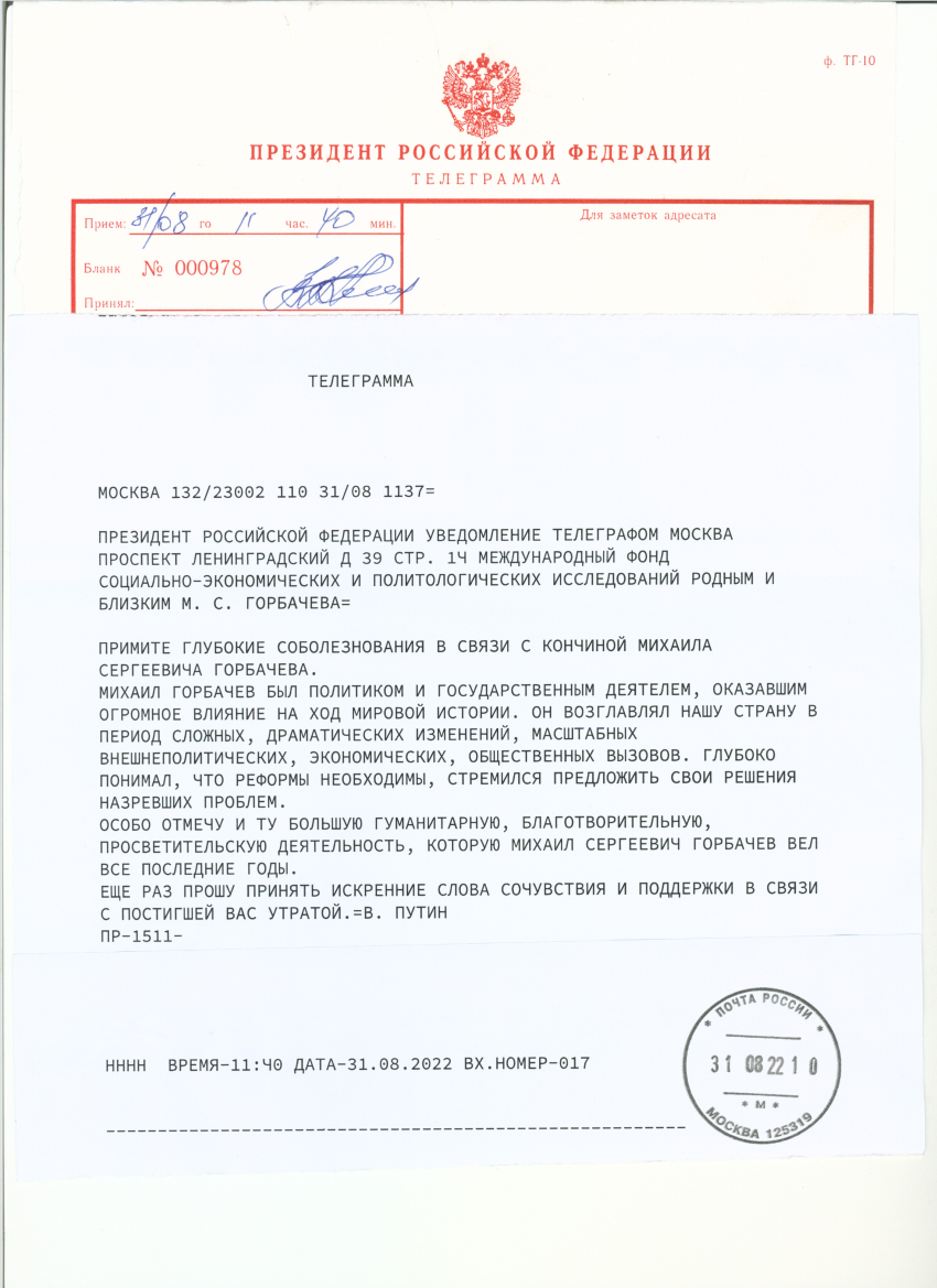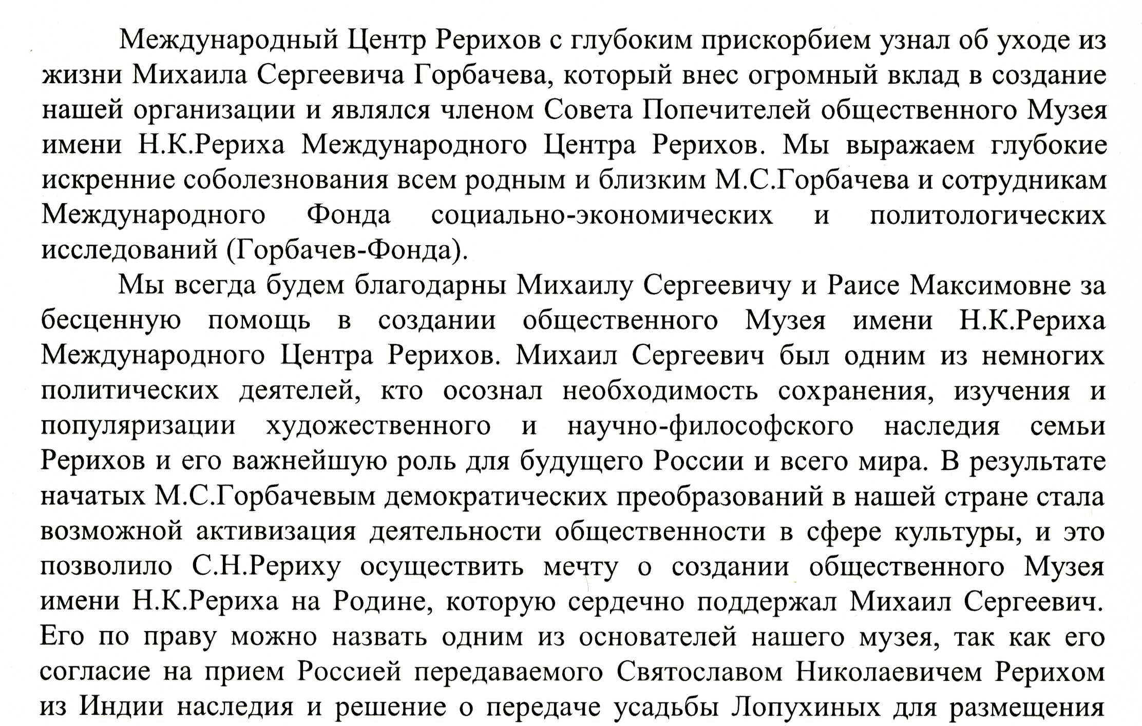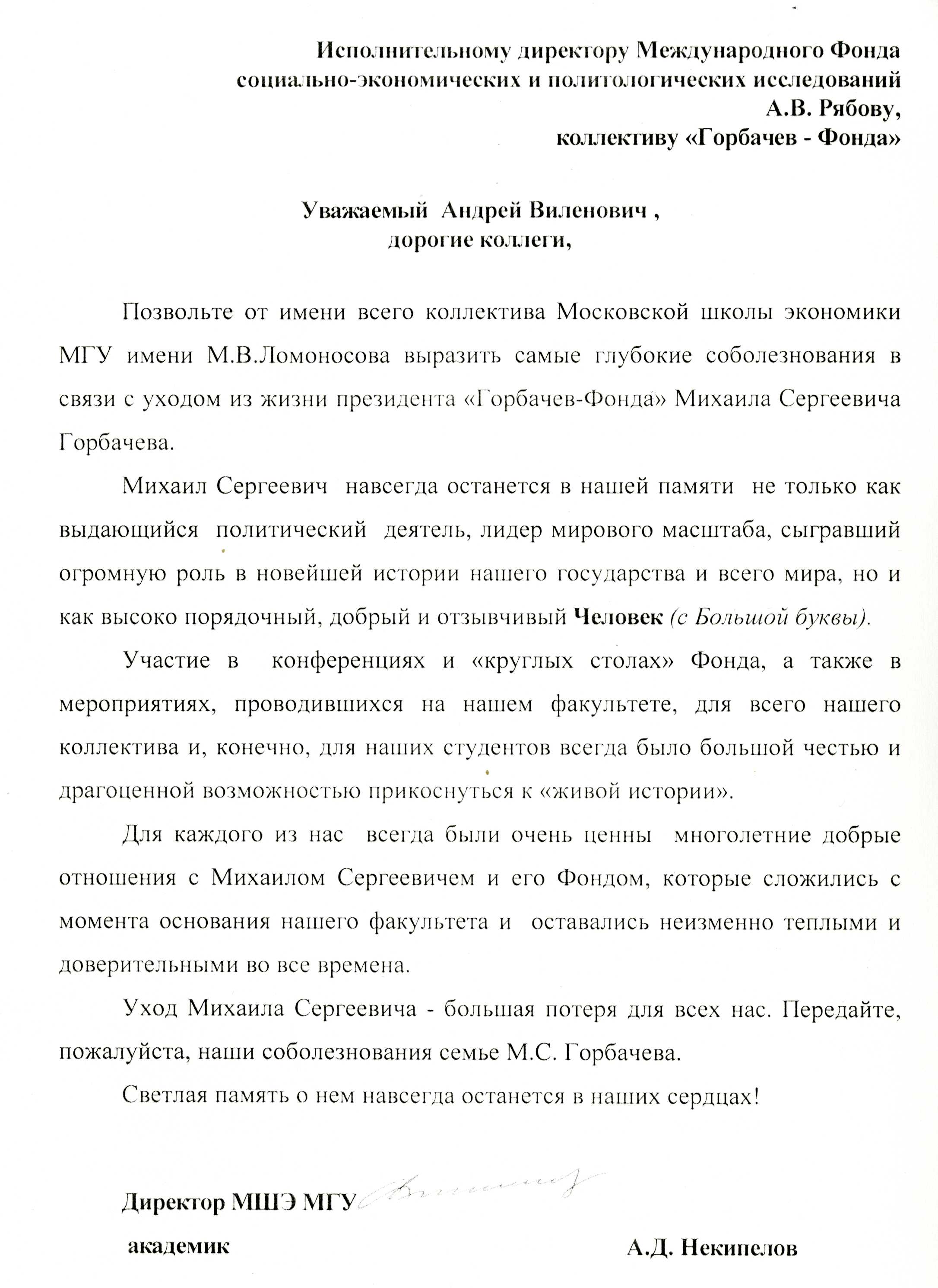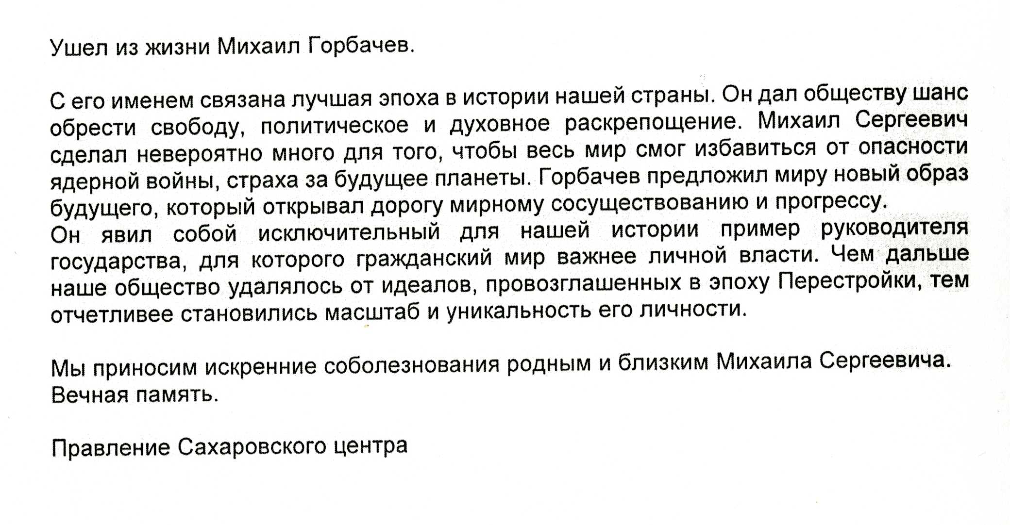 Памяти М.С. ГорбачеваУмер Михаил Сергеевич Горбачев. Для коллектива Горбачев-Фонда его уход – большое личное горе. Среди нас есть люди, работавшие с ним на протяжении десятилетий, есть те, кто присоединился к нам недавно. И всех нас объединяет не только понимание огромной роли , которую сыграл Михаил Сергеевич в истории России и мира, но и глубокое уважение к Горбачеву – человеку, уникальной личности. Человек, его свобода, его право самостоятельно строить свою жизнь – это то, ради чего Горбачев начал перестройку как политический и в то же время нравственный, гуманистический проект. Этим принципам он оставался верен на протяжении всей своей жизни. Чувство собственного достоинства сочеталось в нем с уважением к достоинству каждого человека. Общаясь с Михаилом Сергеевичем, мы видели, как близко к сердцу и нередко с болью он воспринимал все происходящее в стране и в мире. Это было еще одним испытанием среди многих в его жизни. Но он оставался оптимистом. Он верил в будущее России, верил в то, что будущее мира – не распри и войны, а сотрудничество, совместный поиск ответов на проблемы человечества. Мы выражаем глубокое соболезнование дочери Михаила Сергеевича – Ирине, всей его семье. Уверены, что светлая память об этом великом человеке сохранится в истории и в умах людей. Будем делать всё, чтобы так и было. Коллектив Горбачев-Фонда