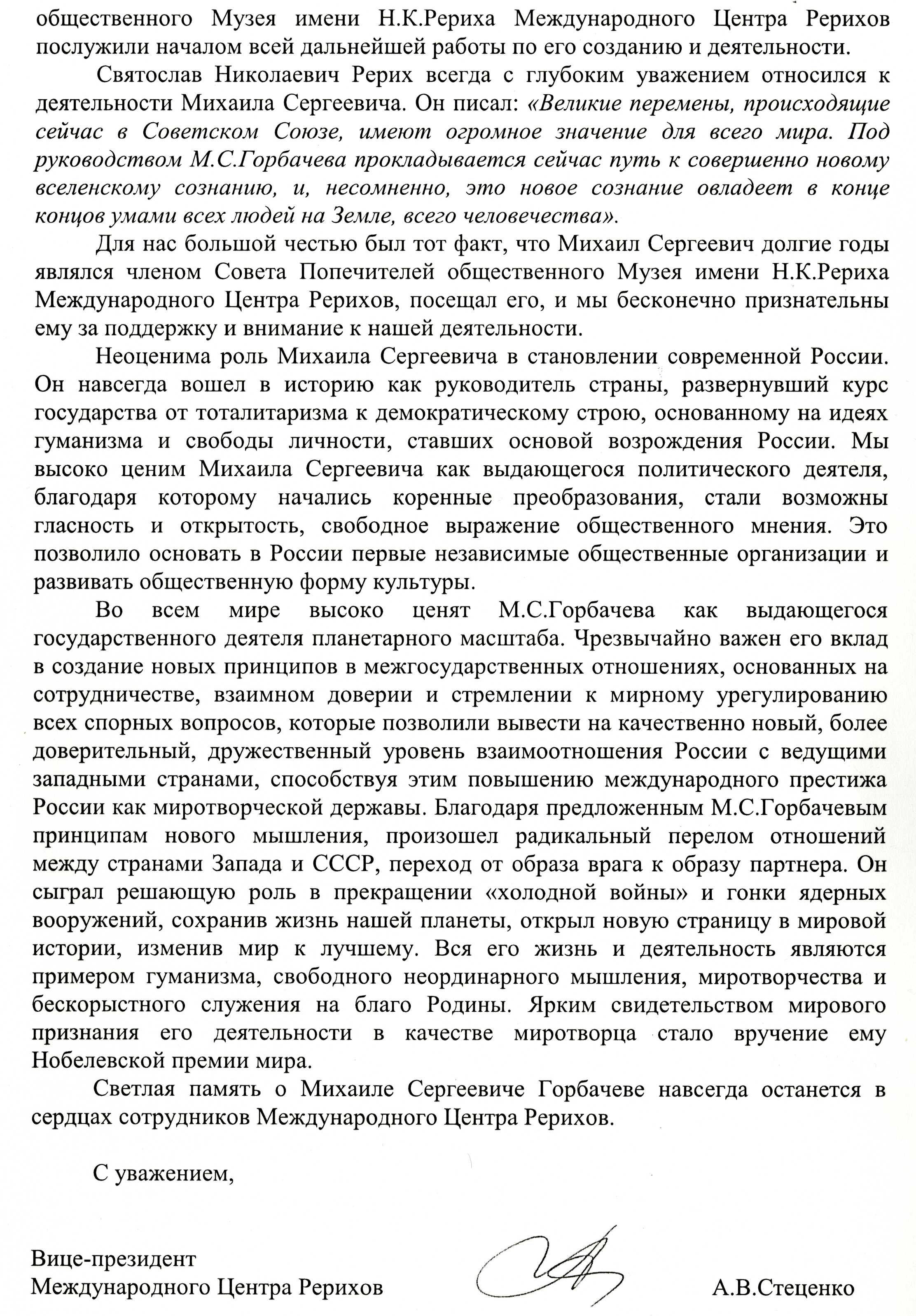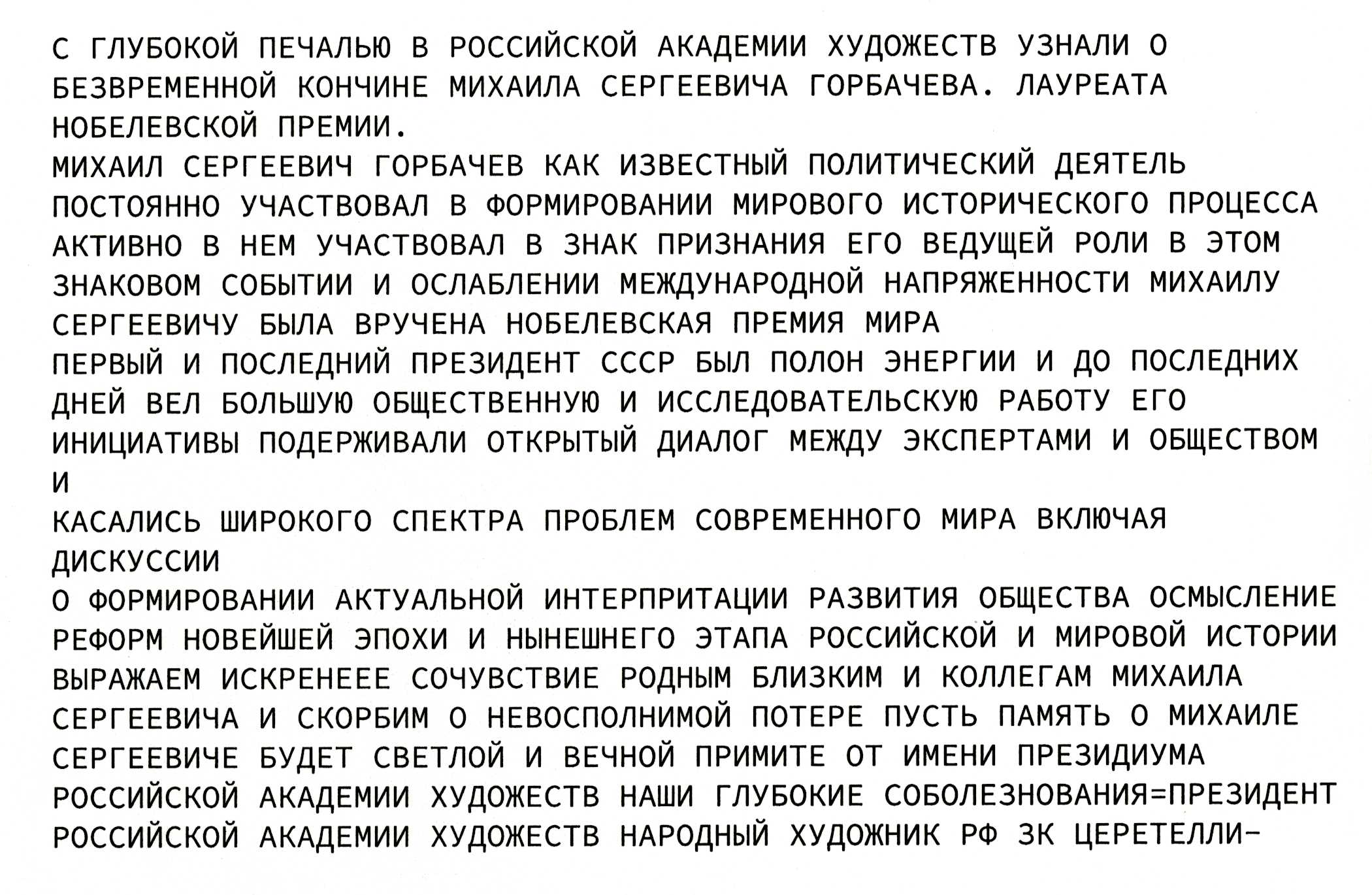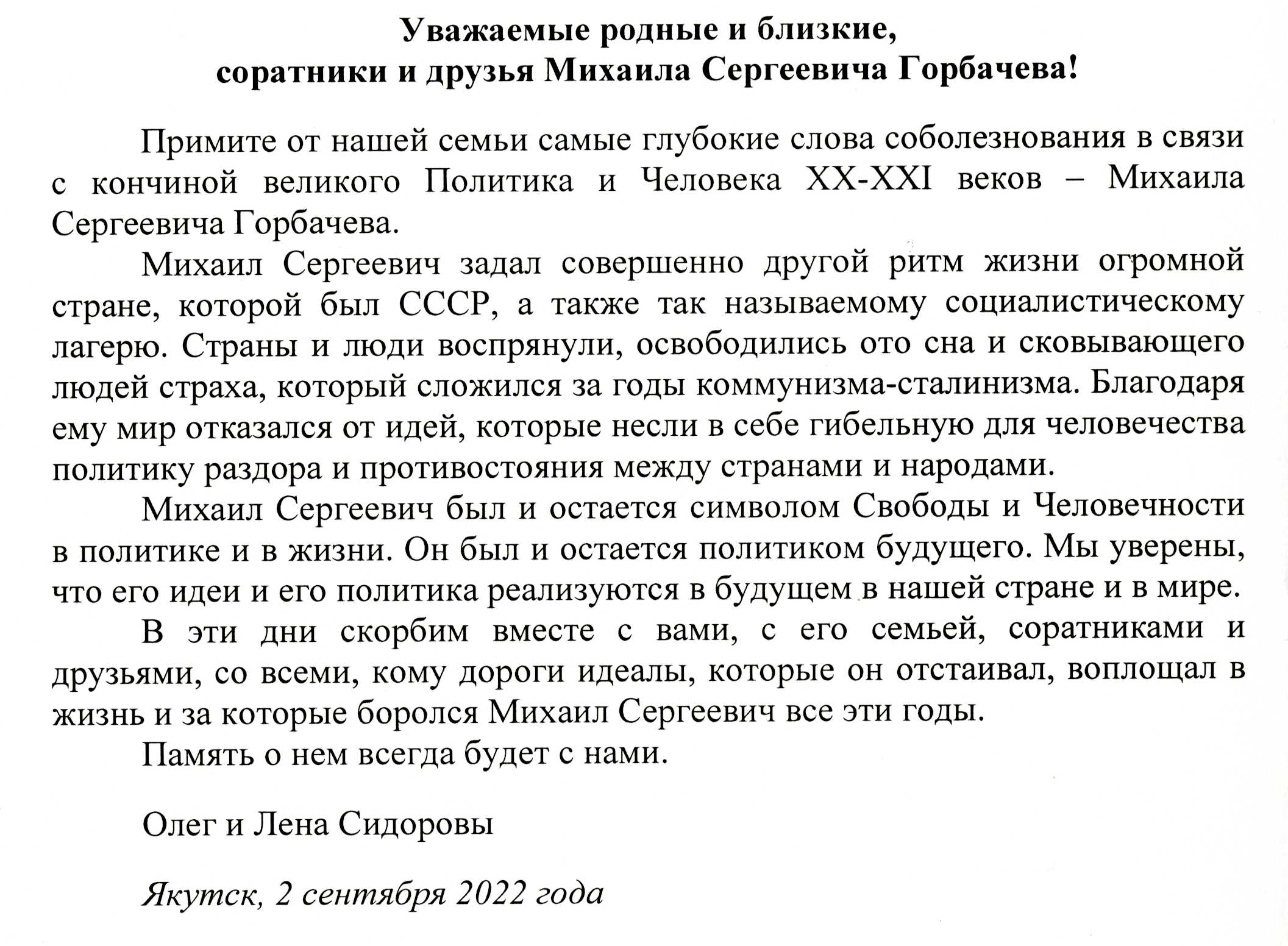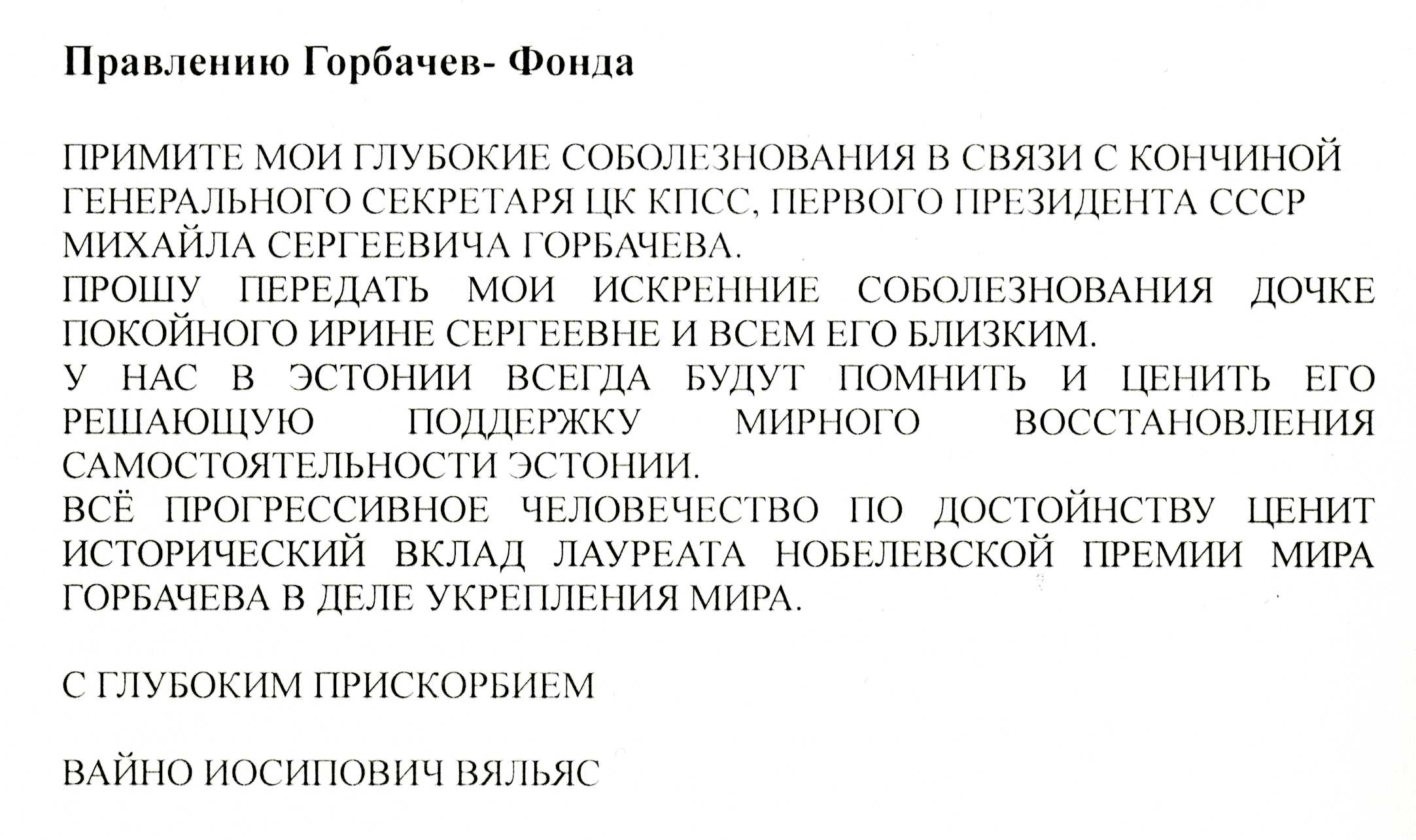 Памяти М.С. ГорбачеваУмер Михаил Сергеевич Горбачев. Для коллектива Горбачев-Фонда его уход – большое личное горе. Среди нас есть люди, работавшие с ним на протяжении десятилетий, есть те, кто присоединился к нам недавно. И всех нас объединяет не только понимание огромной роли , которую сыграл Михаил Сергеевич в истории России и мира, но и глубокое уважение к Горбачеву – человеку, уникальной личности. Человек, его свобода, его право самостоятельно строить свою жизнь – это то, ради чего Горбачев начал перестройку как политический и в то же время нравственный, гуманистический проект. Этим принципам он оставался верен на протяжении всей своей жизни. Чувство собственного достоинства сочеталось в нем с уважением к достоинству каждого человека. Общаясь с Михаилом Сергеевичем, мы видели, как близко к сердцу и нередко с болью он воспринимал все происходящее в стране и в мире. Это было еще одним испытанием среди многих в его жизни. Но он оставался оптимистом. Он верил в будущее России, верил в то, что будущее мира – не распри и войны, а сотрудничество, совместный поиск ответов на проблемы человечества. Мы выражаем глубокое соболезнование дочери Михаила Сергеевича – Ирине, всей его семье. Уверены, что светлая память об этом великом человеке сохранится в истории и в умах людей. Будем делать всё, чтобы так и было. Коллектив Горбачев-Фонда