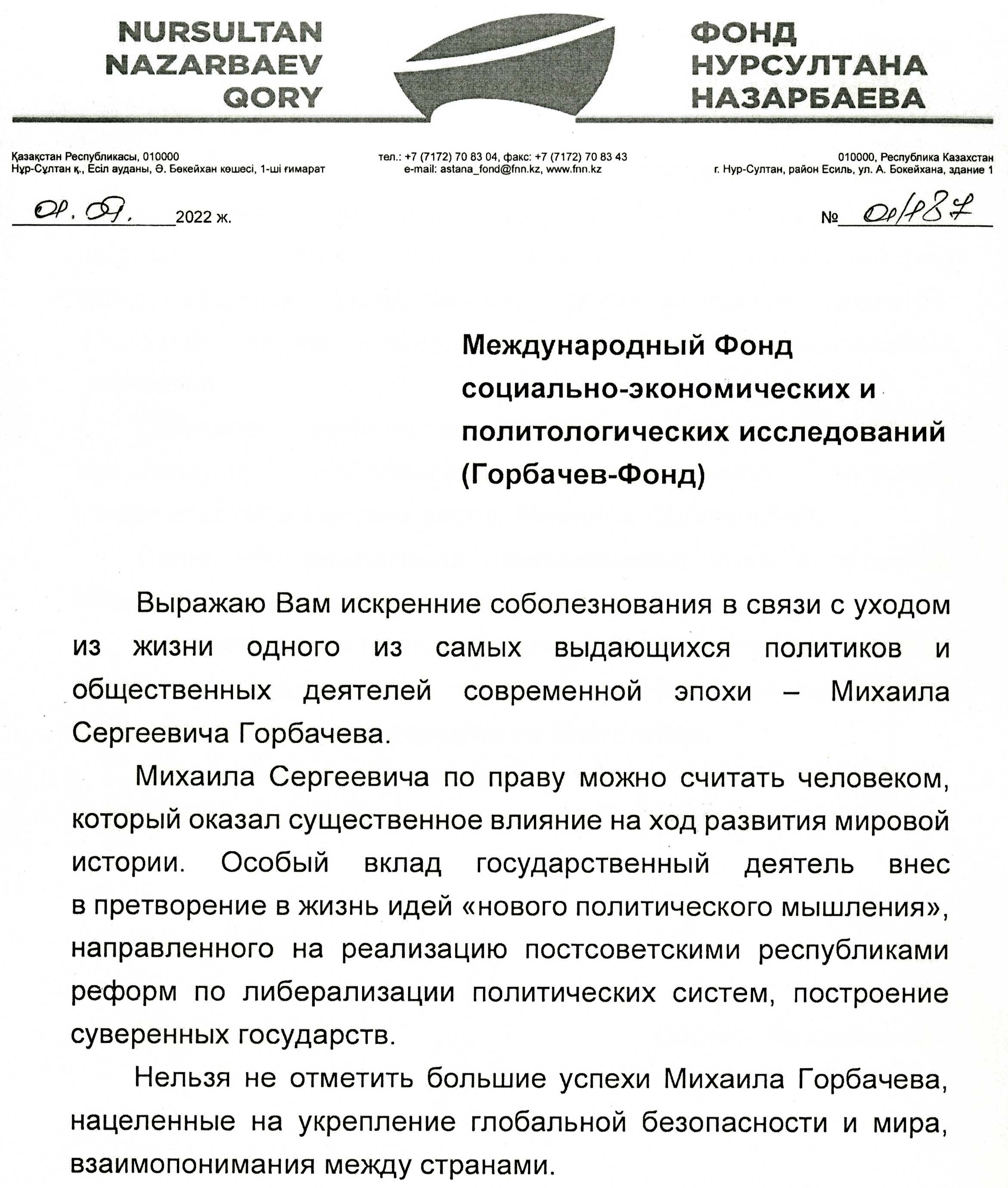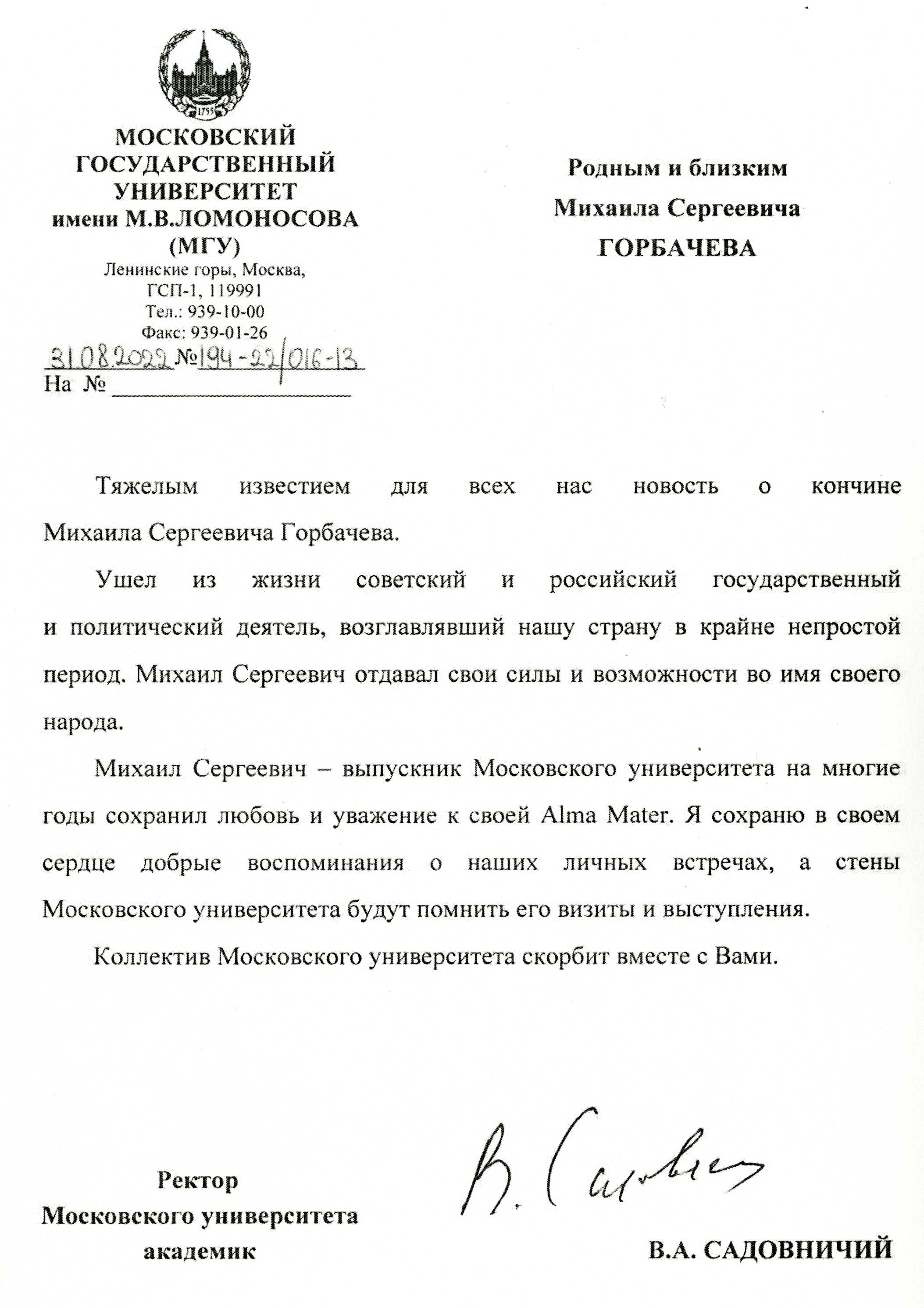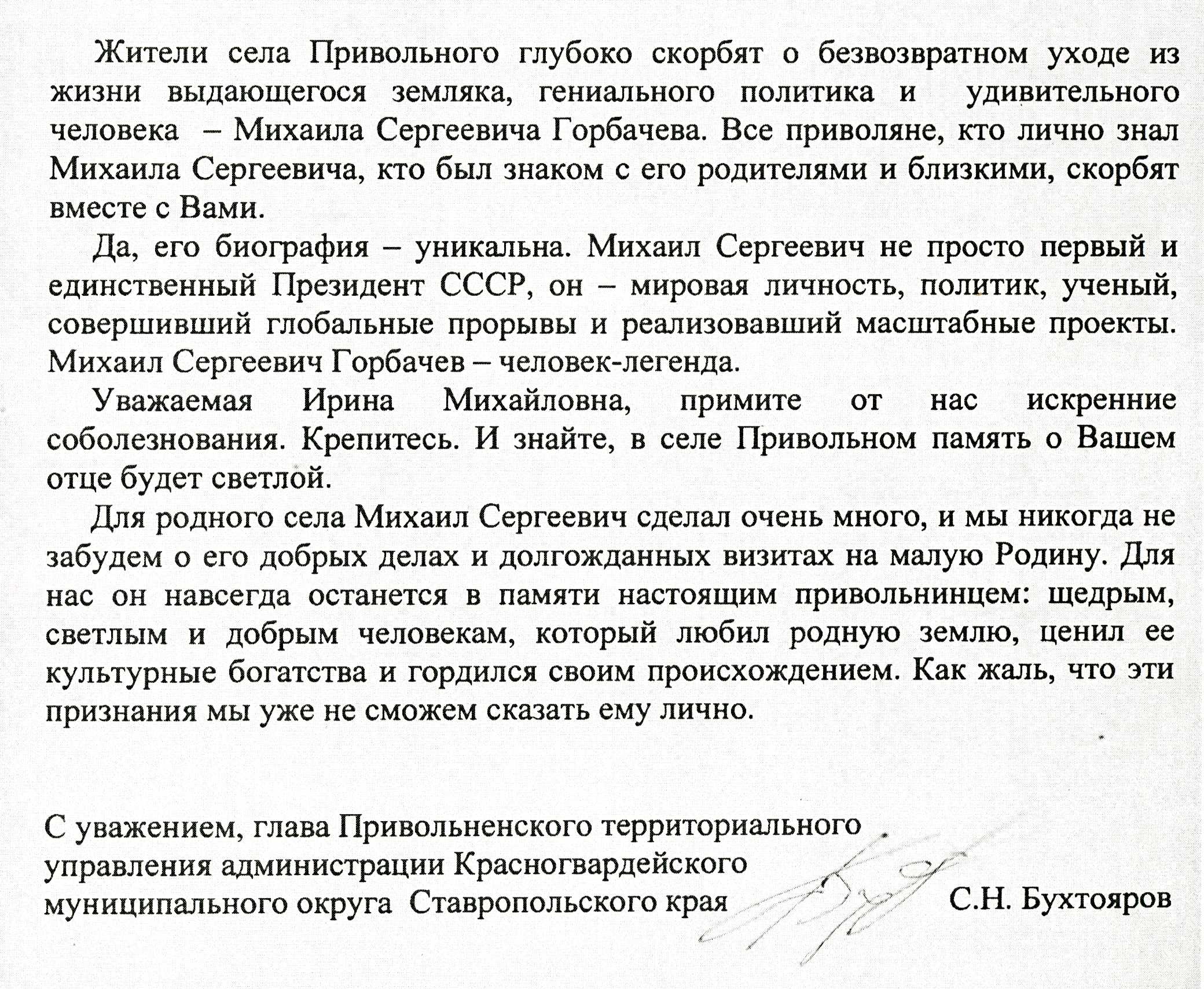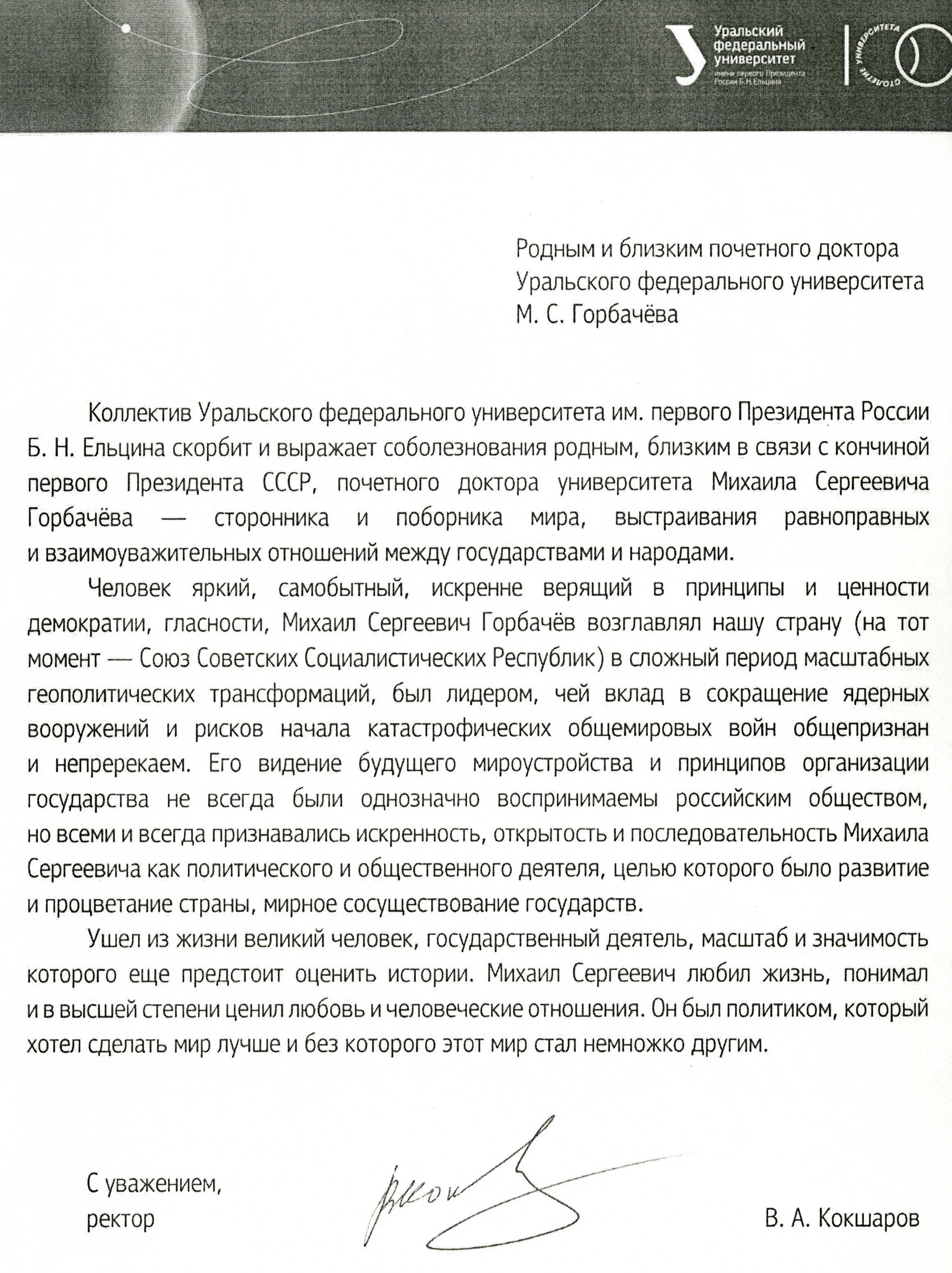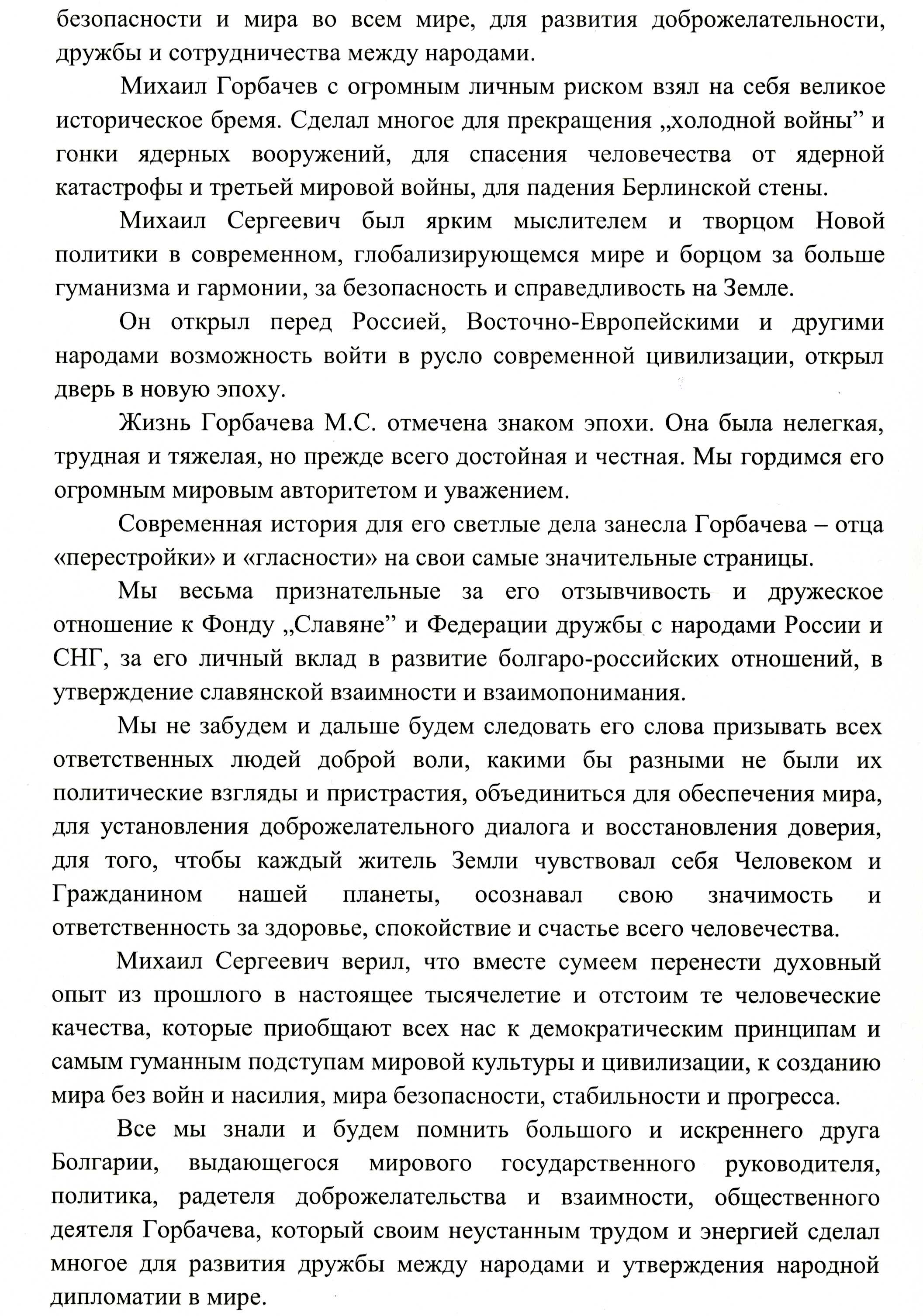 Памяти М.С. ГорбачеваУмер Михаил Сергеевич Горбачев. Для коллектива Горбачев-Фонда его уход – большое личное горе. Среди нас есть люди, работавшие с ним на протяжении десятилетий, есть те, кто присоединился к нам недавно. И всех нас объединяет не только понимание огромной роли , которую сыграл Михаил Сергеевич в истории России и мира, но и глубокое уважение к Горбачеву – человеку, уникальной личности. Человек, его свобода, его право самостоятельно строить свою жизнь – это то, ради чего Горбачев начал перестройку как политический и в то же время нравственный, гуманистический проект. Этим принципам он оставался верен на протяжении всей своей жизни. Чувство собственного достоинства сочеталось в нем с уважением к достоинству каждого человека. Общаясь с Михаилом Сергеевичем, мы видели, как близко к сердцу и нередко с болью он воспринимал все происходящее в стране и в мире. Это было еще одним испытанием среди многих в его жизни. Но он оставался оптимистом. Он верил в будущее России, верил в то, что будущее мира – не распри и войны, а сотрудничество, совместный поиск ответов на проблемы человечества. Мы выражаем глубокое соболезнование дочери Михаила Сергеевича – Ирине, всей его семье. Уверены, что светлая память об этом великом человеке сохранится в истории и в умах людей. Будем делать всё, чтобы так и было. Коллектив Горбачев-Фонда