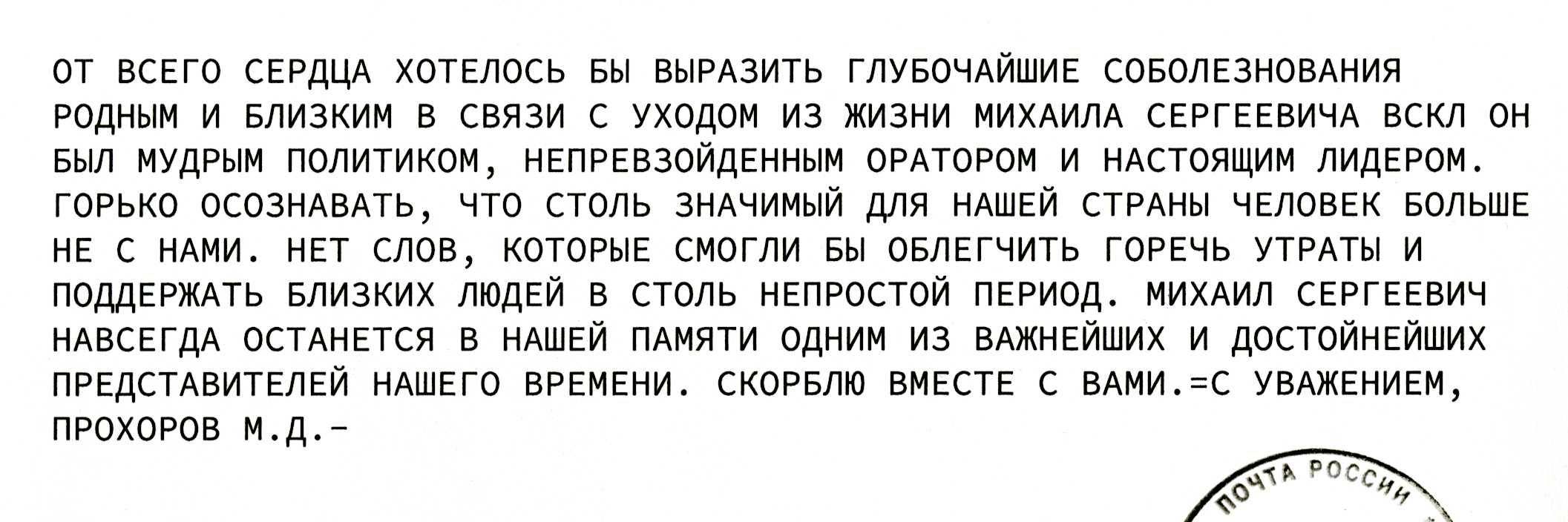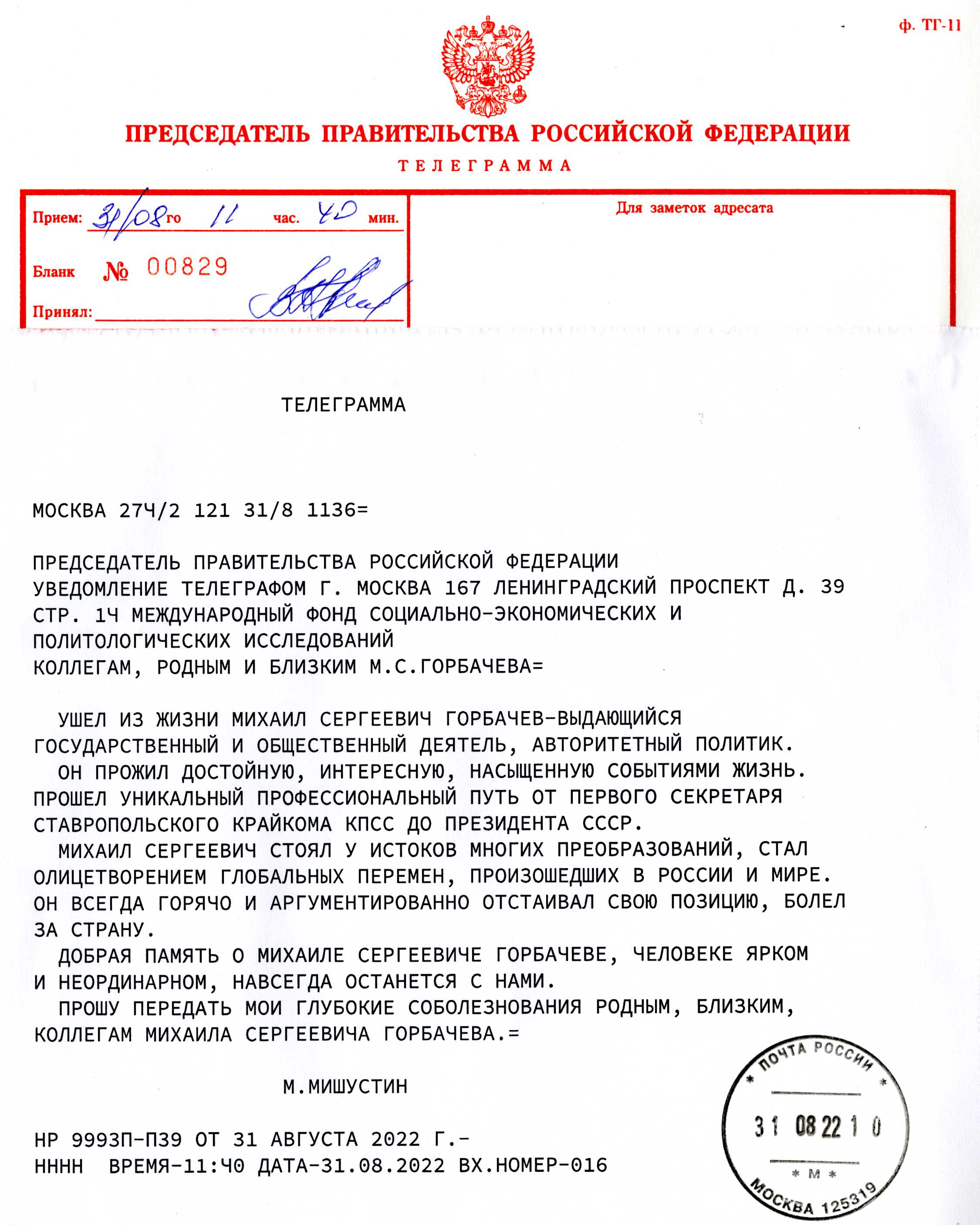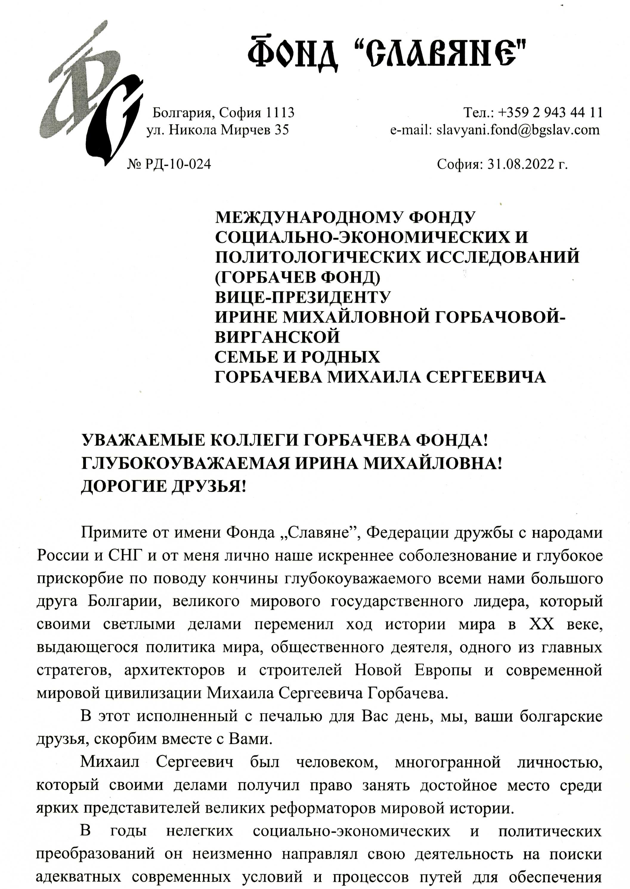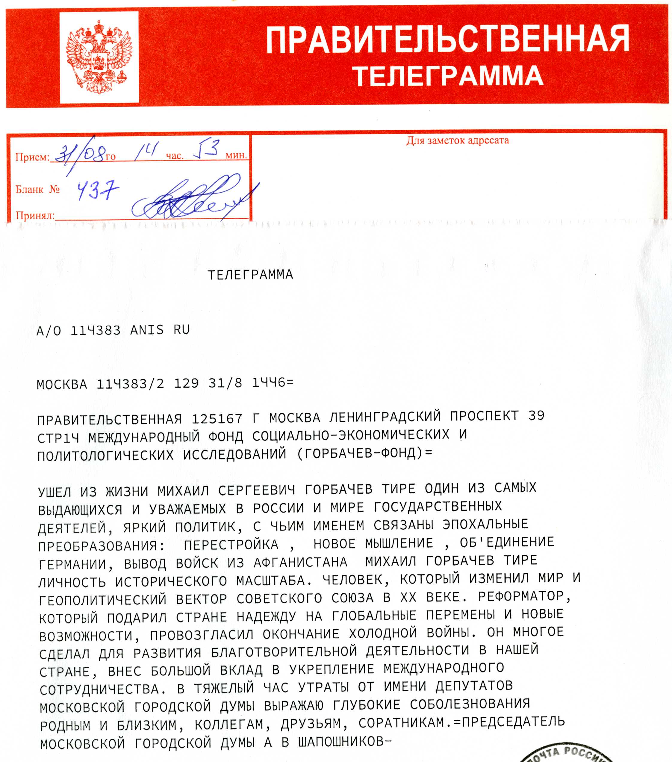 Памяти М.С. ГорбачеваУмер Михаил Сергеевич Горбачев. Для коллектива Горбачев-Фонда его уход – большое личное горе. Среди нас есть люди, работавшие с ним на протяжении десятилетий, есть те, кто присоединился к нам недавно. И всех нас объединяет не только понимание огромной роли , которую сыграл Михаил Сергеевич в истории России и мира, но и глубокое уважение к Горбачеву – человеку, уникальной личности. Человек, его свобода, его право самостоятельно строить свою жизнь – это то, ради чего Горбачев начал перестройку как политический и в то же время нравственный, гуманистический проект. Этим принципам он оставался верен на протяжении всей своей жизни. Чувство собственного достоинства сочеталось в нем с уважением к достоинству каждого человека. Общаясь с Михаилом Сергеевичем, мы видели, как близко к сердцу и нередко с болью он воспринимал все происходящее в стране и в мире. Это было еще одним испытанием среди многих в его жизни. Но он оставался оптимистом. Он верил в будущее России, верил в то, что будущее мира – не распри и войны, а сотрудничество, совместный поиск ответов на проблемы человечества. Мы выражаем глубокое соболезнование дочери Михаила Сергеевича – Ирине, всей его семье. Уверены, что светлая память об этом великом человеке сохранится в истории и в умах людей. Будем делать всё, чтобы так и было. Коллектив Горбачев-Фонда