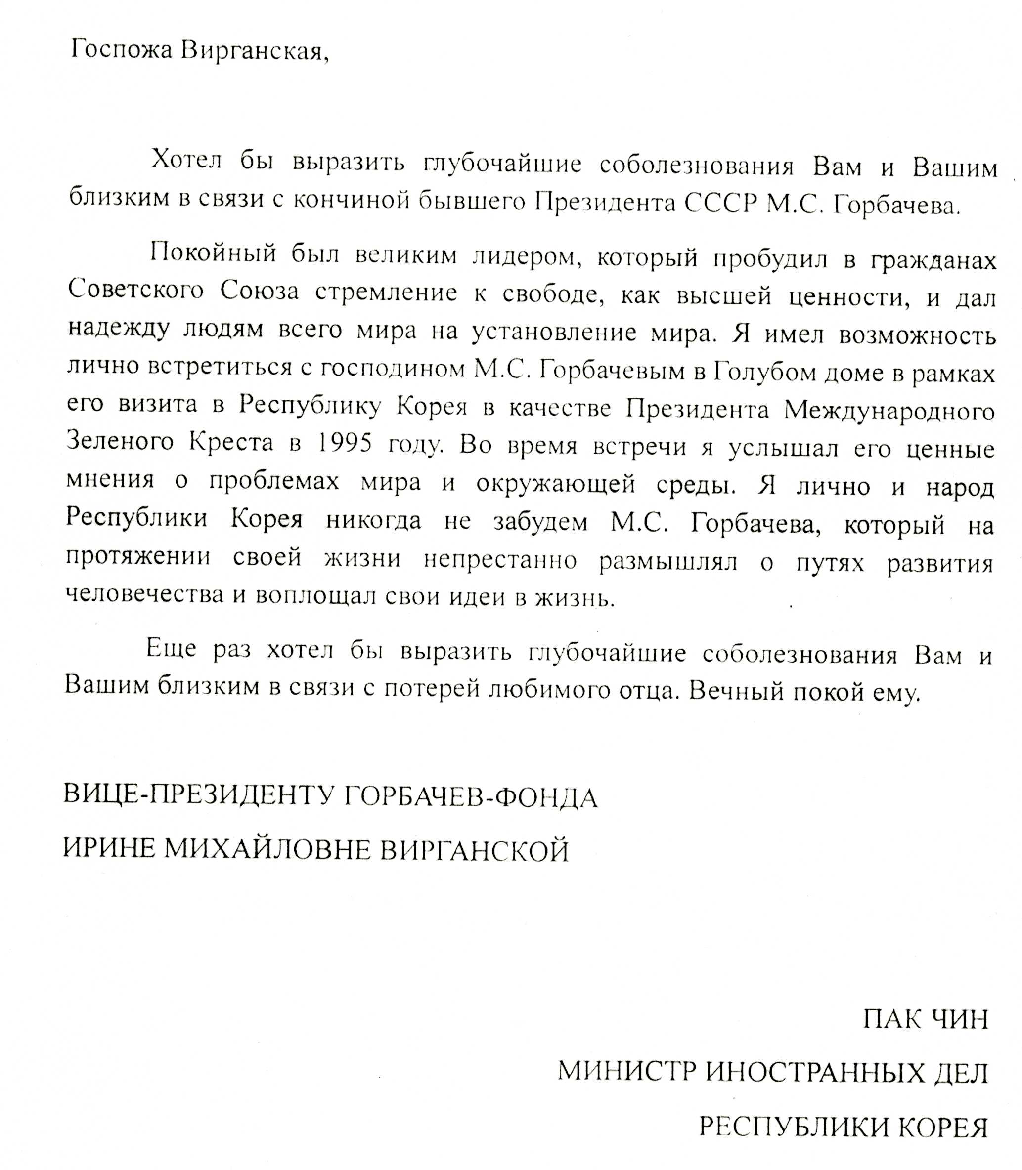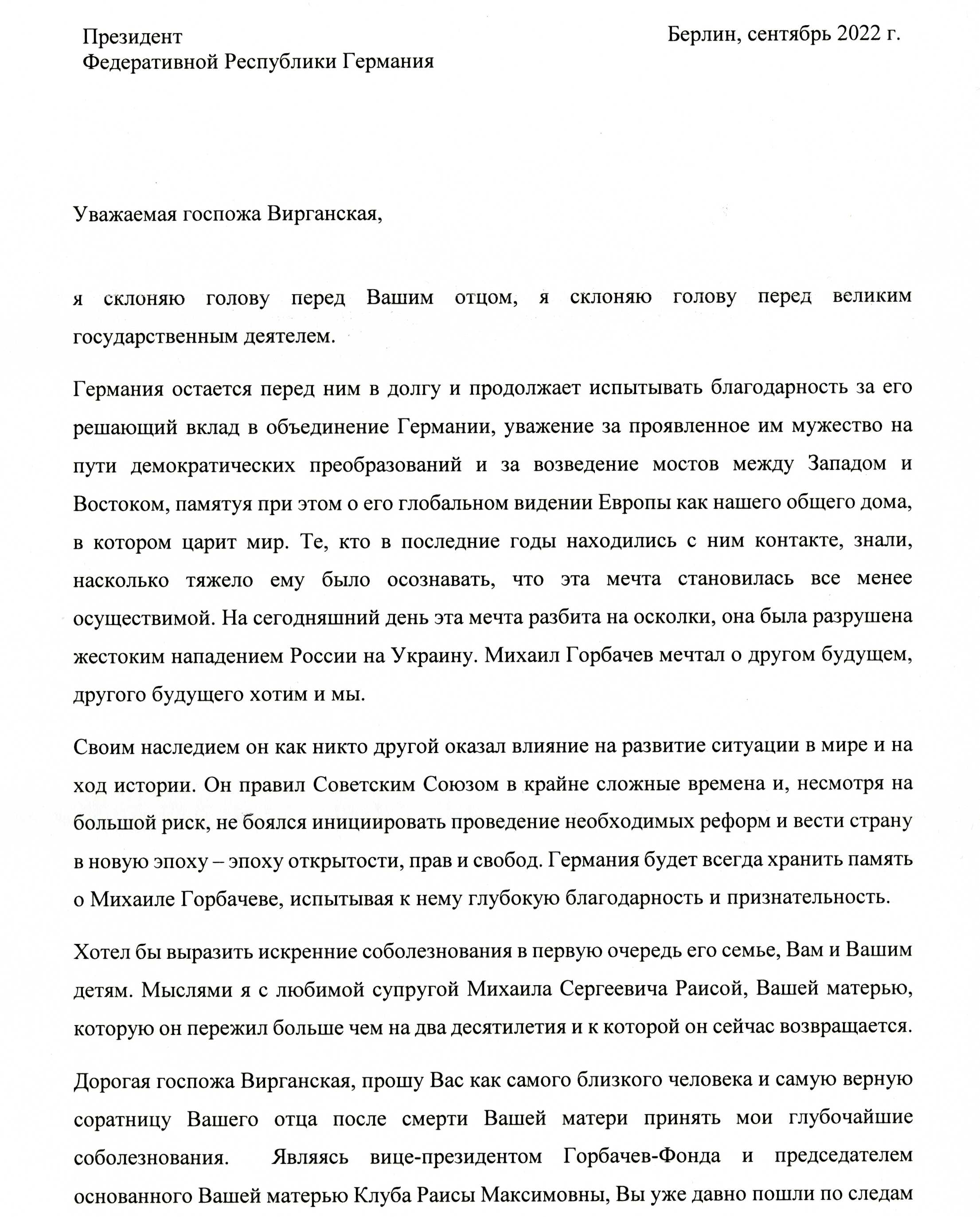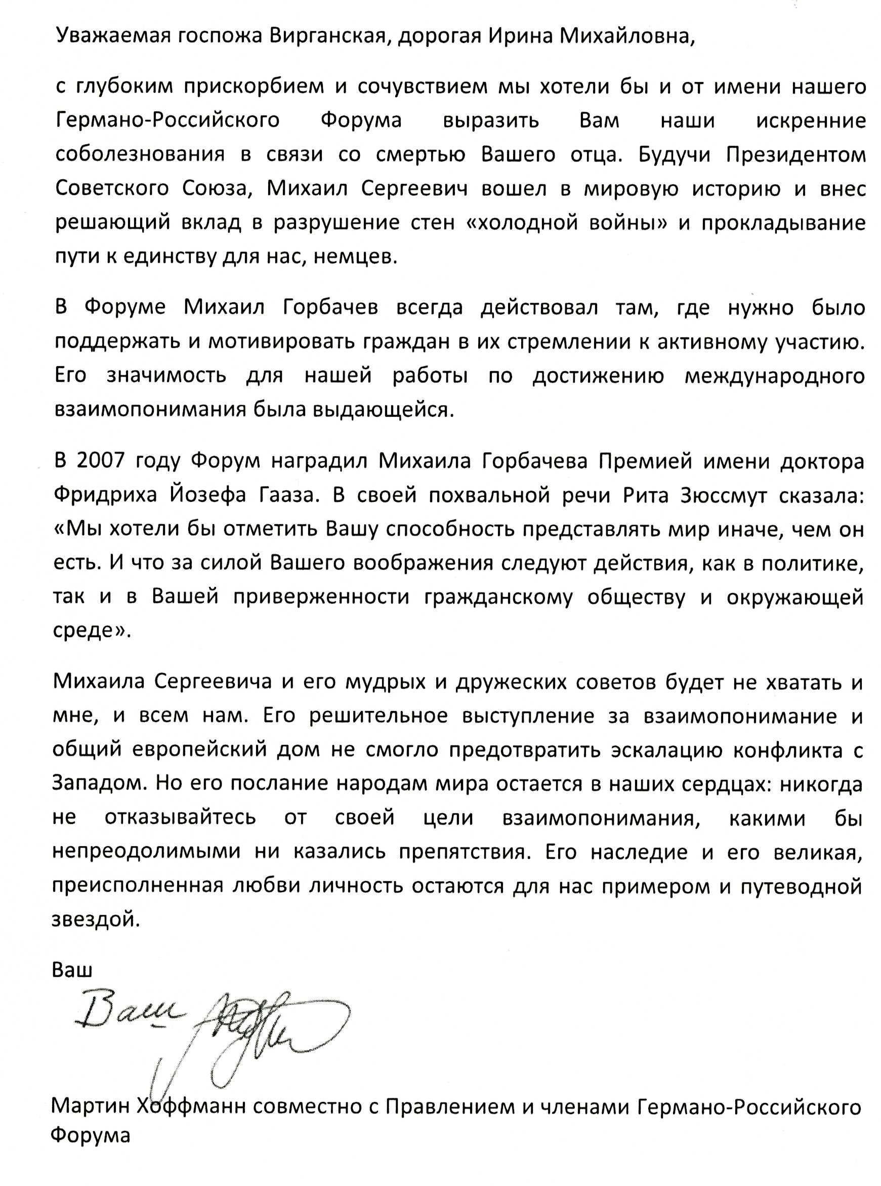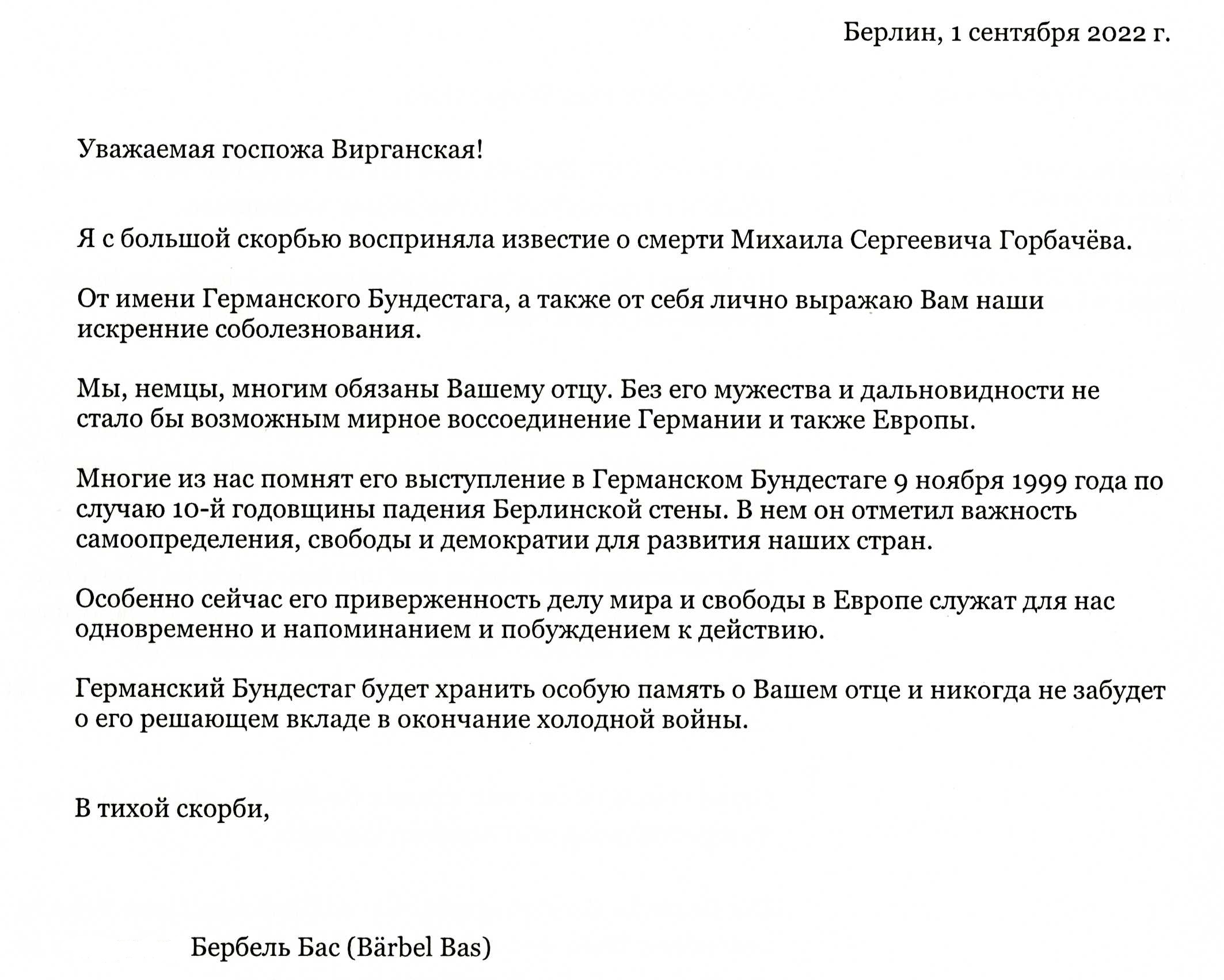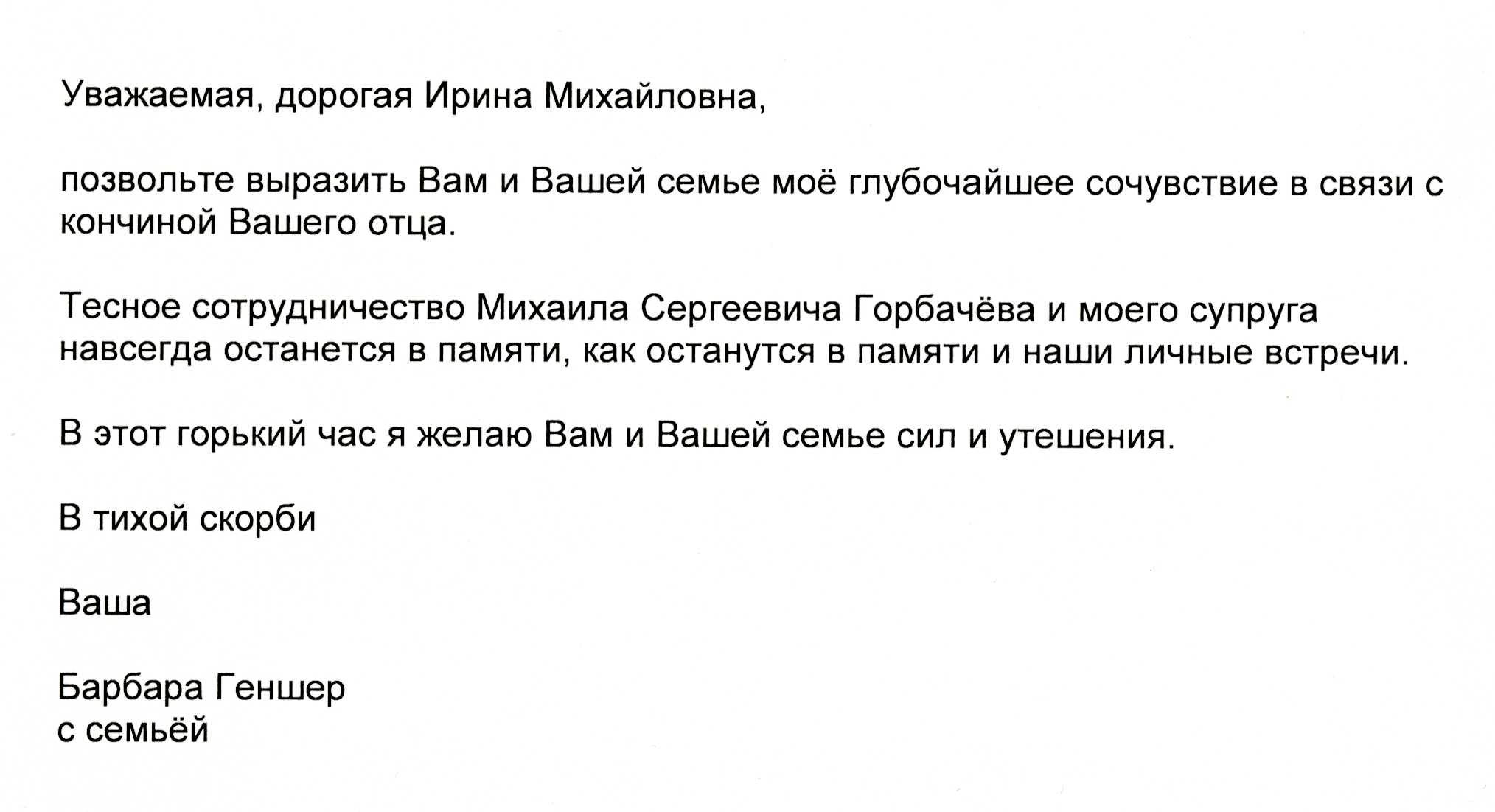 Уважаемая госпожа Вирганская, Прошу принять мои искренние соболезнования в связи с кончиной Вашего отца, господина Михаила Сергеевича Горбачева. С наилучшими пожеланиями,