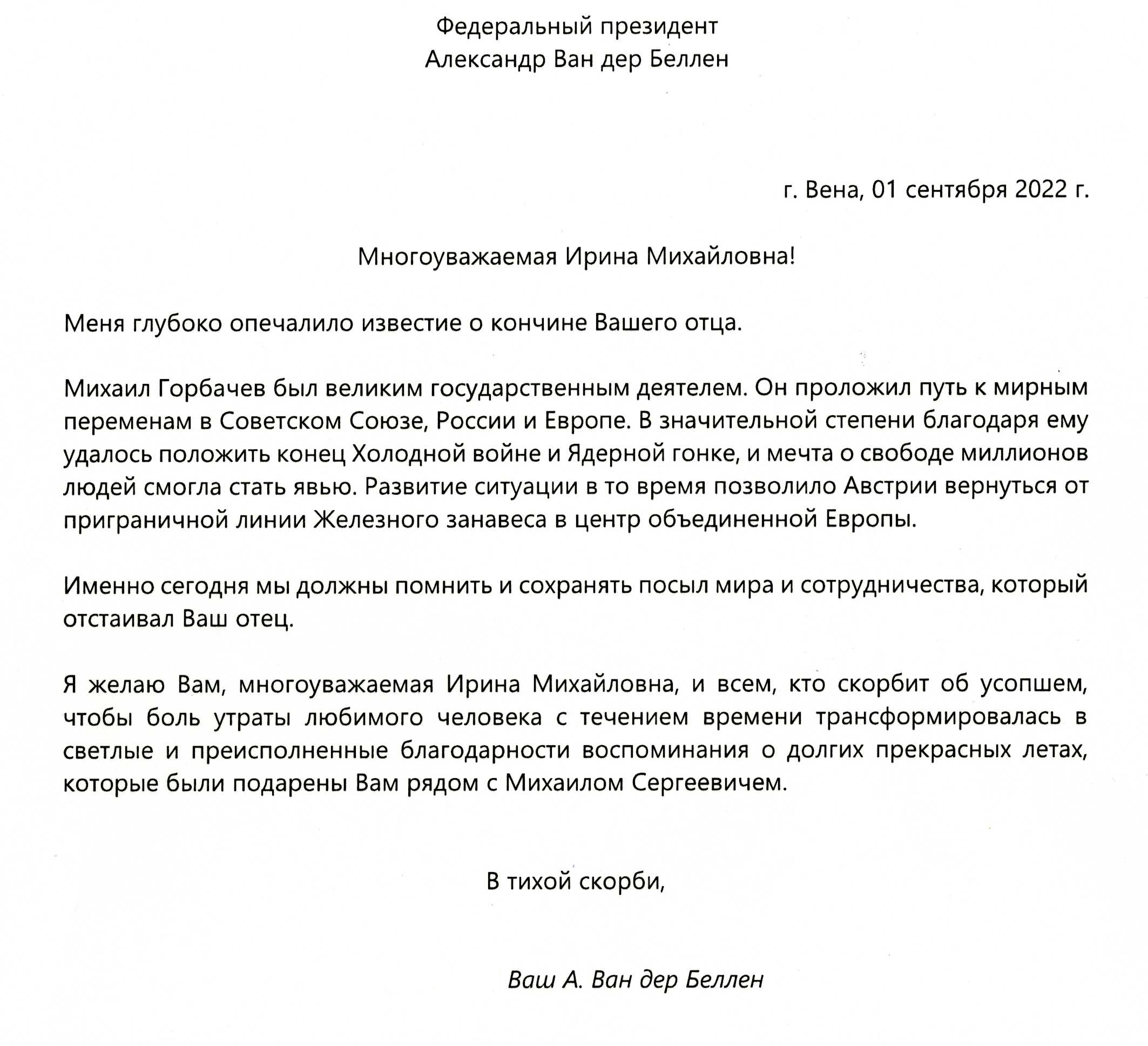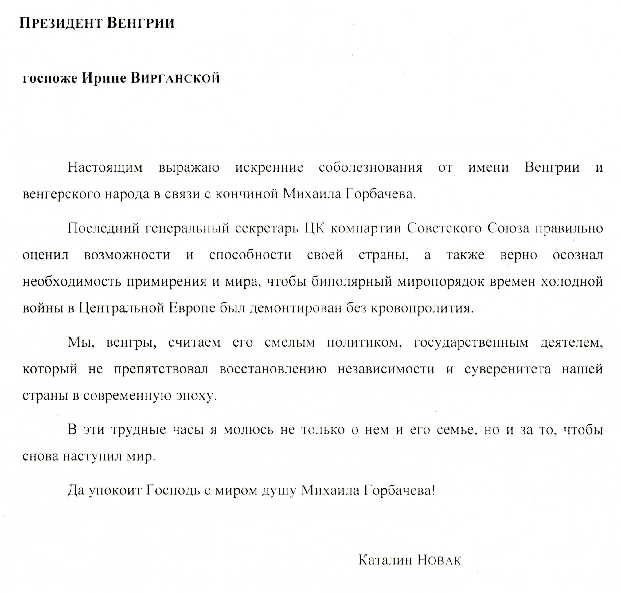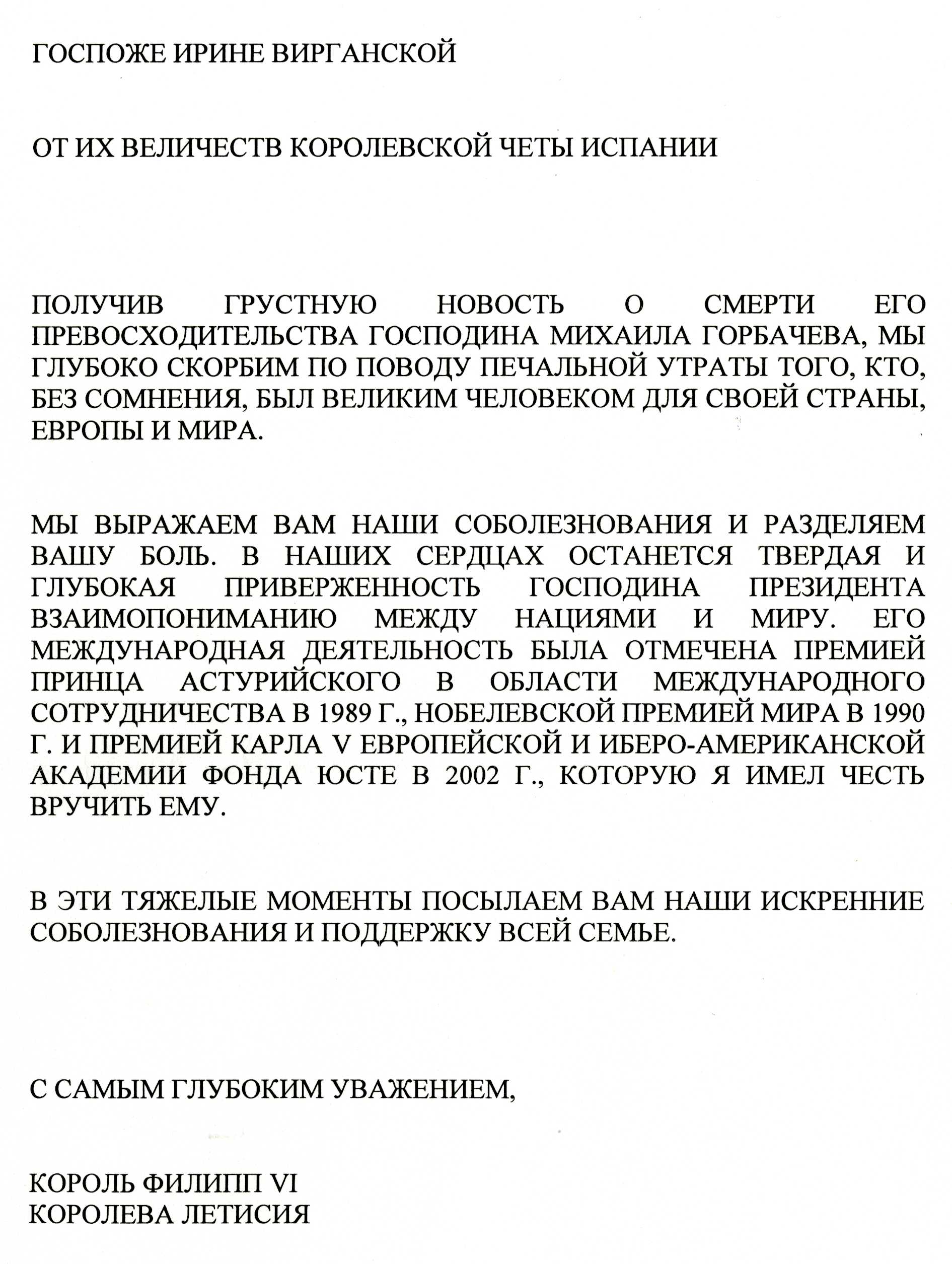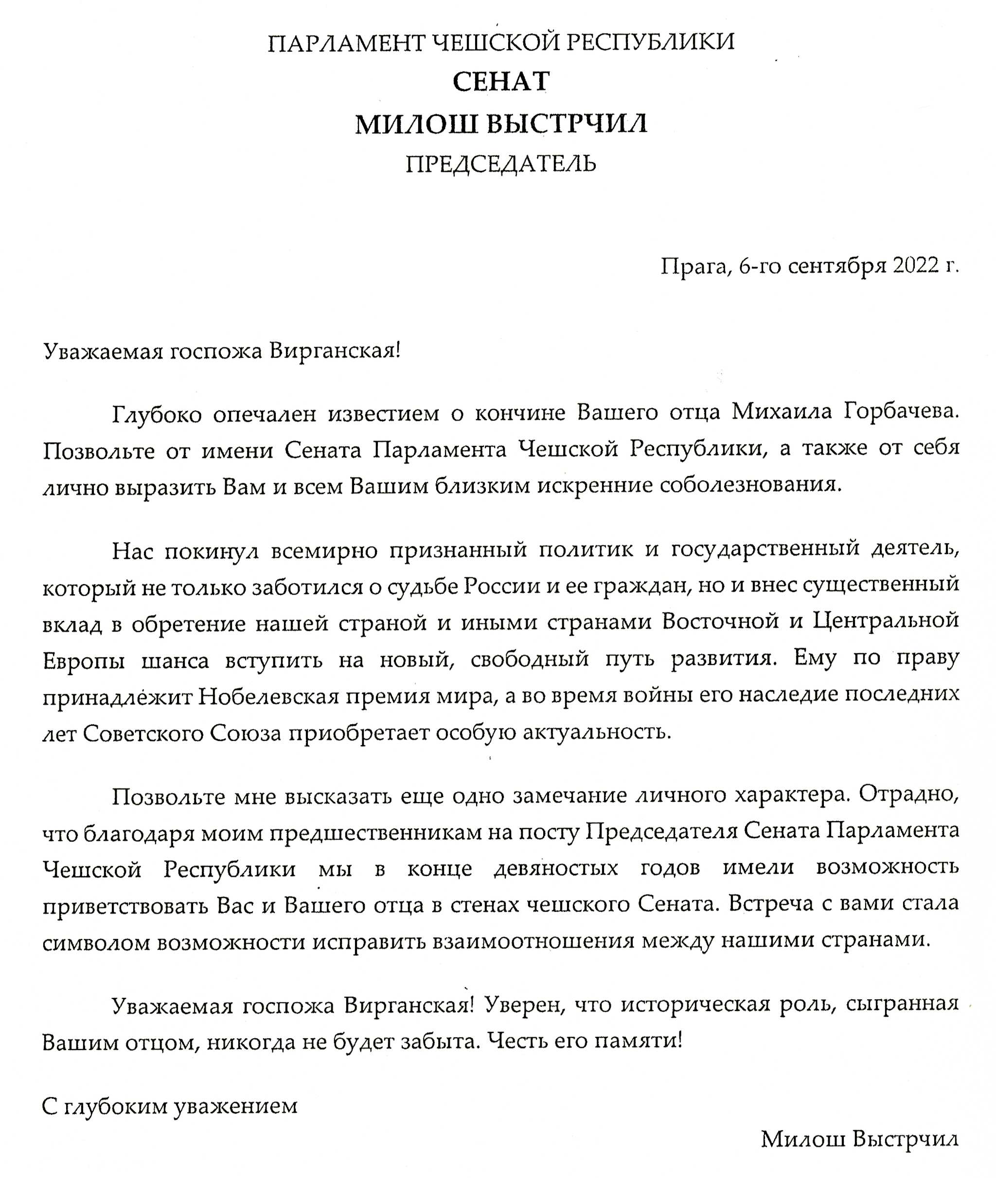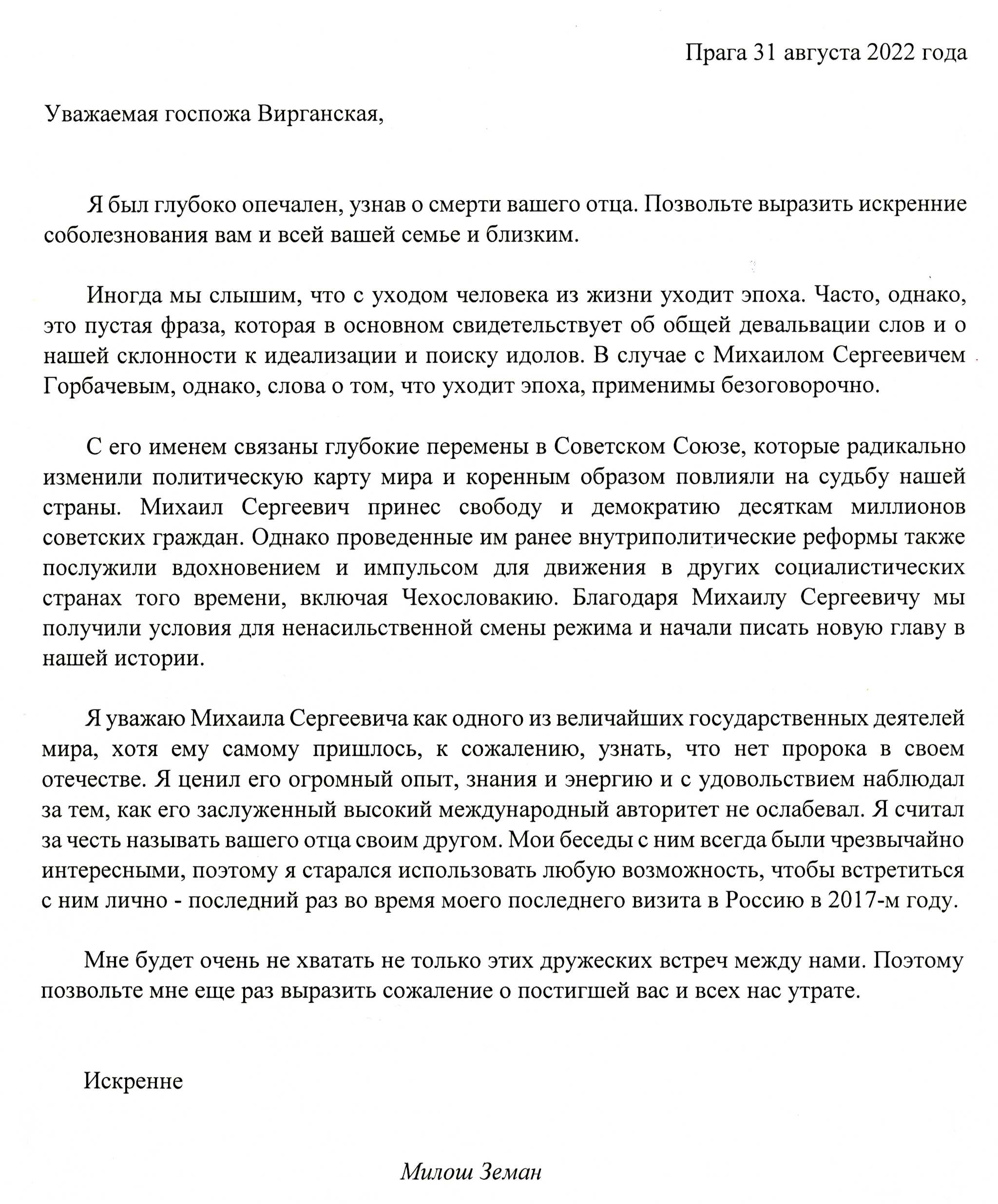 Уважаемая госпожа Вирганская, Прошу принять мои искренние соболезнования в связи с кончиной Вашего отца, господина Михаила Сергеевича Горбачева. С наилучшими пожеланиями,