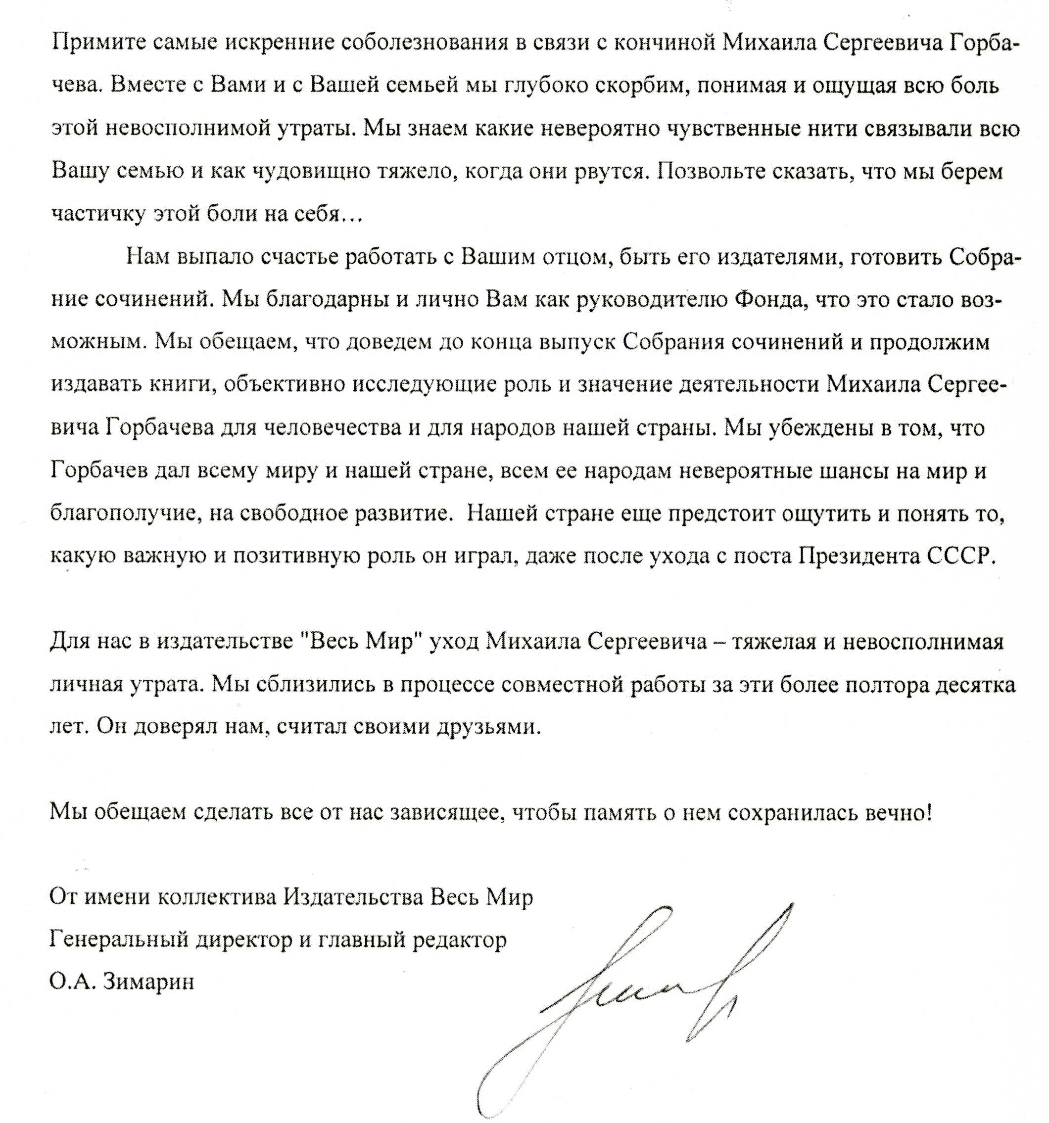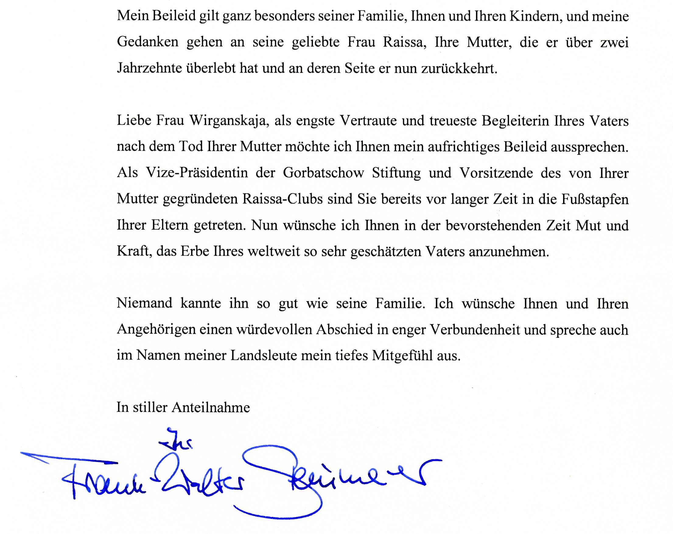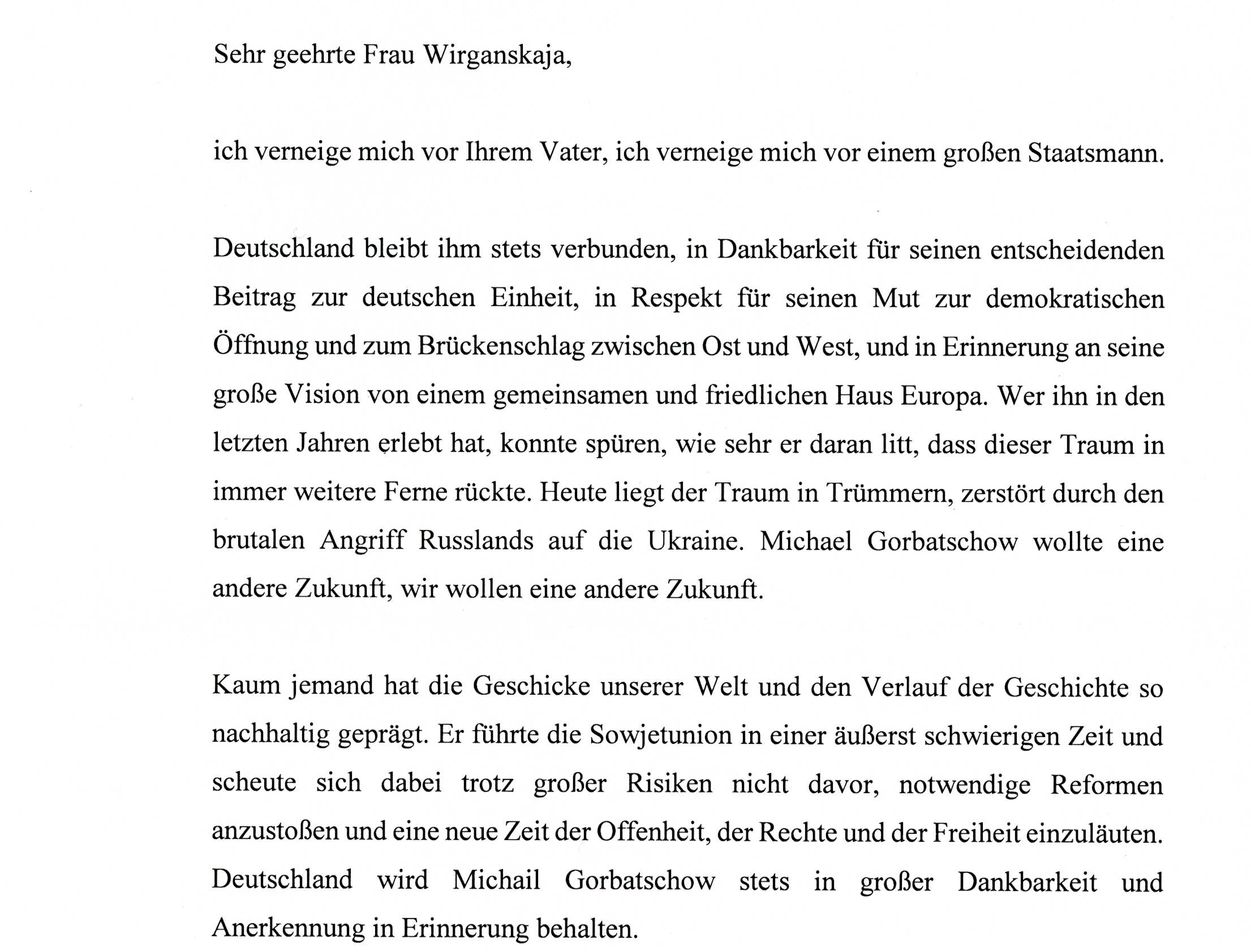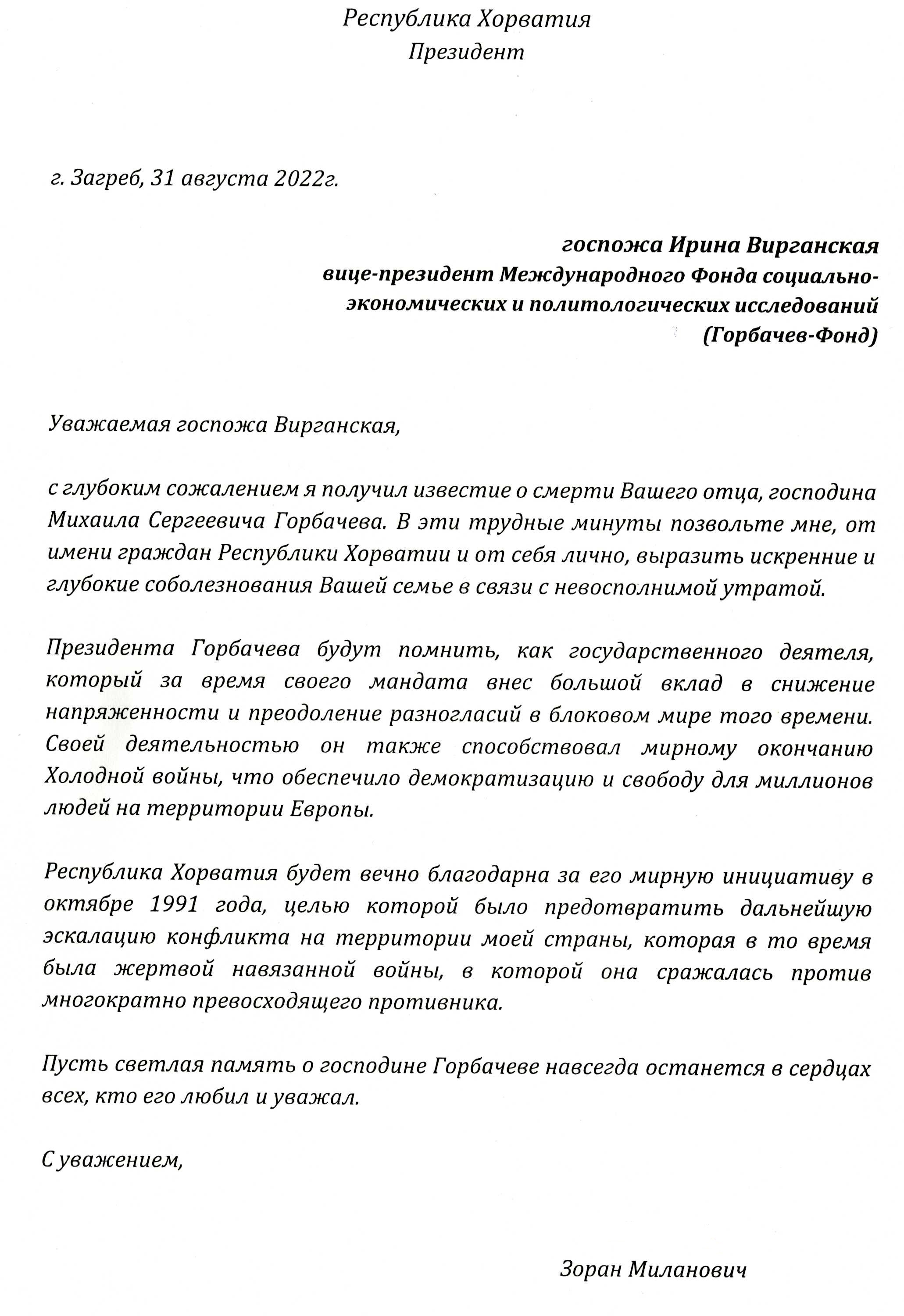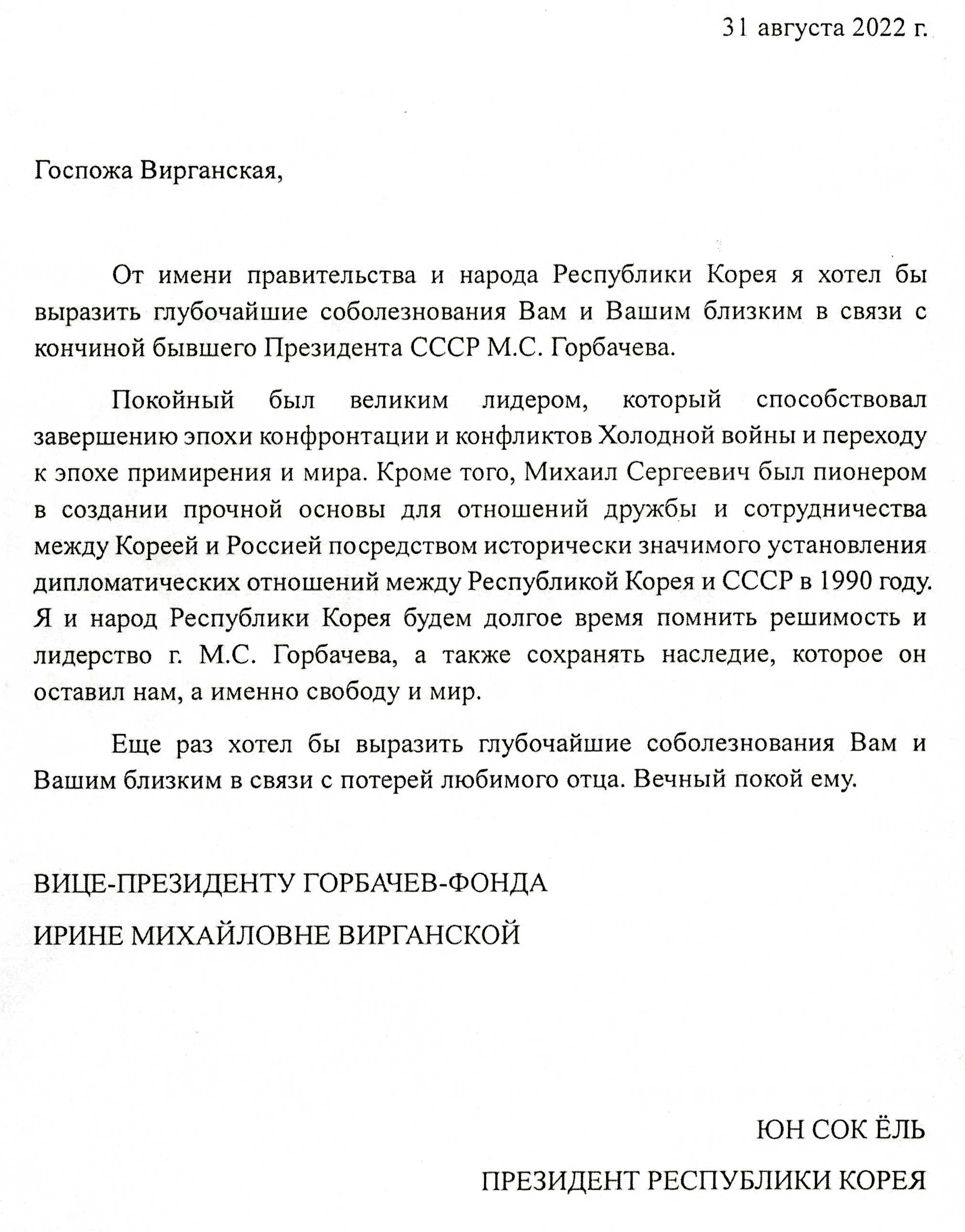 Уважаемая госпожа Вирганская, Прошу принять мои искренние соболезнования в связи с кончиной Вашего отца, господина Михаила Сергеевича Горбачева. С наилучшими пожеланиями,