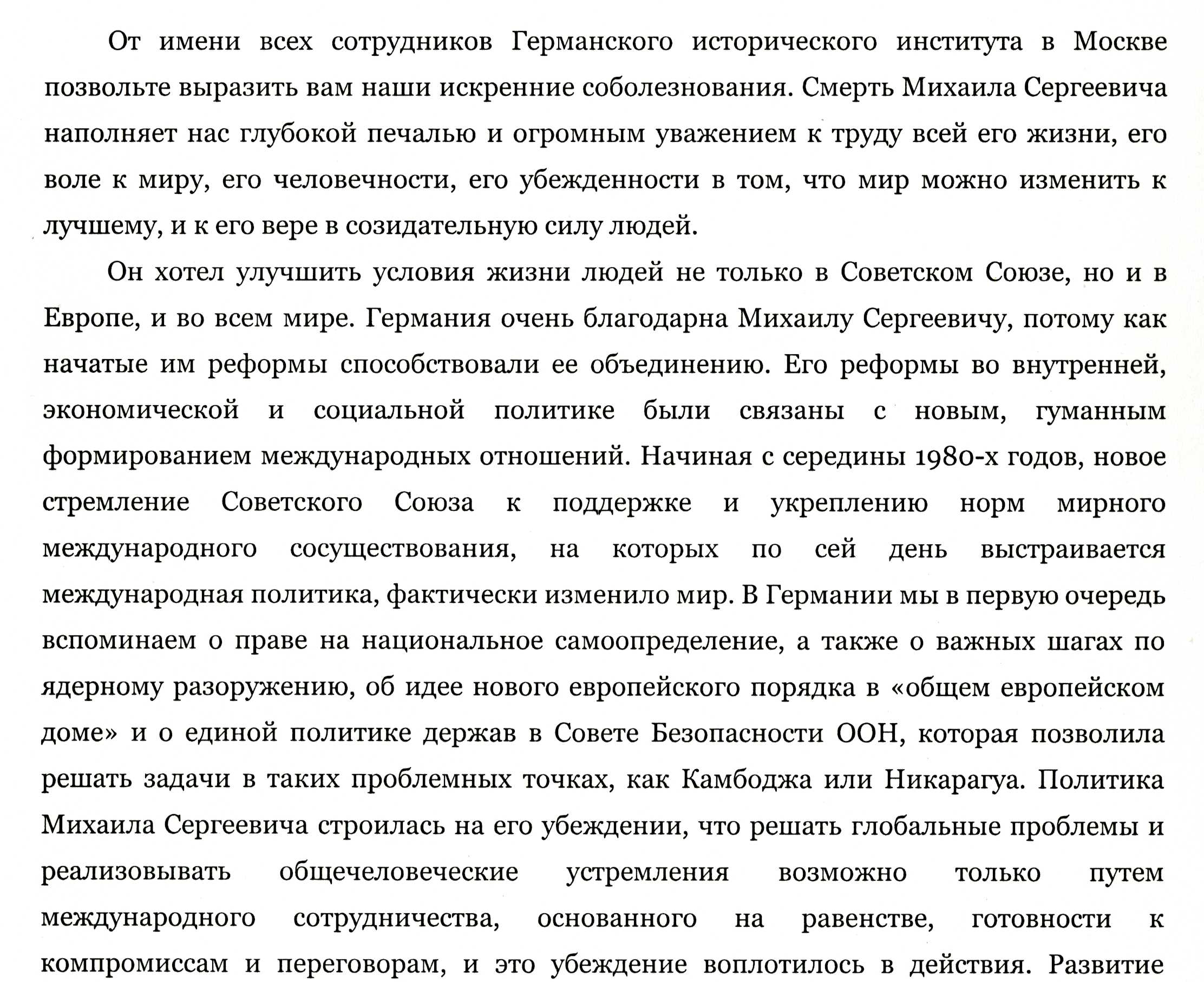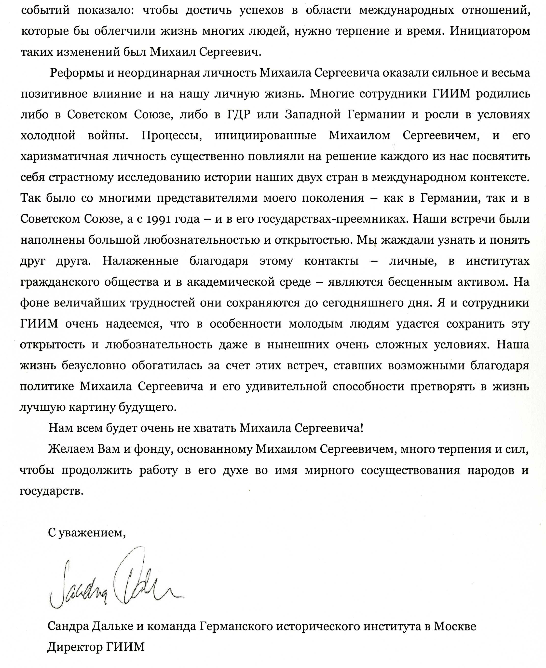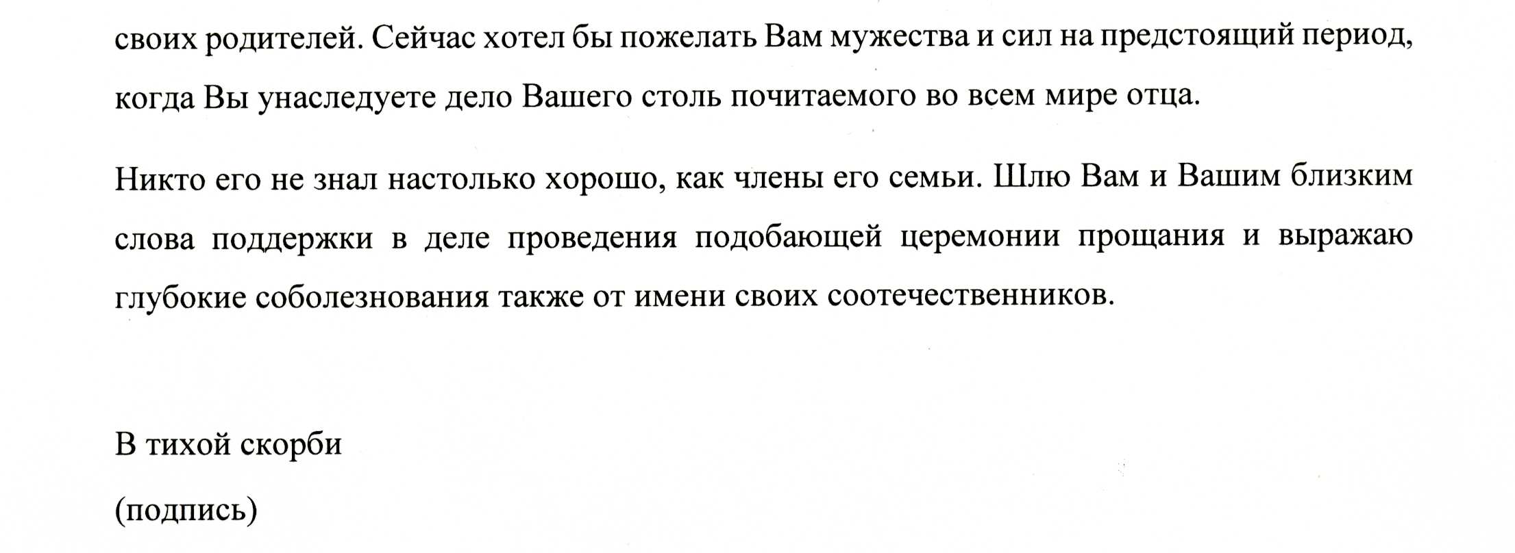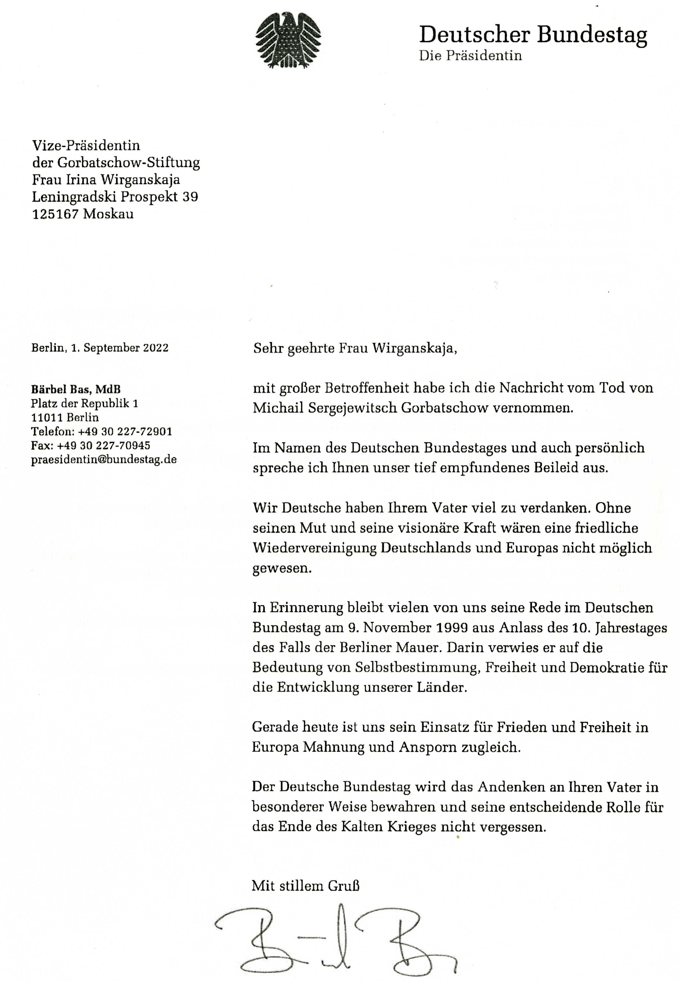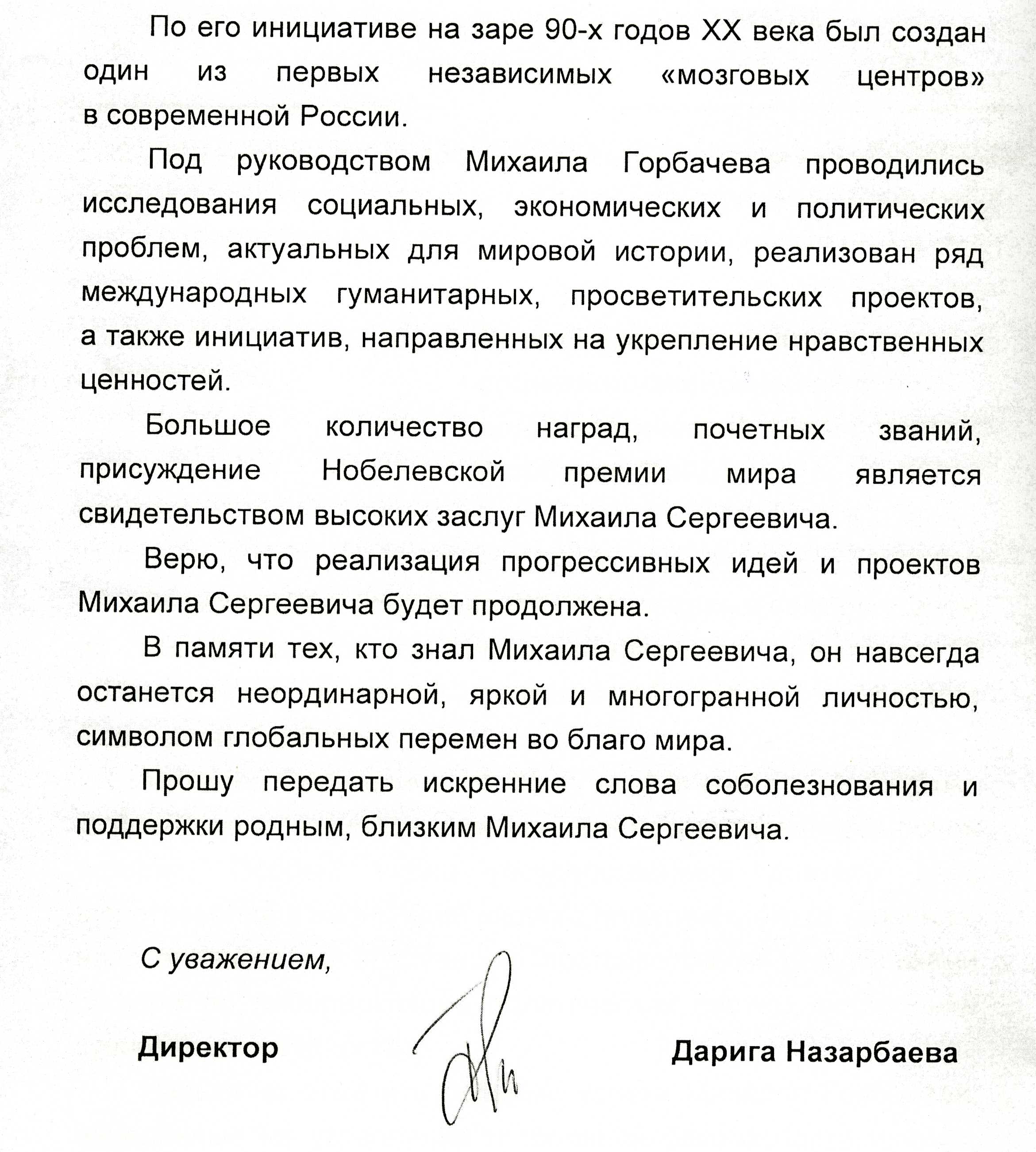 Уважаемая госпожа Вирганская, Прошу принять мои искренние соболезнования в связи с кончиной Вашего отца, господина Михаила Сергеевича Горбачева. С наилучшими пожеланиями,