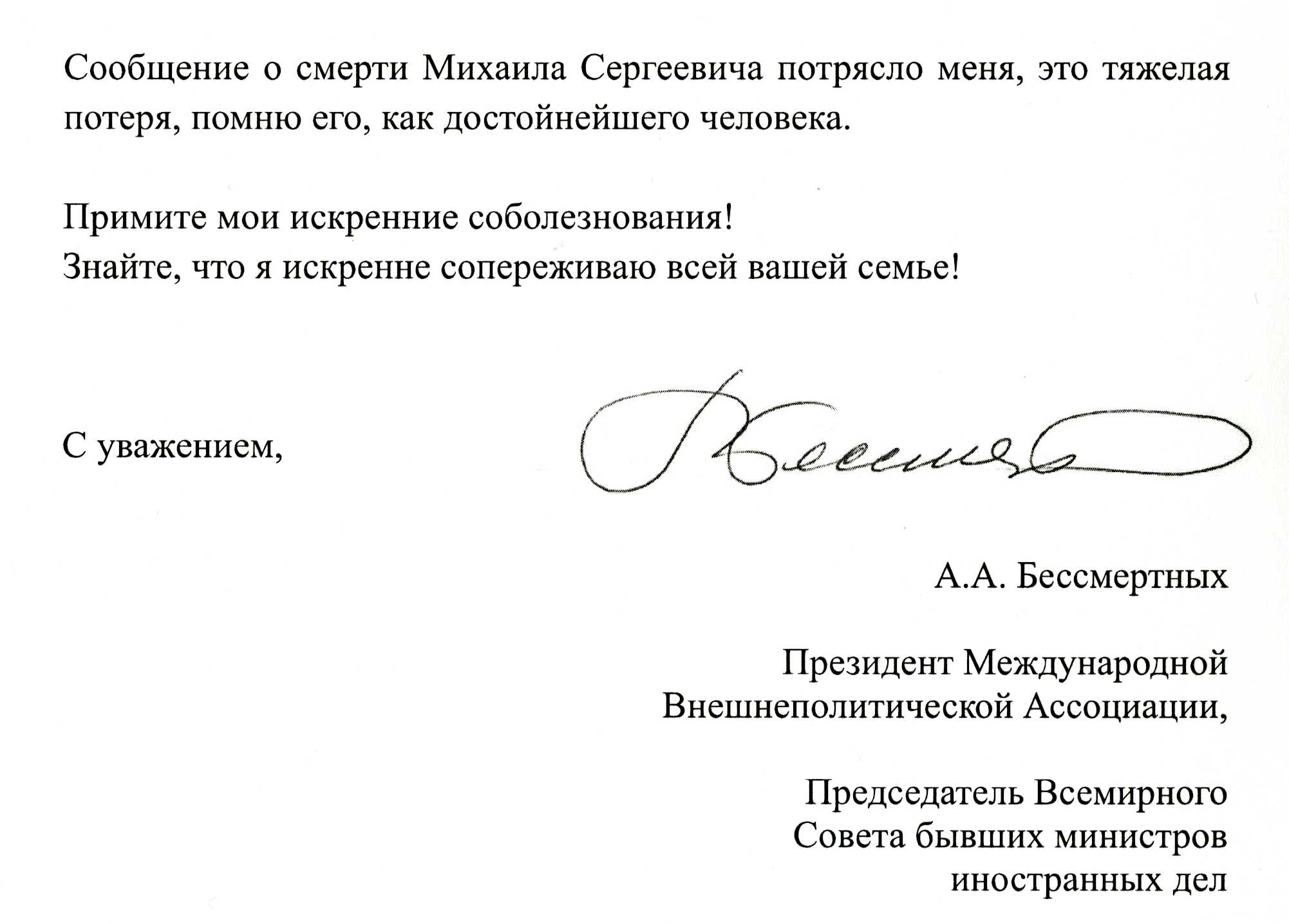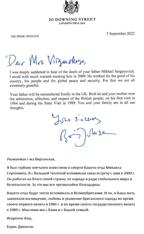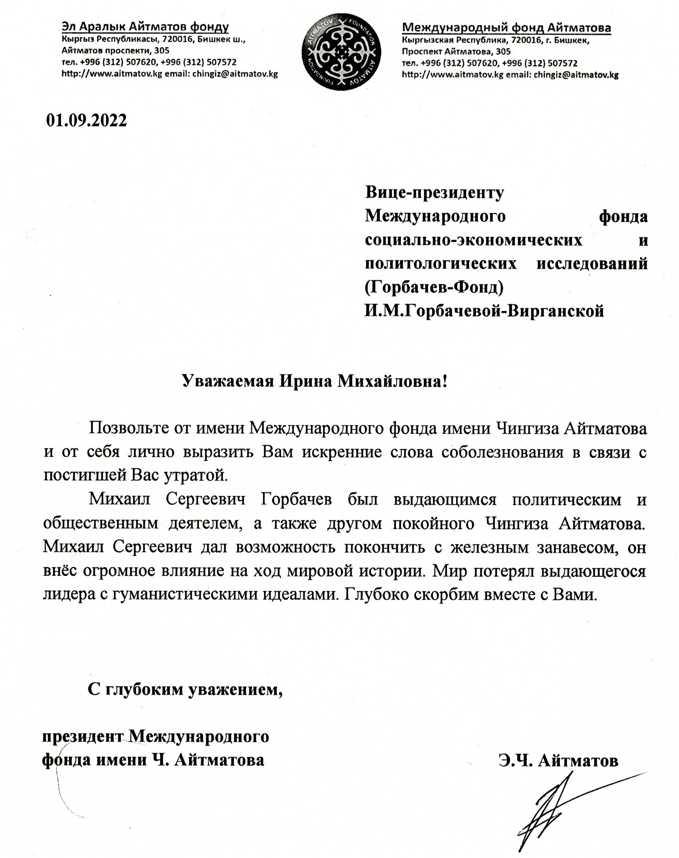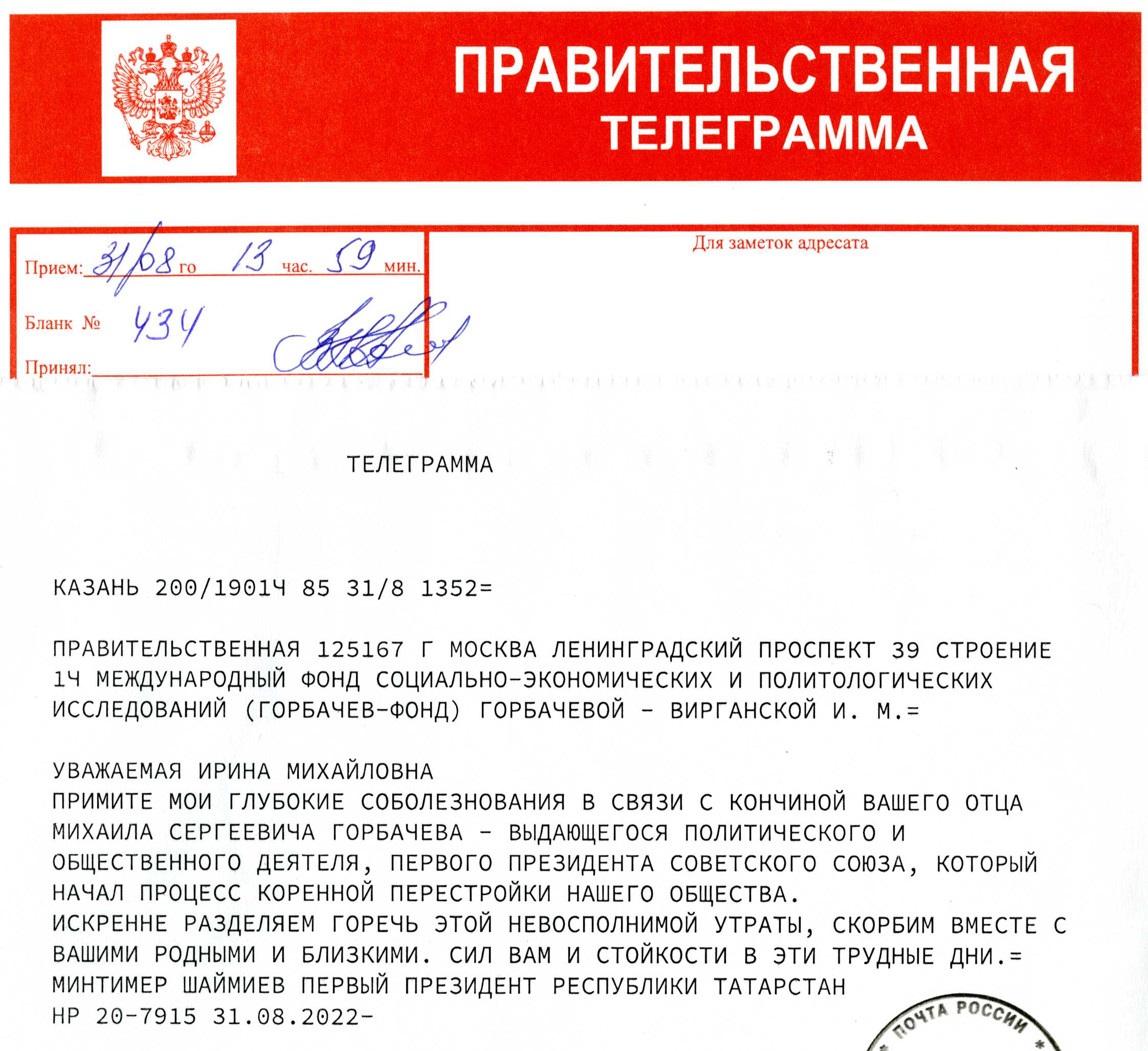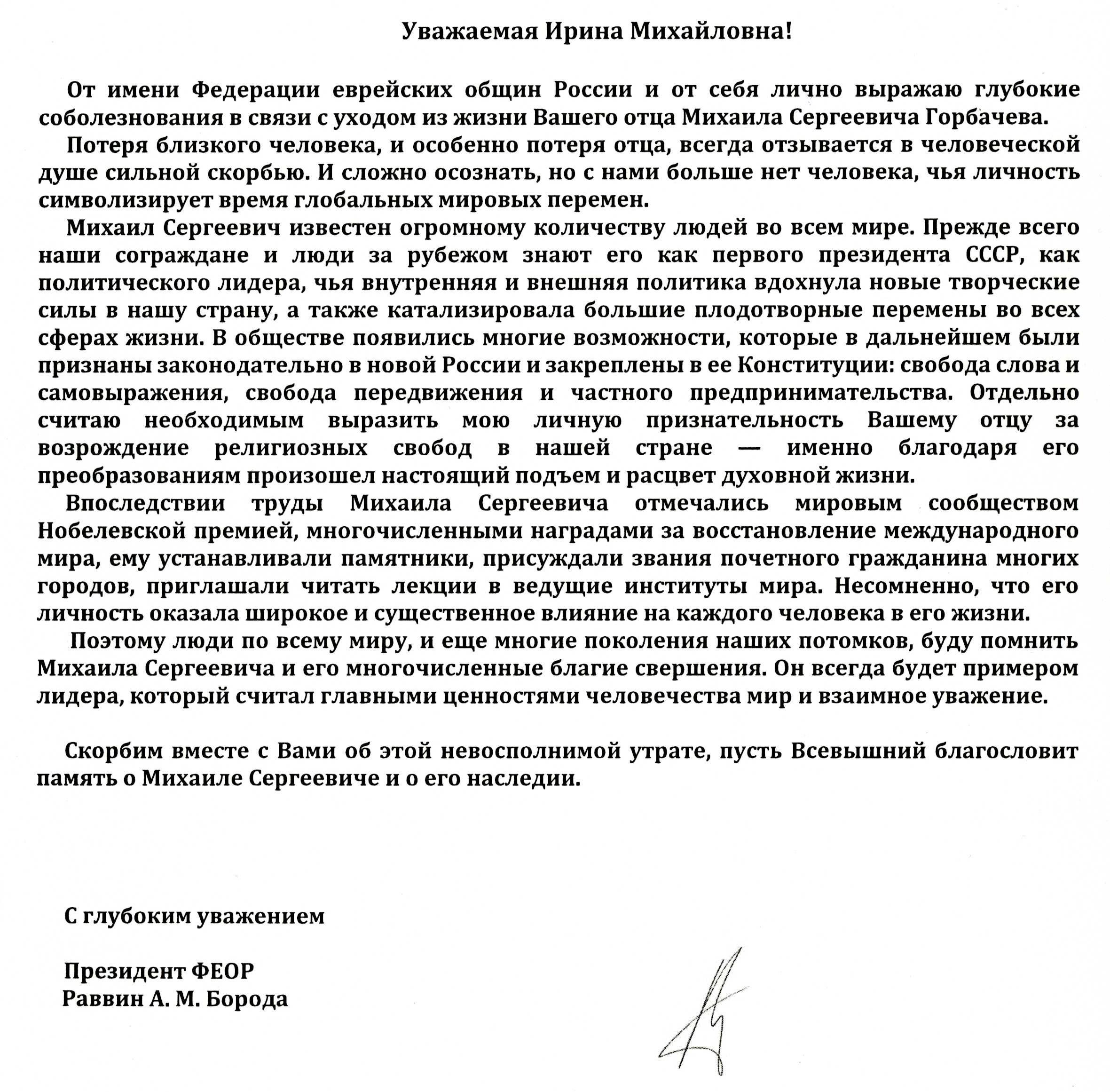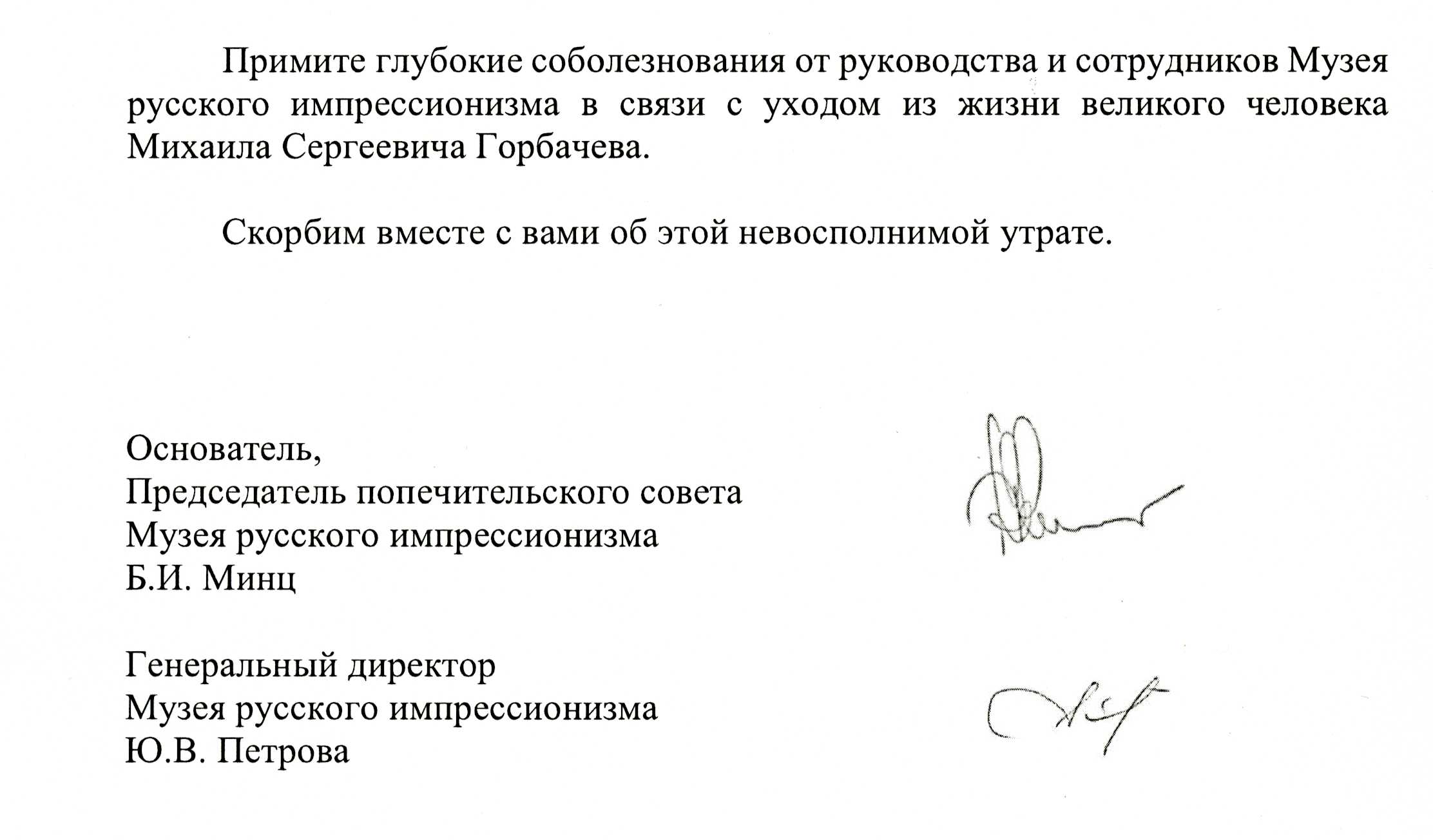 Уважаемая госпожа Вирганская, Прошу принять мои искренние соболезнования в связи с кончиной Вашего отца, господина Михаила Сергеевича Горбачева. С наилучшими пожеланиями,