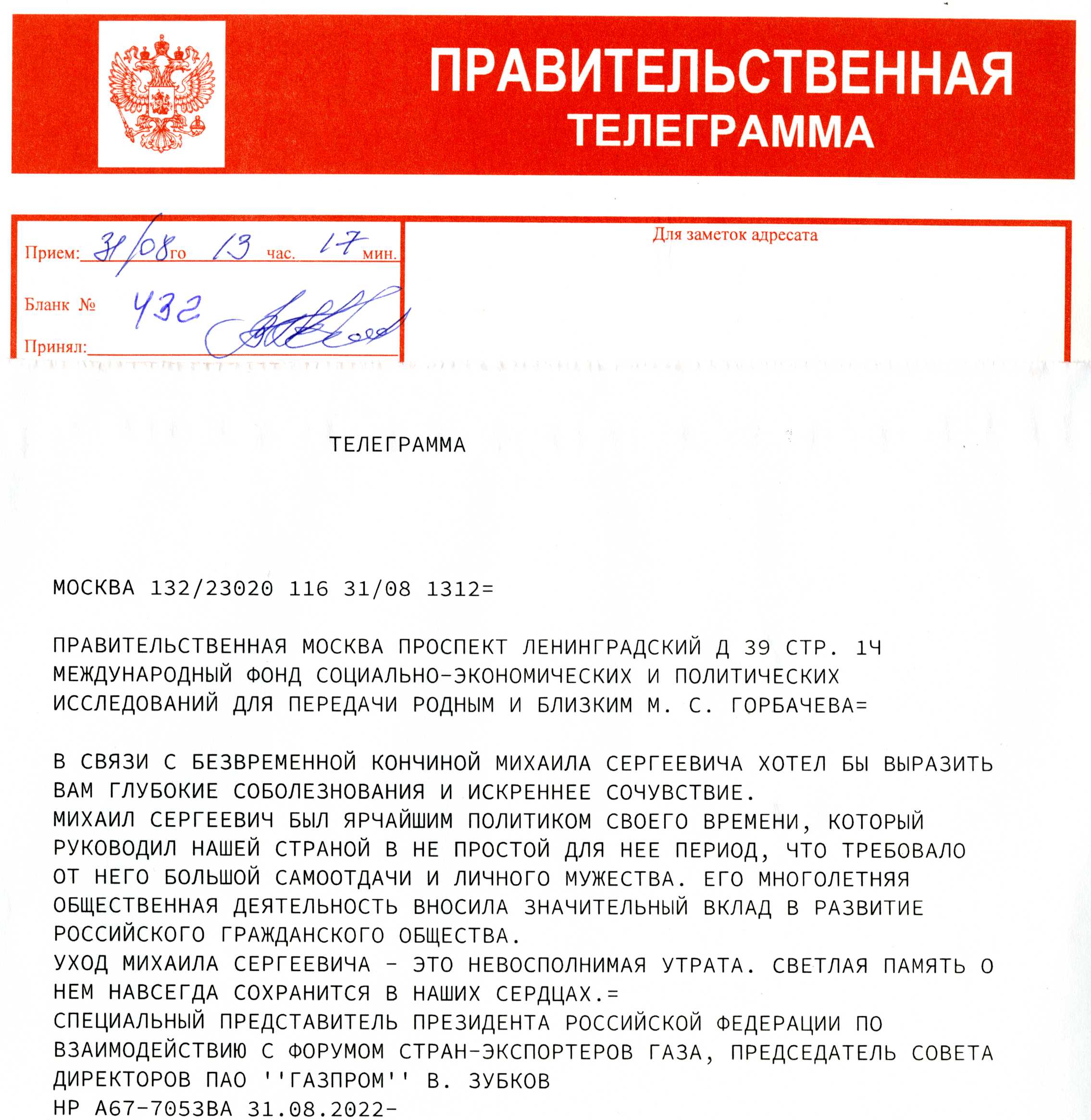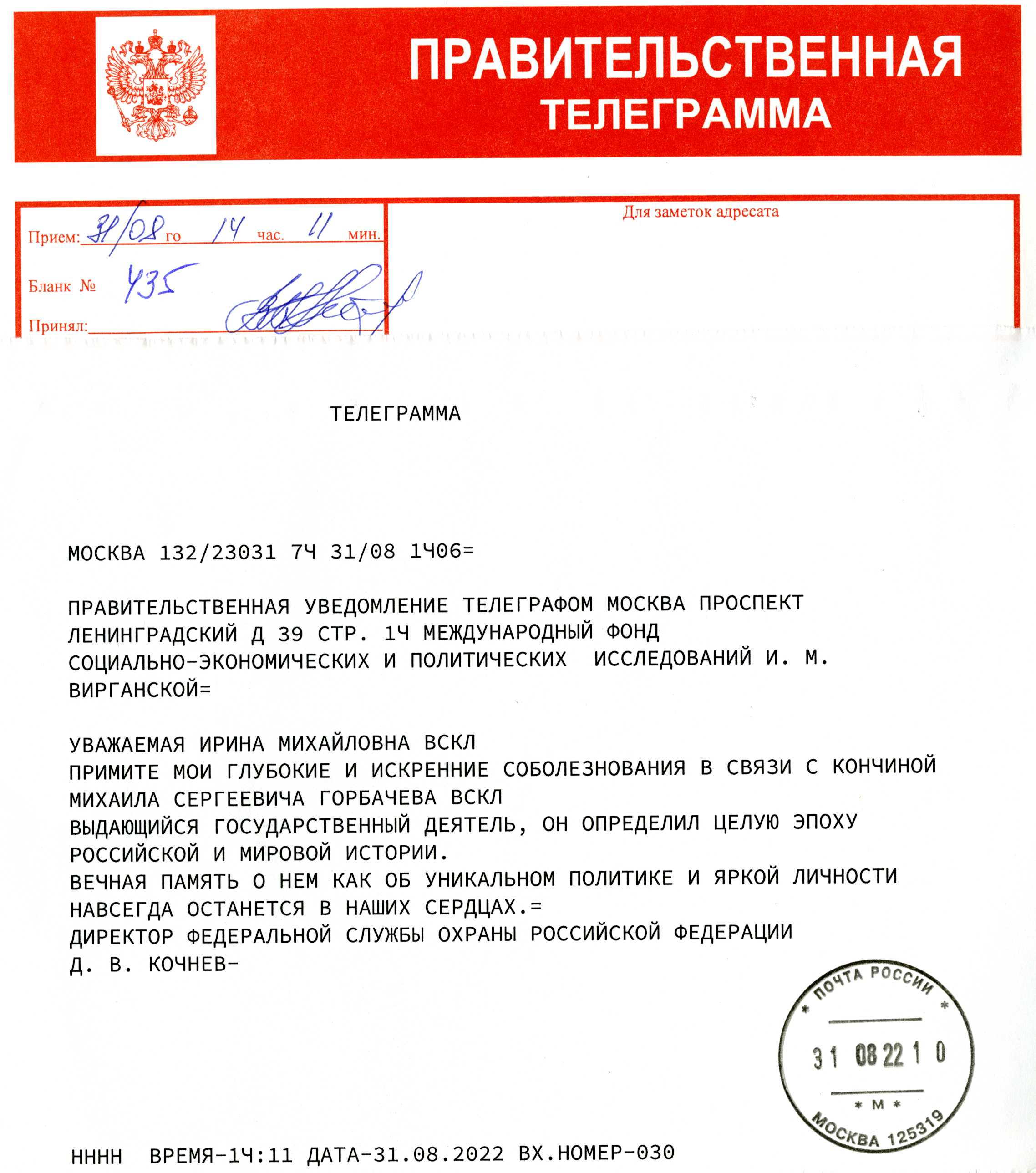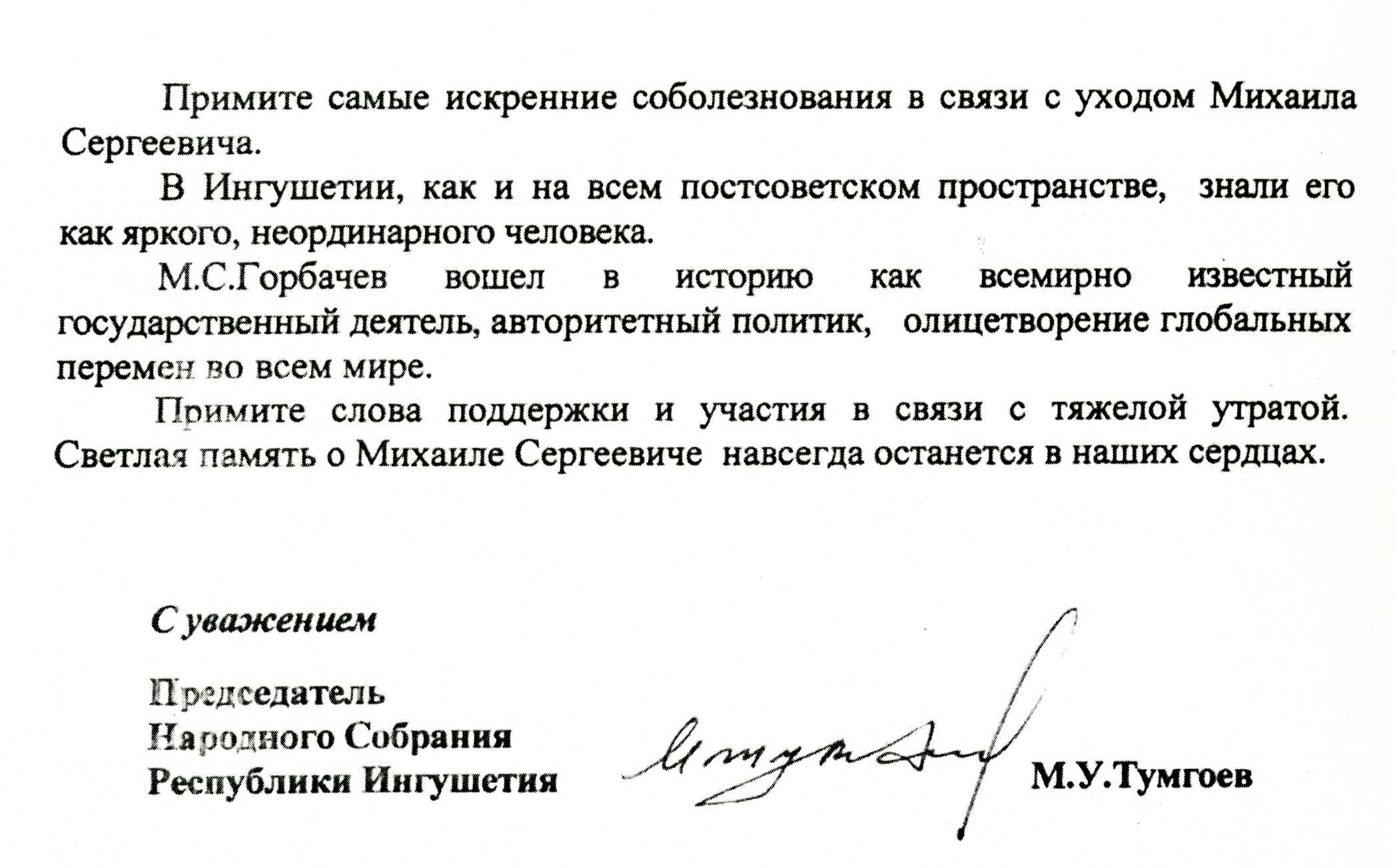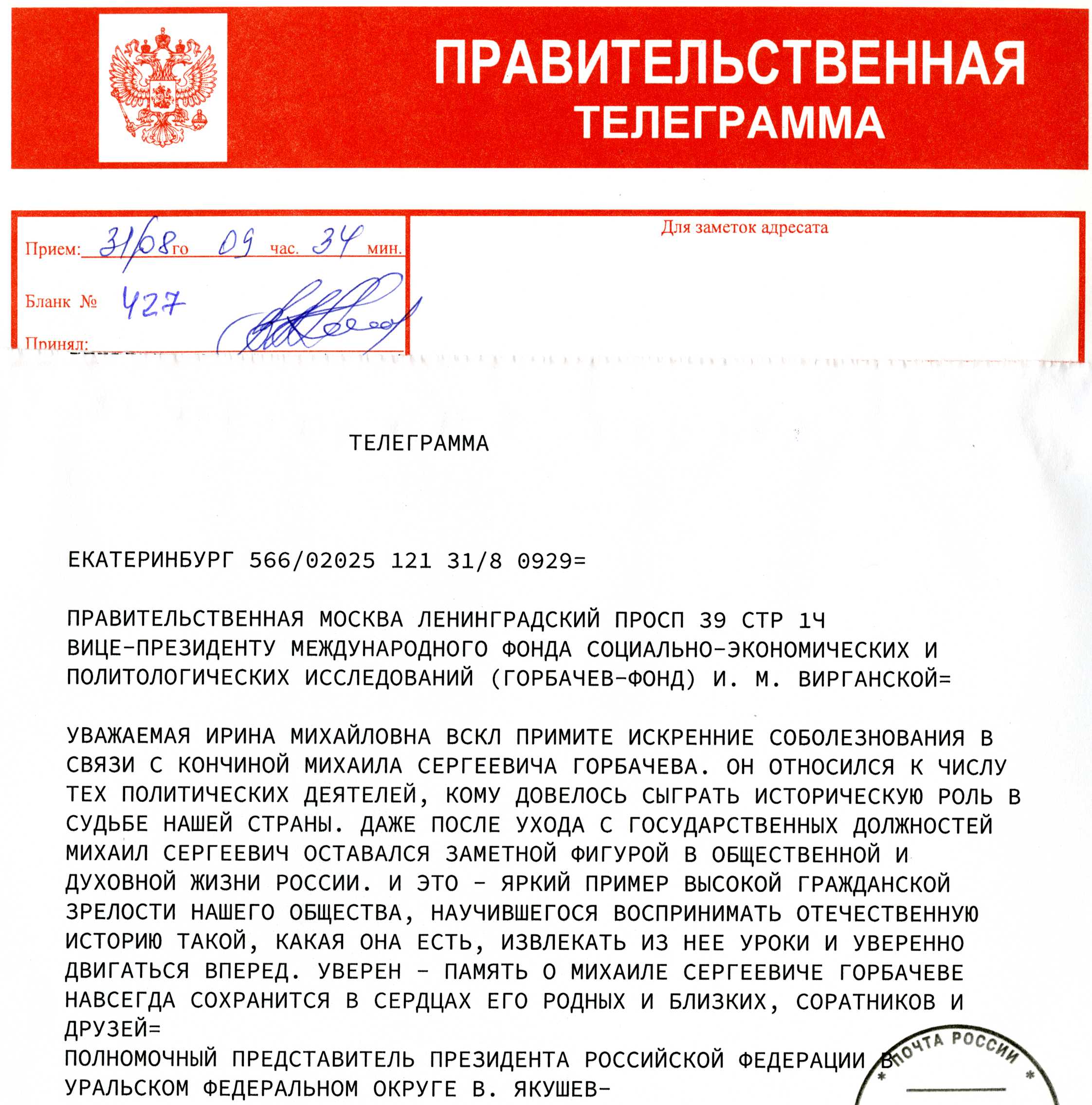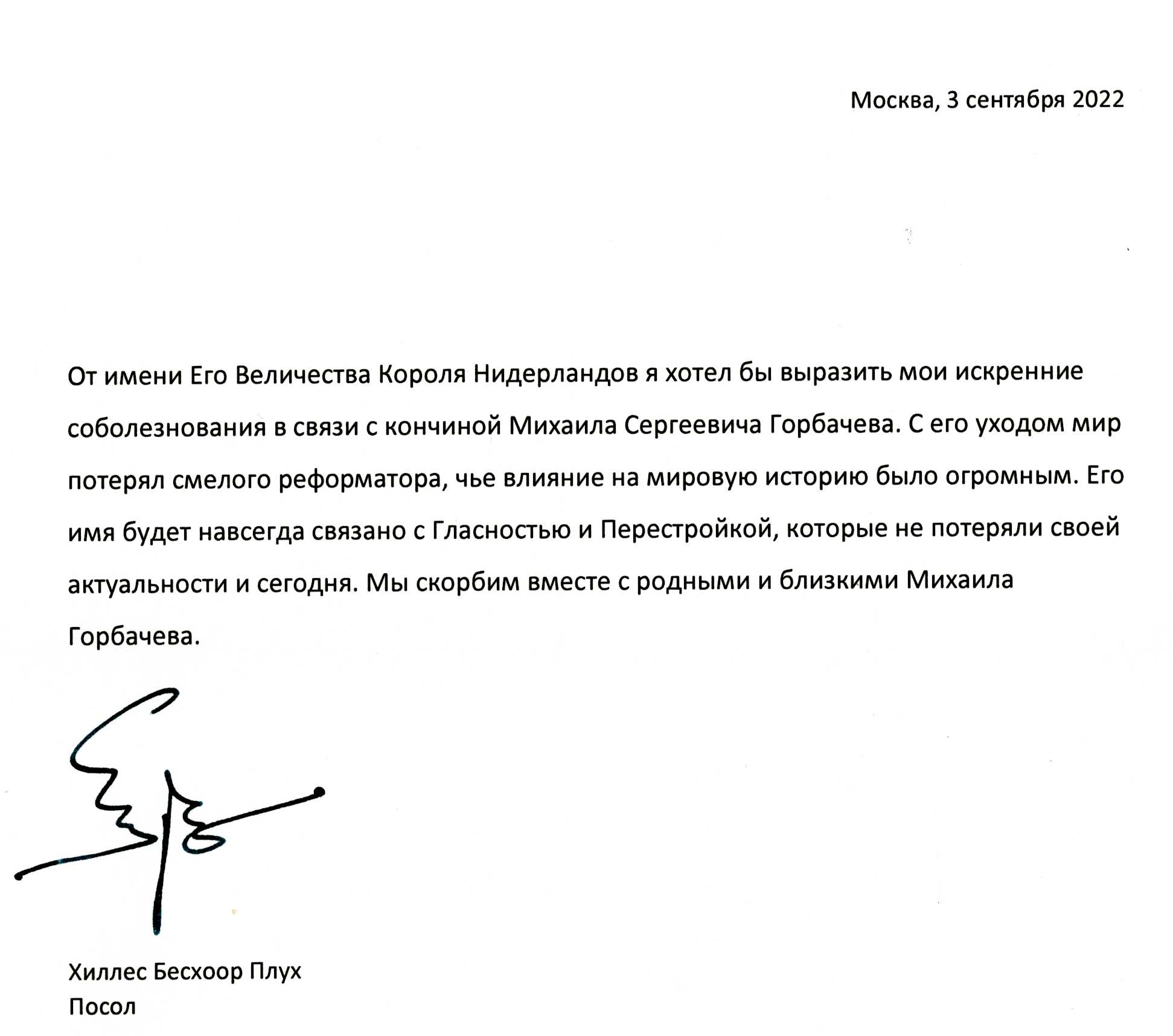 Уважаемая госпожа Вирганская, Прошу принять мои искренние соболезнования в связи с кончиной Вашего отца, господина Михаила Сергеевича Горбачева. С наилучшими пожеланиями,