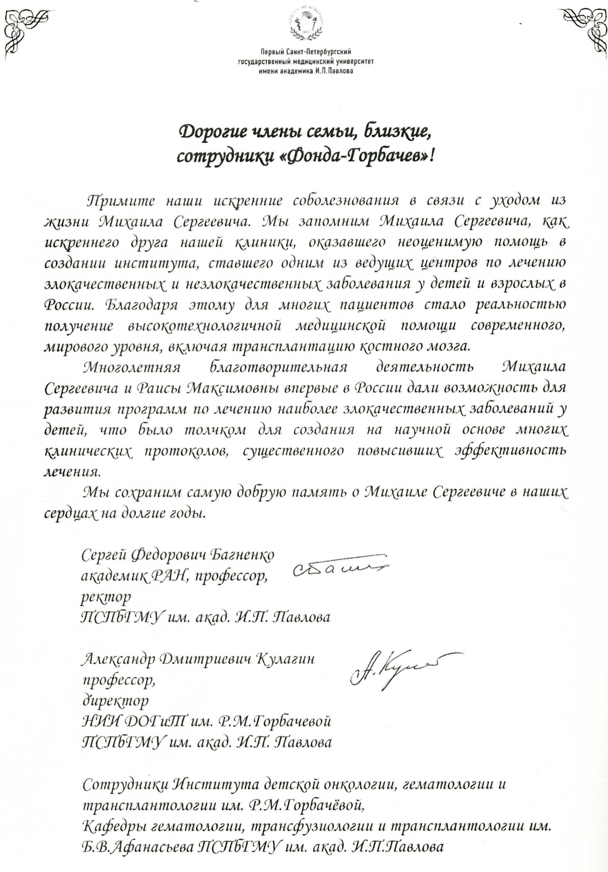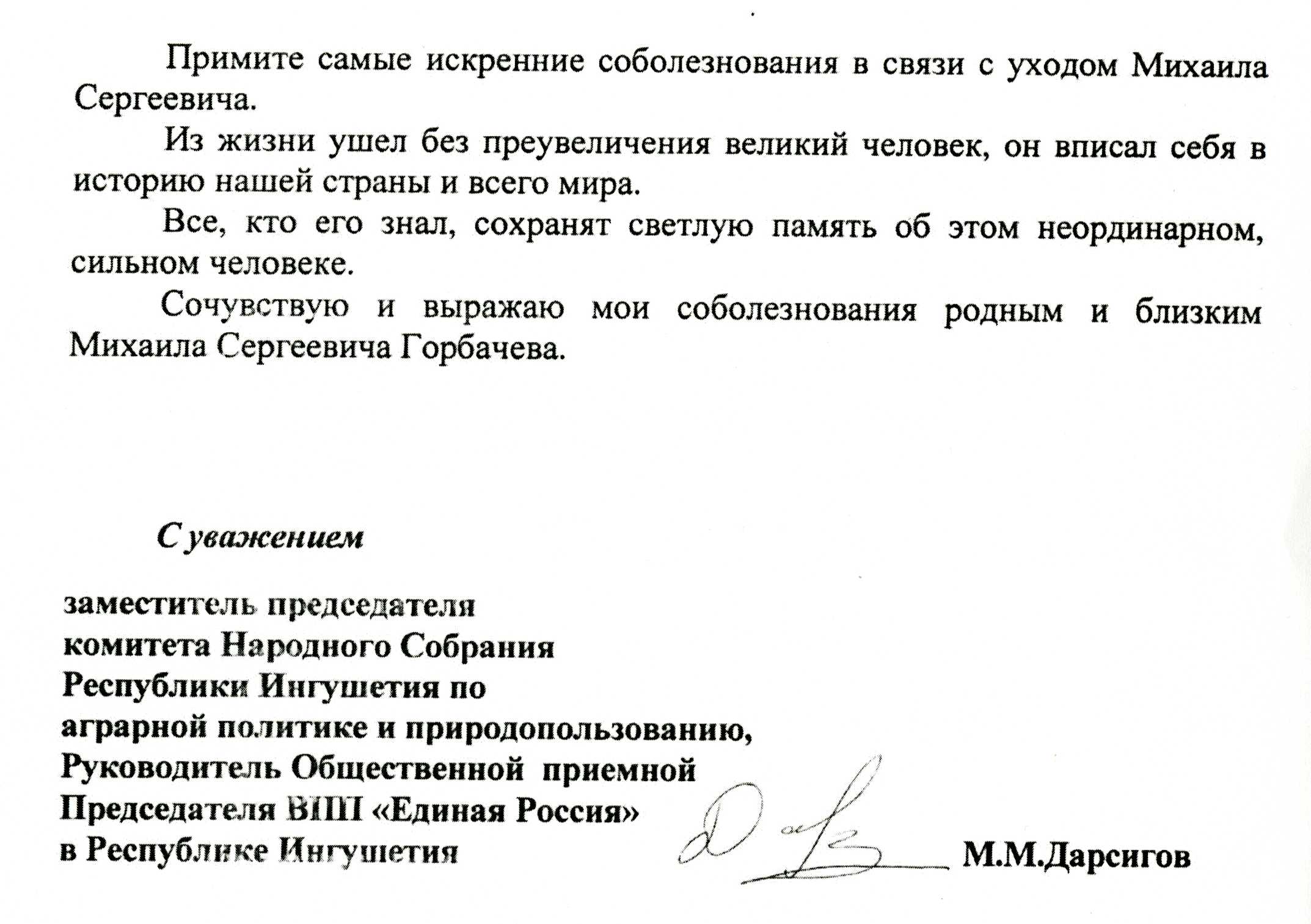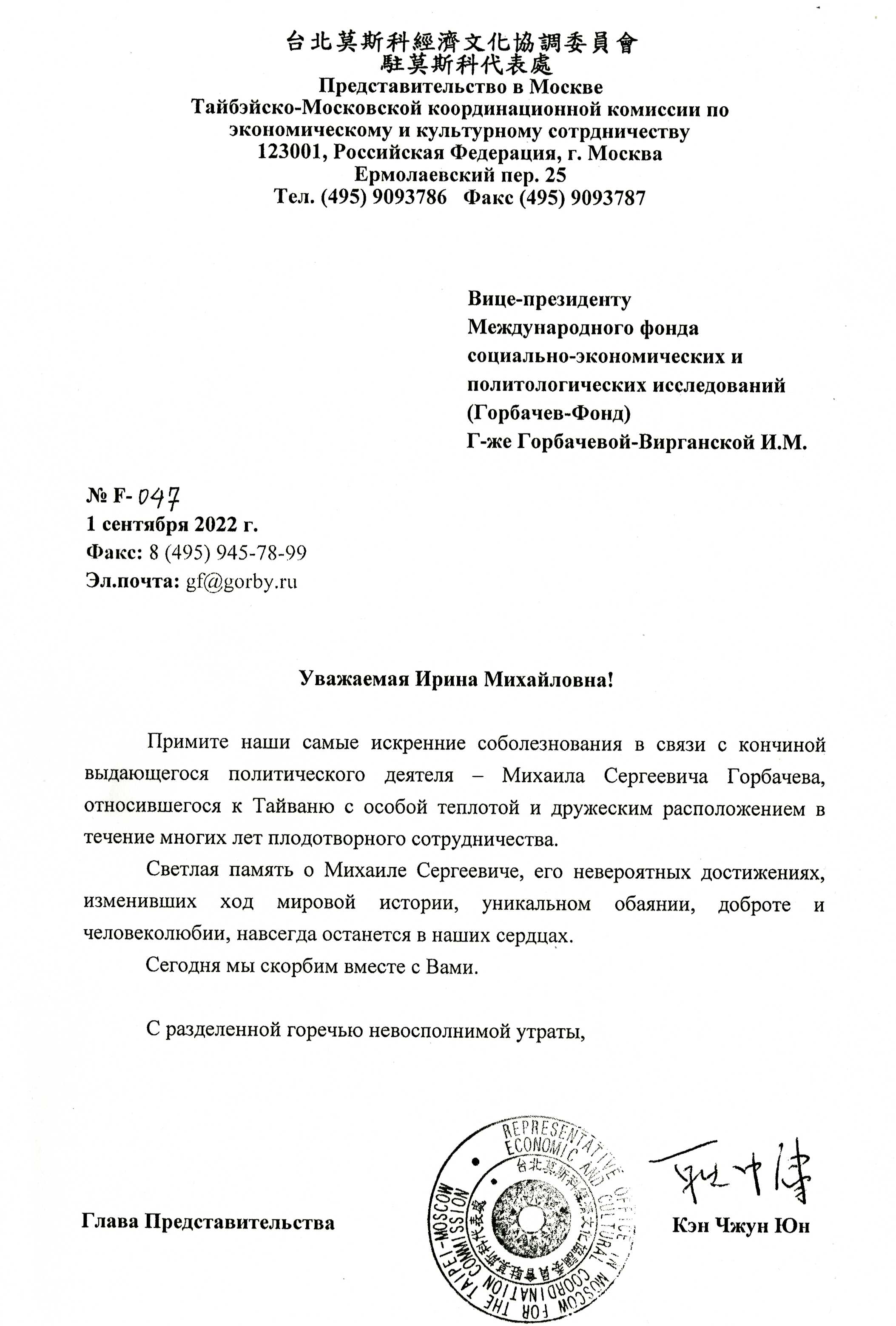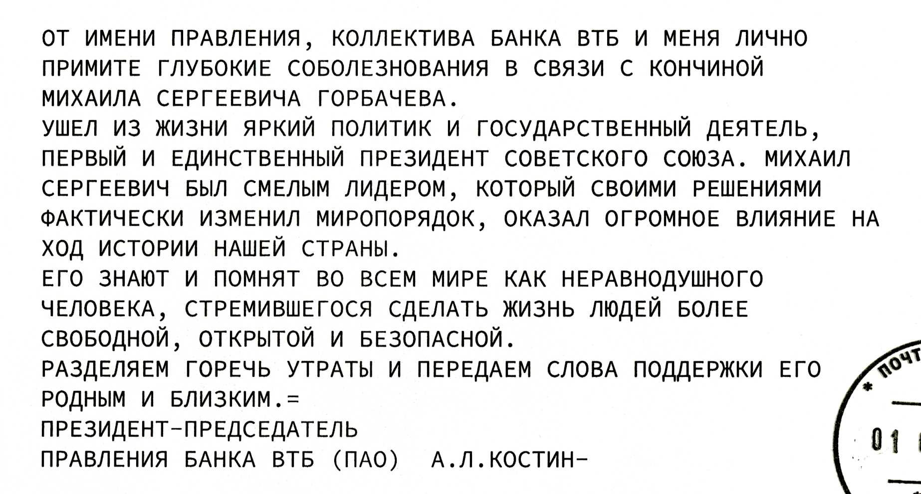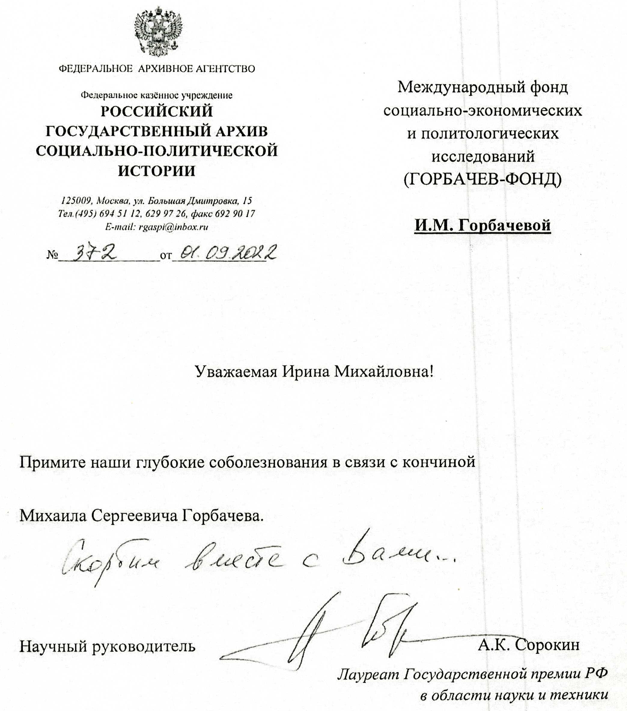 Уважаемая госпожа Вирганская, Прошу принять мои искренние соболезнования в связи с кончиной Вашего отца, господина Михаила Сергеевича Горбачева. С наилучшими пожеланиями,