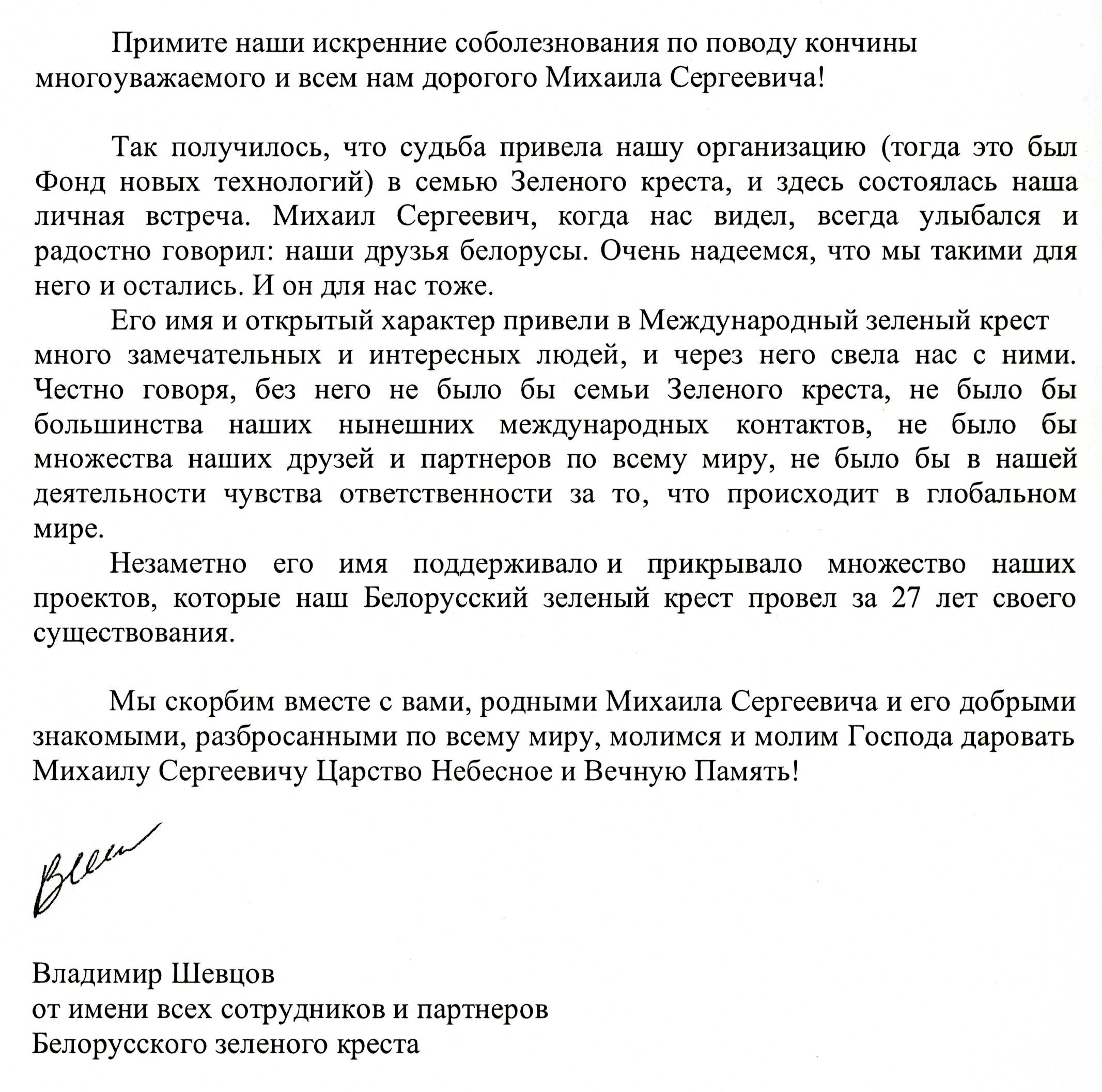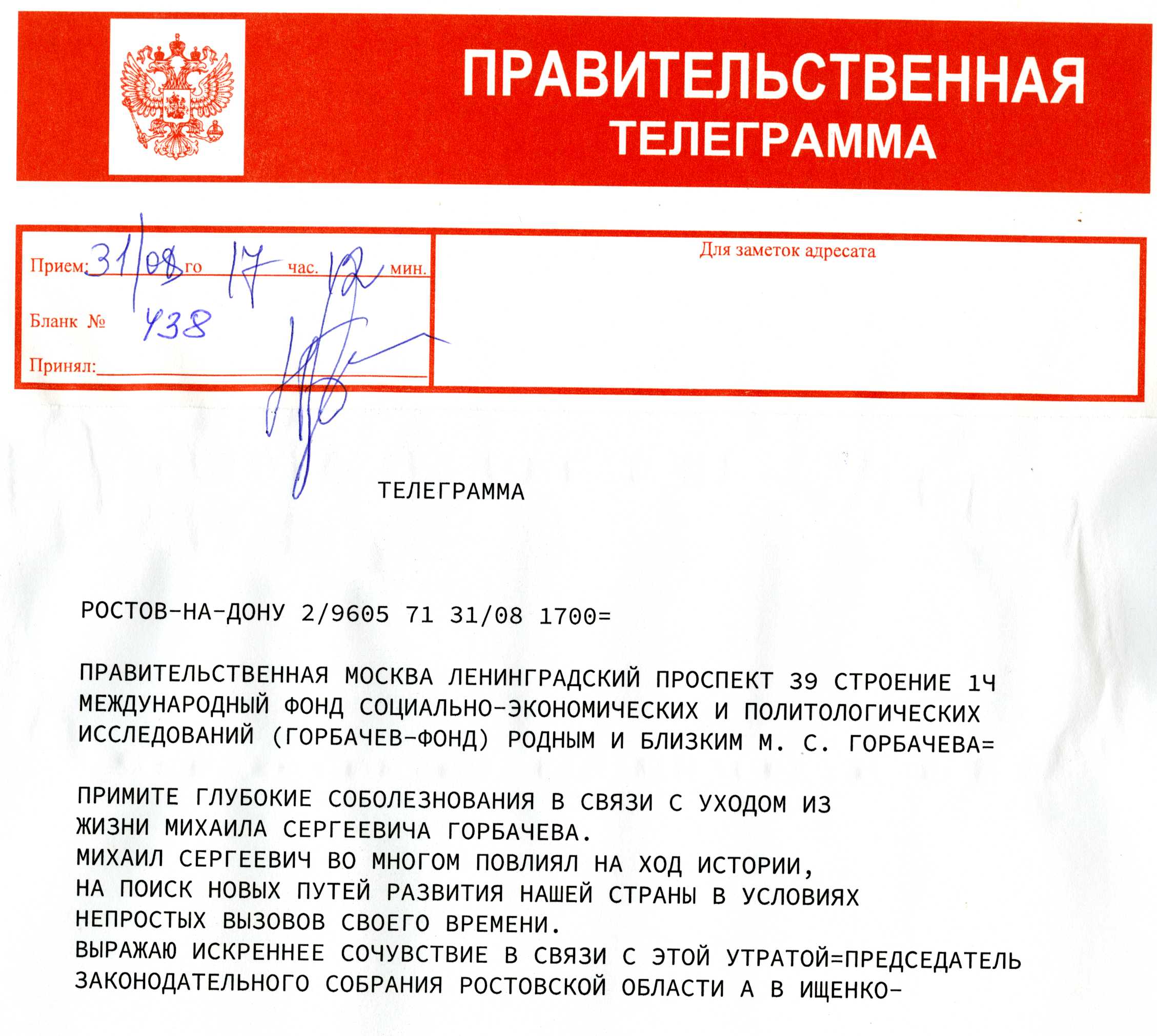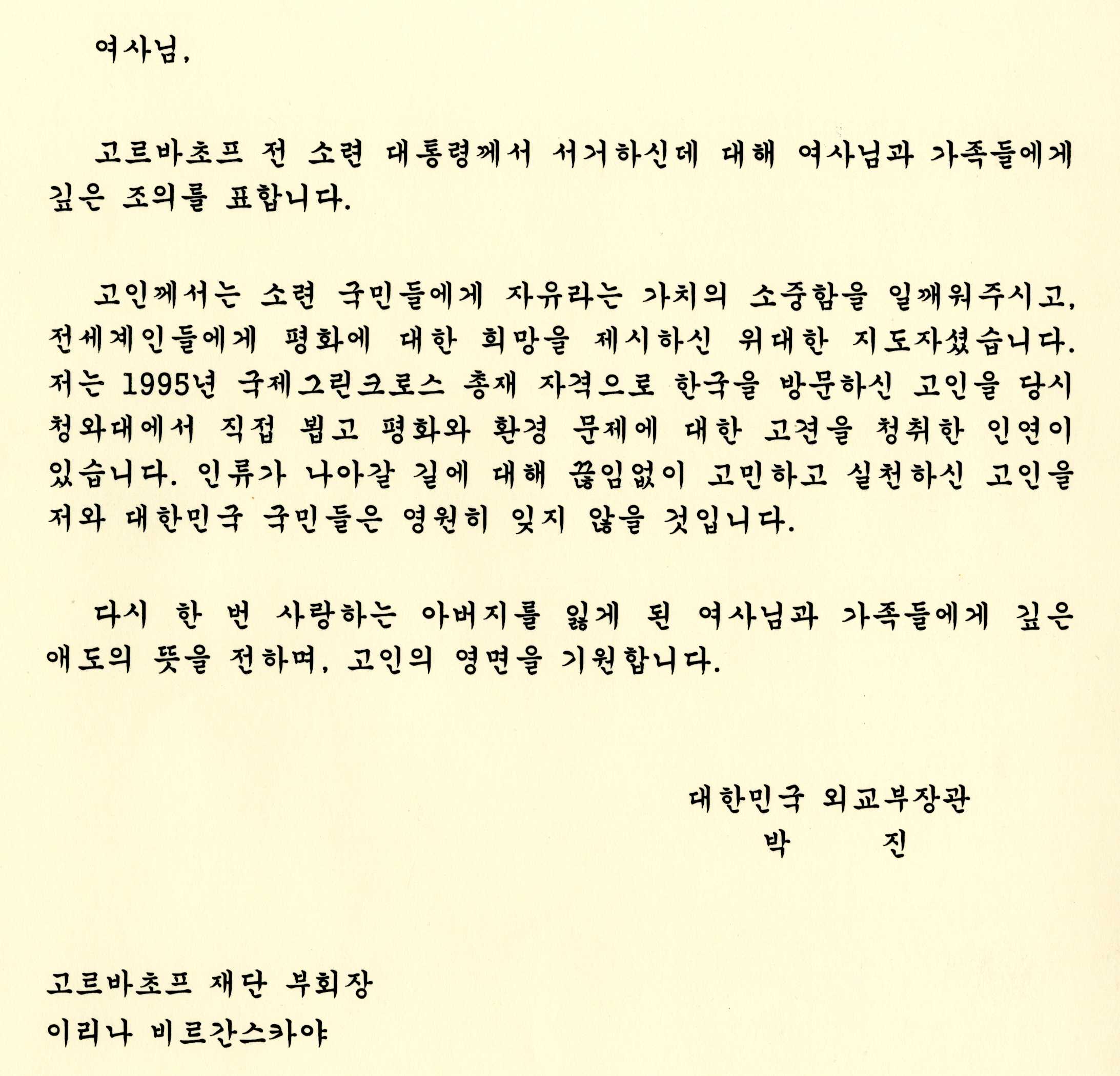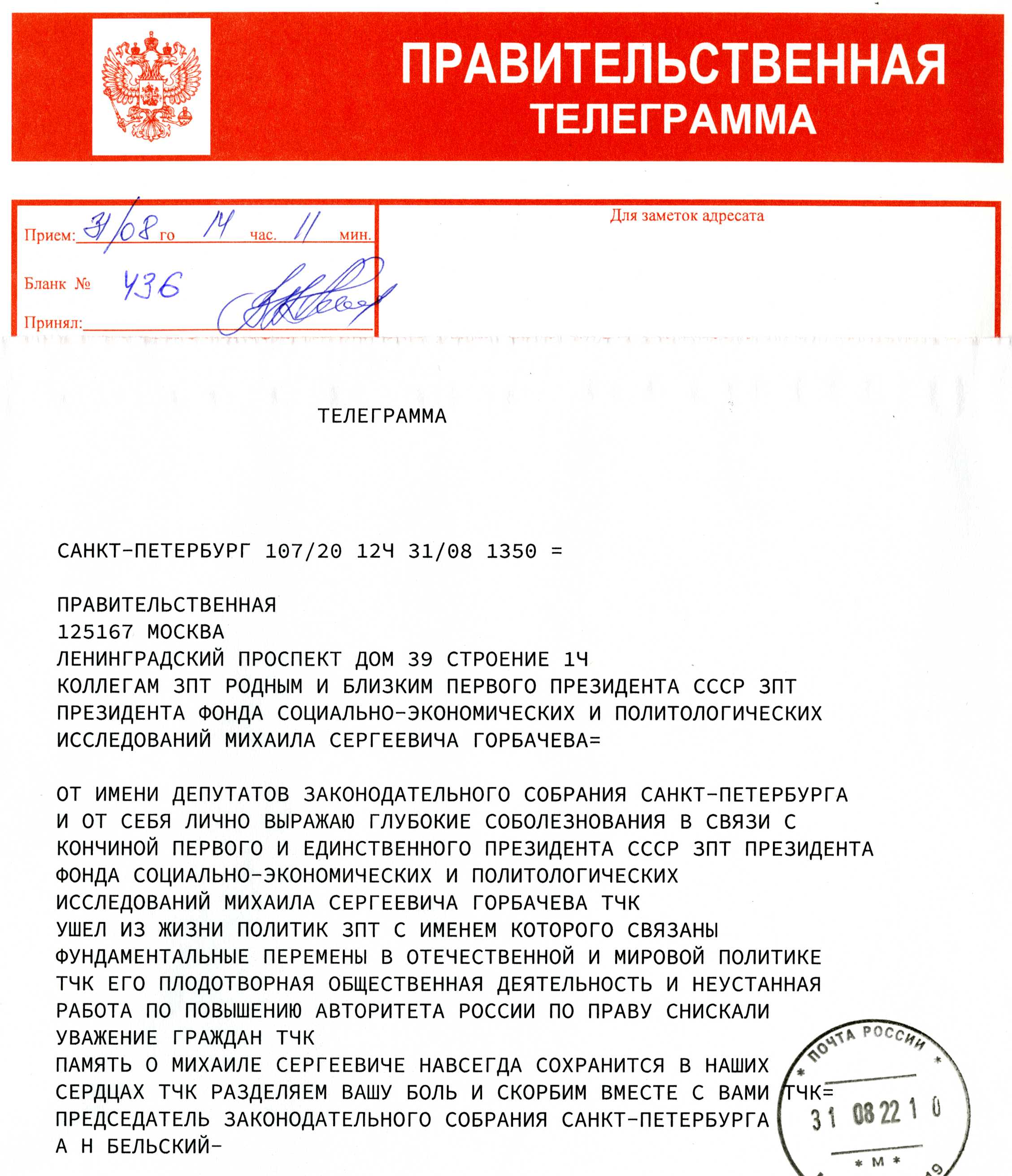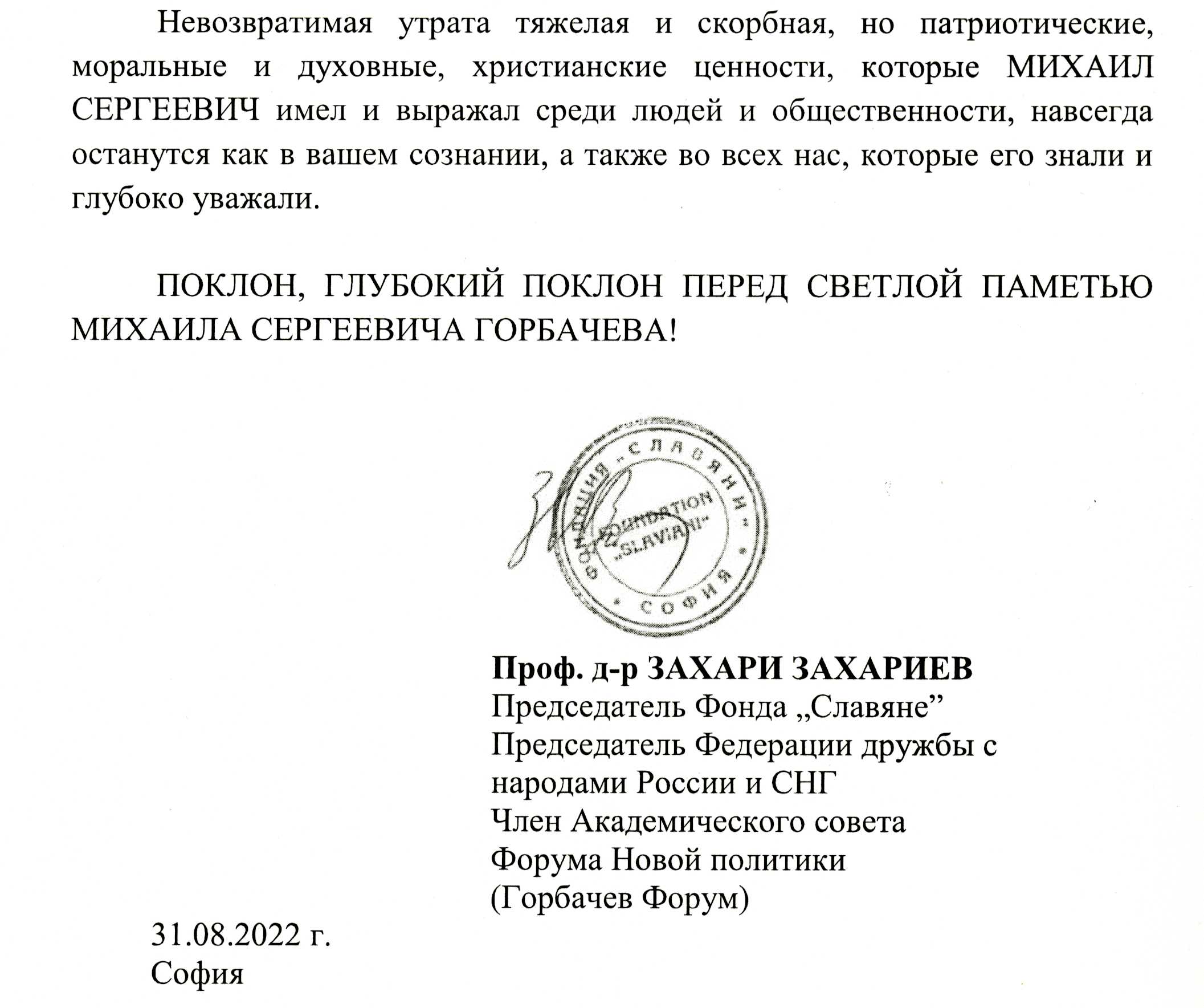 Уважаемая госпожа Вирганская, Прошу принять мои искренние соболезнования в связи с кончиной Вашего отца, господина Михаила Сергеевича Горбачева. С наилучшими пожеланиями,