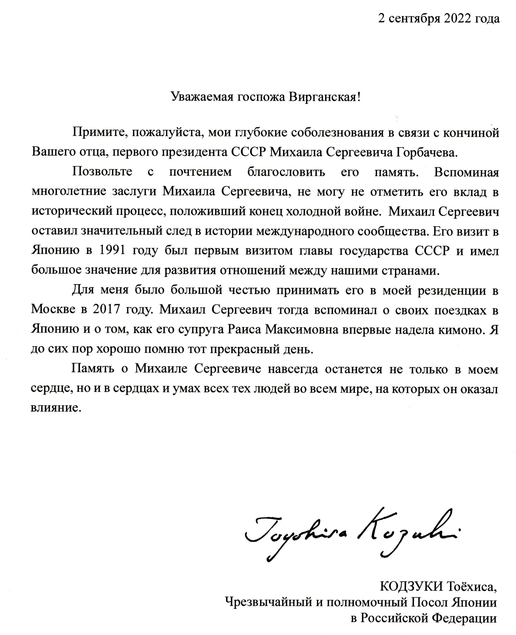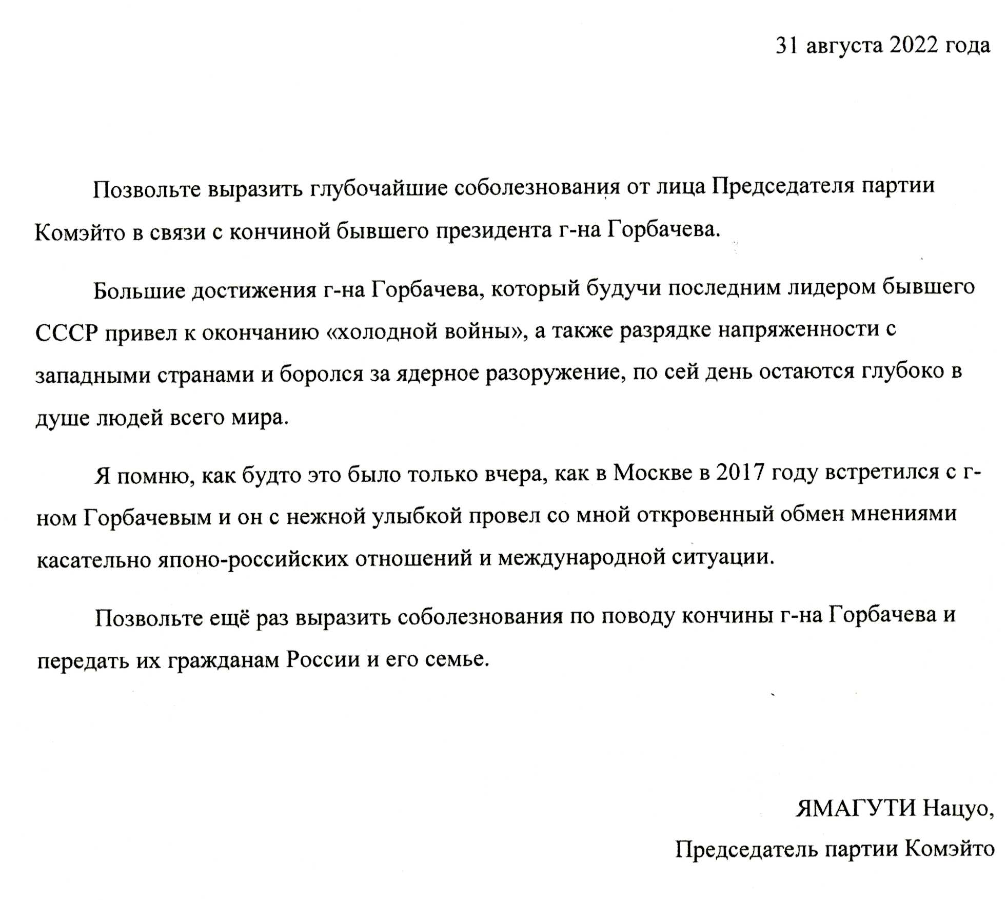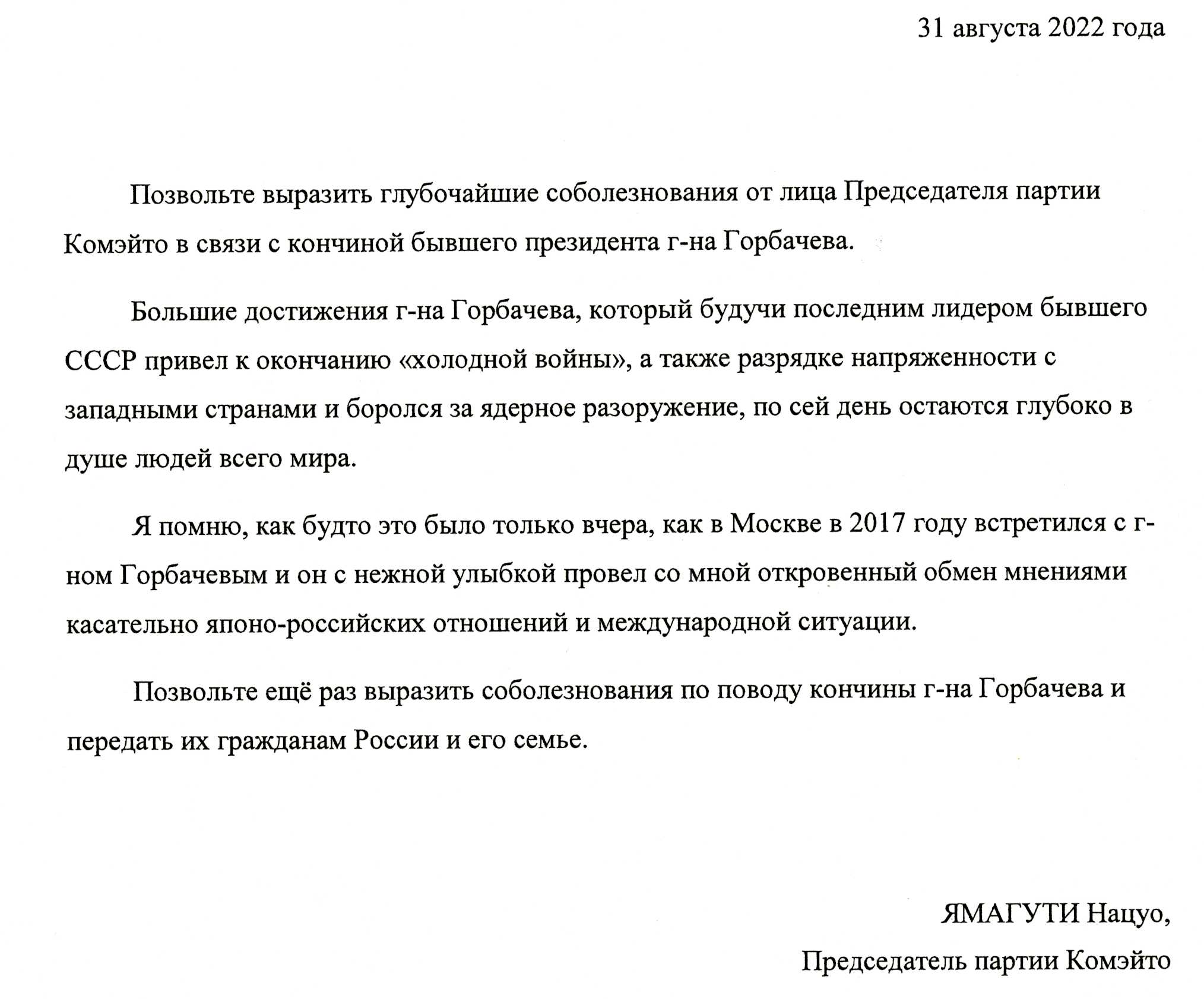 Заявление премьер-министра Японии Получив известие о кончине бывшего президента СССР Михаила Горбачева, от имени правительства и народа Японии я хотел бы вознести искренние молитвы о упокоении его души. Хумио Кисида