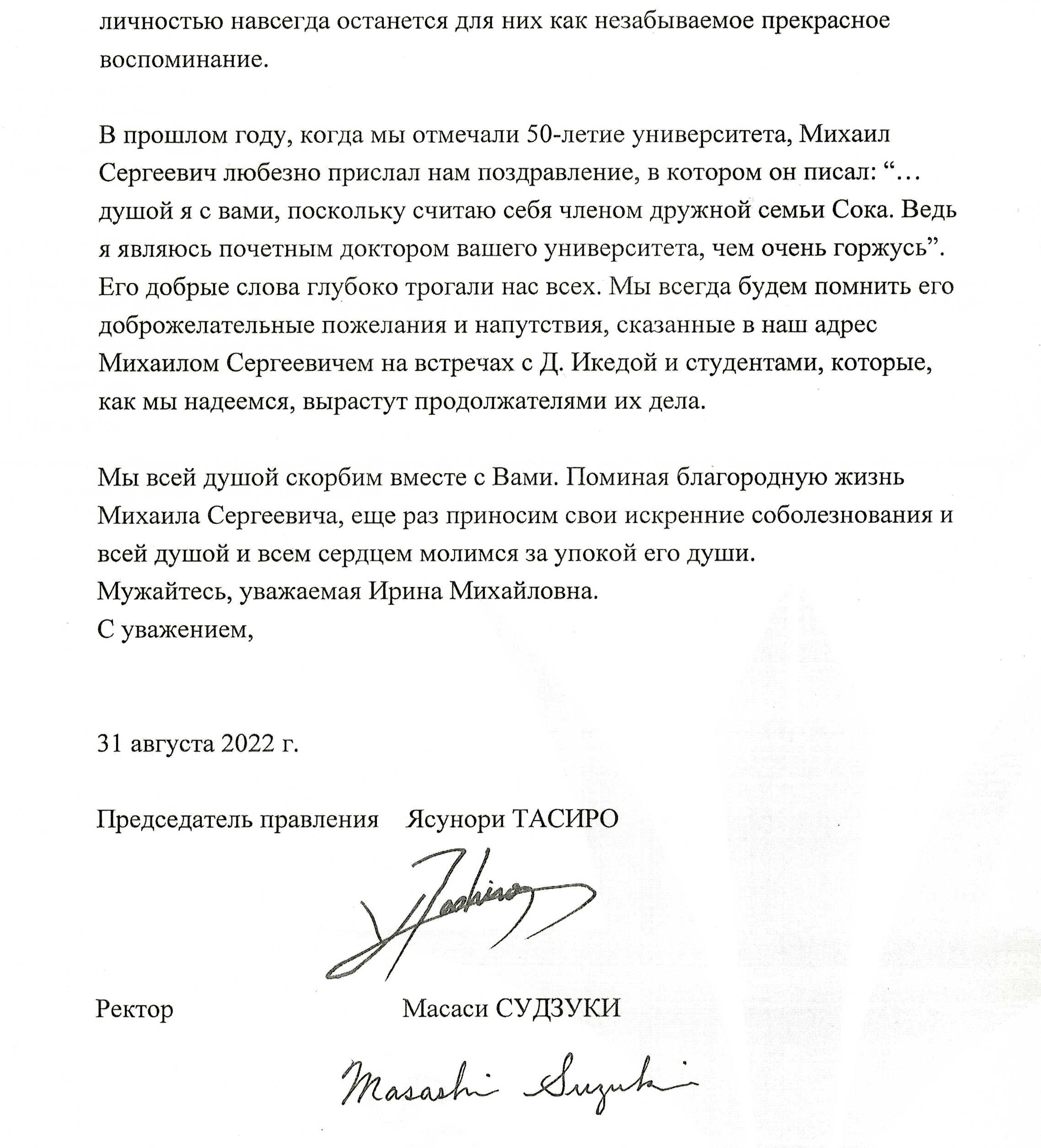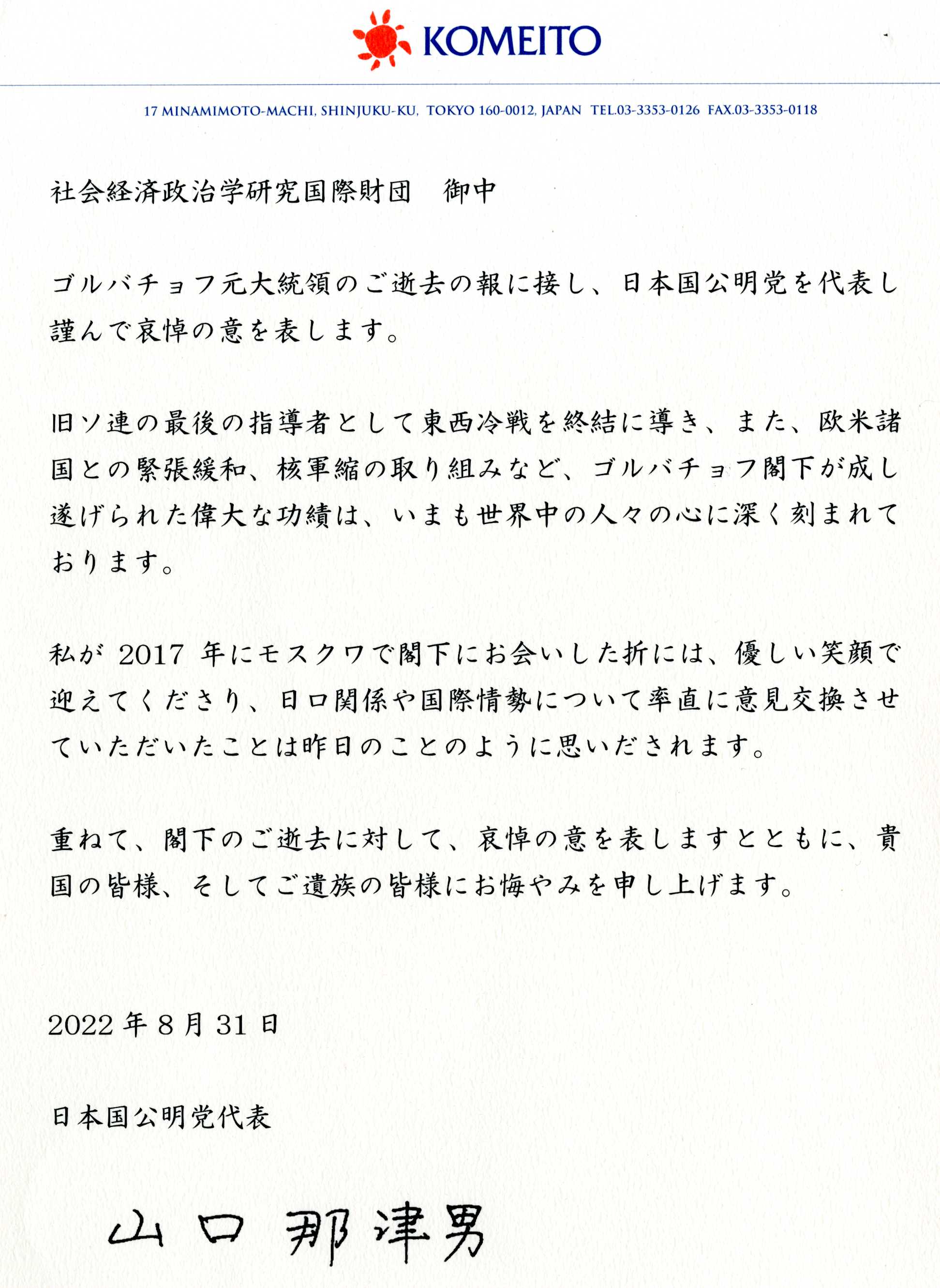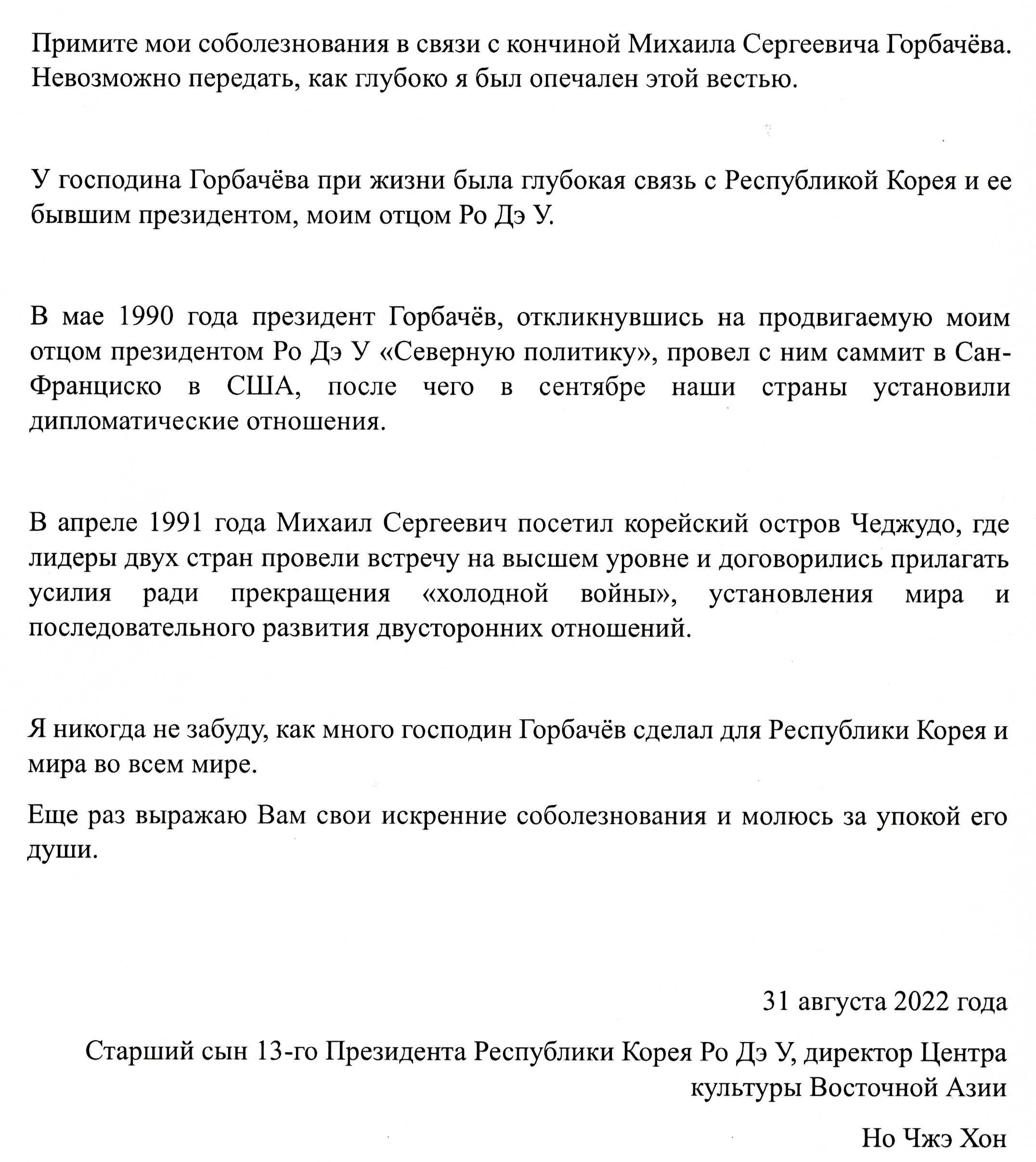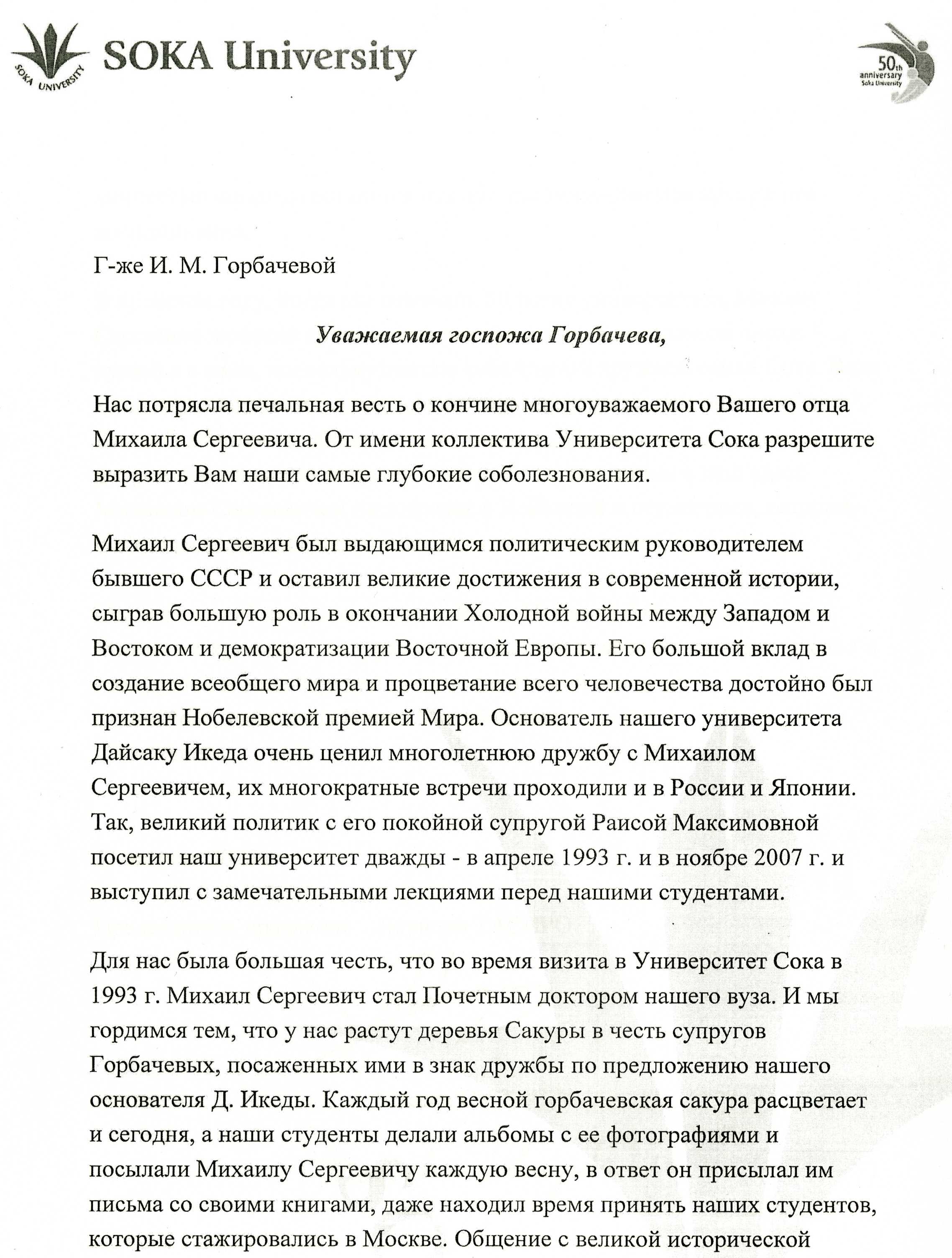 Заявление премьер-министра Японии Получив известие о кончине бывшего президента СССР Михаила Горбачева, от имени правительства и народа Японии я хотел бы вознести искренние молитвы о упокоении его души. Хумио Кисида