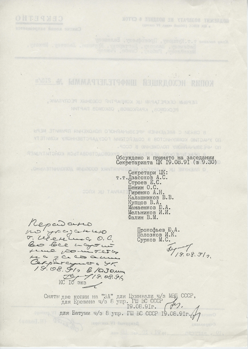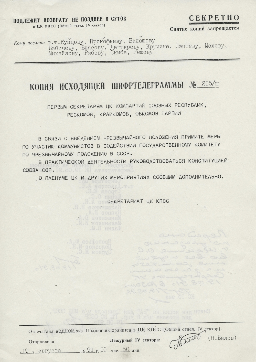 10.50. После заседания Секретариата ЦК КПСС региональным руководителям партии была разослана шифрограмма, призывающая оказать содействие ГКЧП.