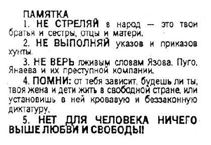 Москва 6.00 /PF/. Министр обороны СССР Д. Язов собрал на совещание командующих войсками военных округов. Инструкция сводилась к следующему: обеспечение порядка в зависимости от обстановки - усилить охрану военных объектов. Войска приведены в боевую готовность. "Об остальном, - сказал министр, - узнаете из сообщений радио и газет".
